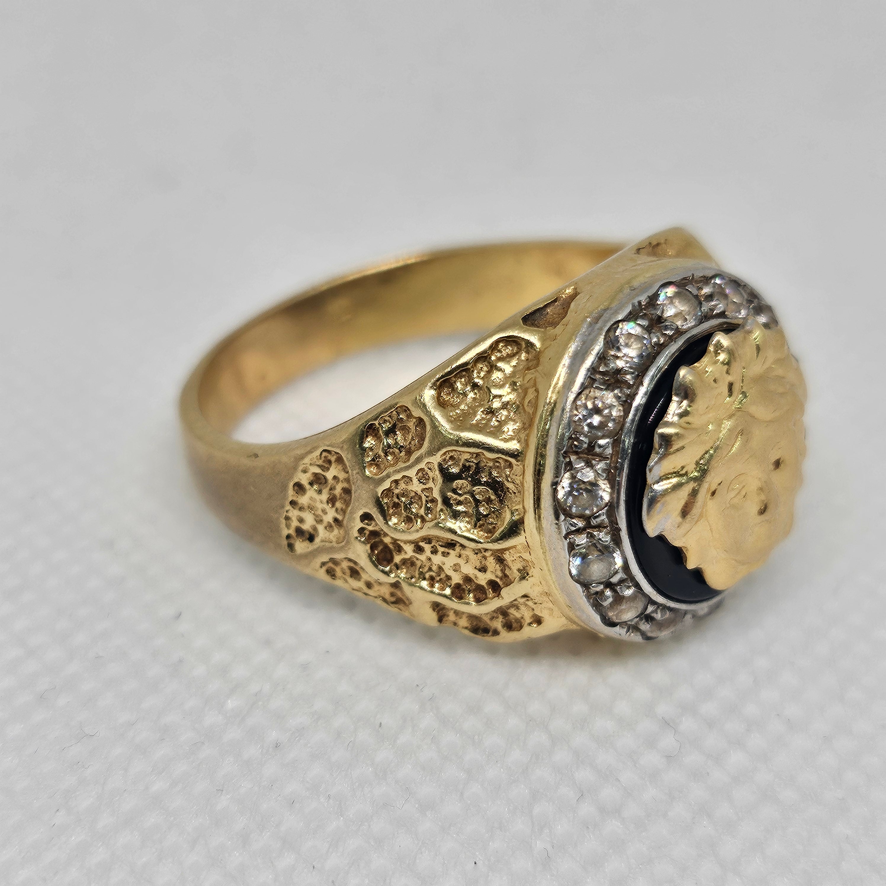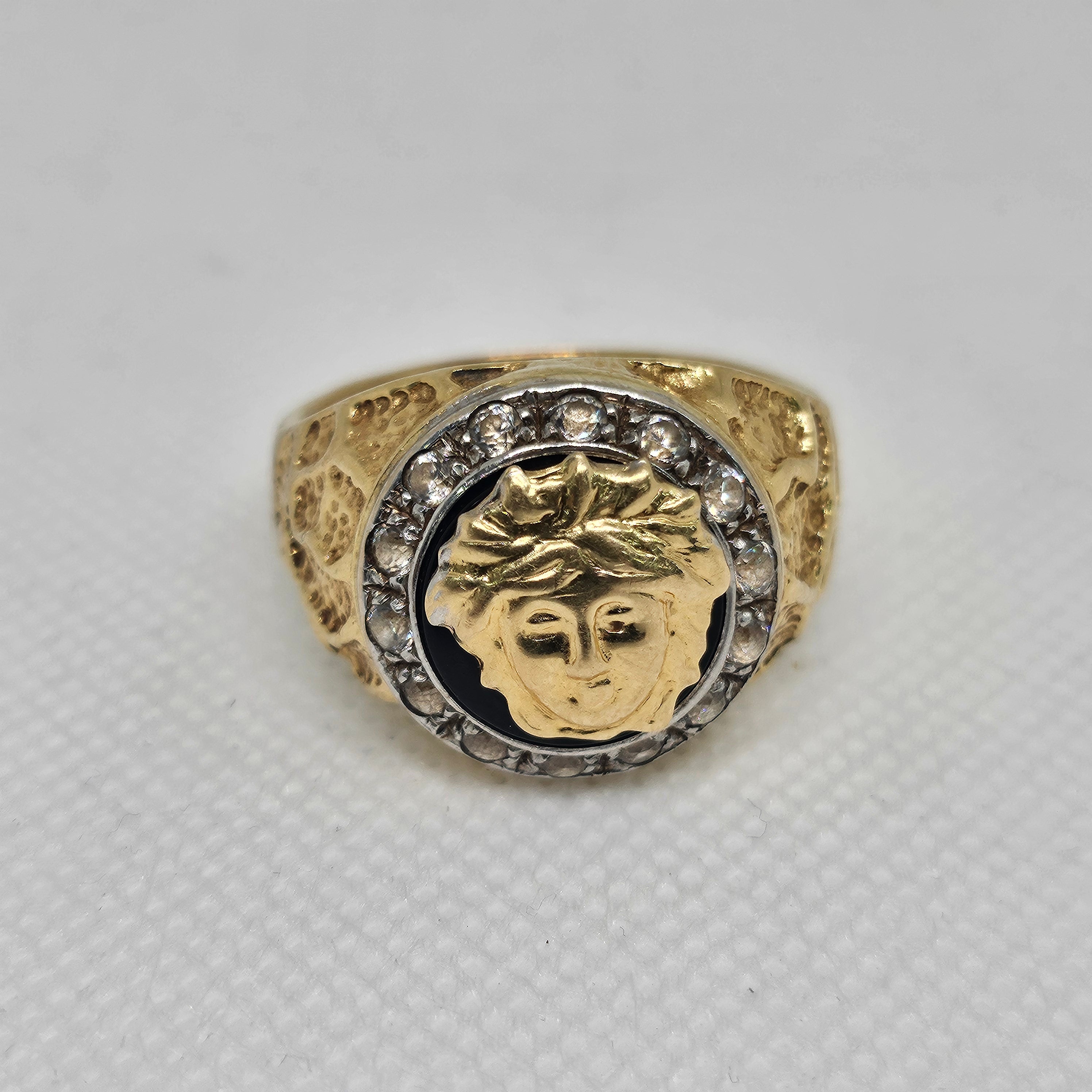 Bague de type chevalière est en or jaune 18 carats (750/1000) et porte le poinçon tête d’aigle. Elle est ornée d’un oxyde de zirconium, pèse 17,78 grammes et correspond à une taille 72. L’ensemble est présenté en très bon état.