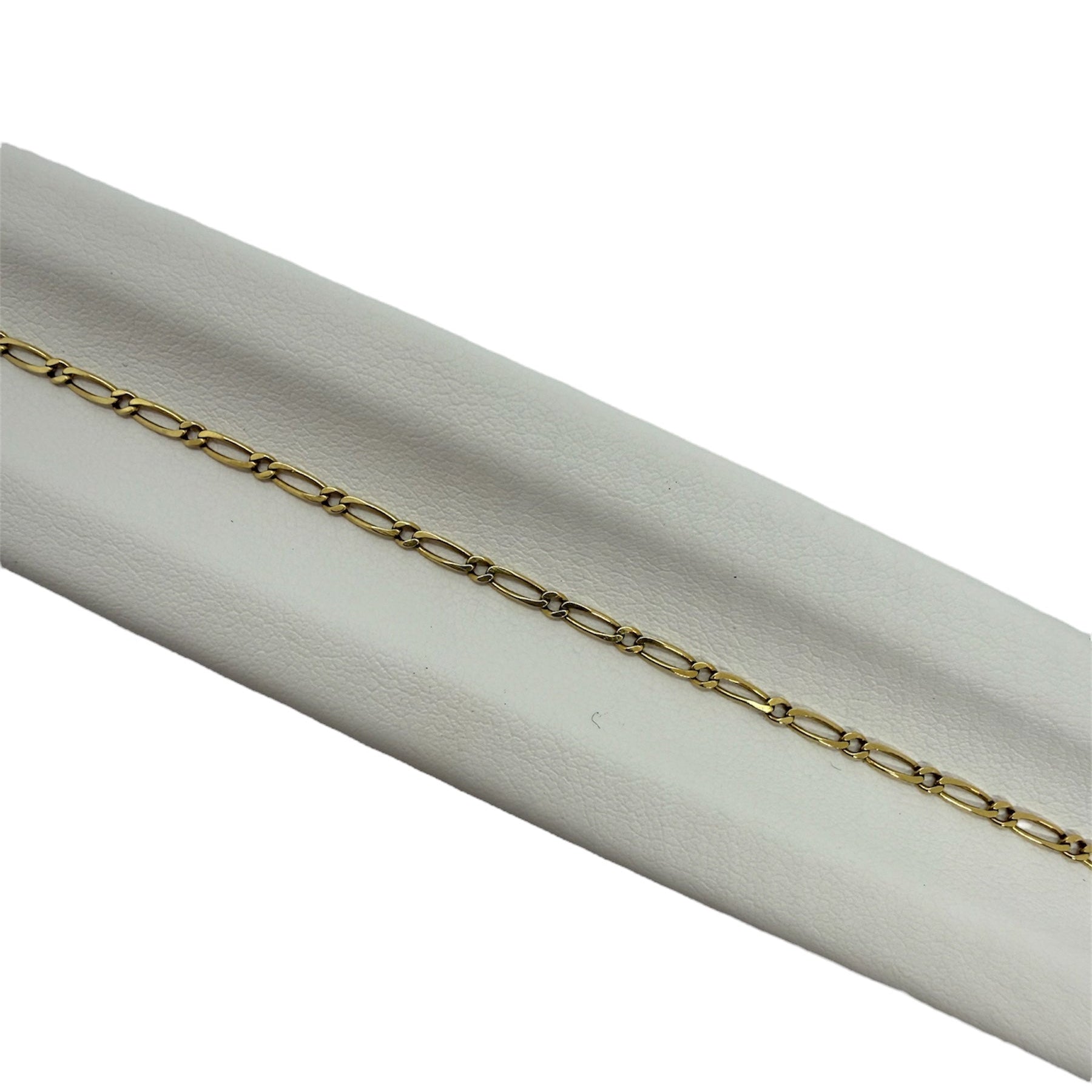 Bracelet à maillons de type maille cheval en or jaune 18 carats (750/1000), sans poinçon. Il pèse 2,31 g et mesure 29 cm de longueur, avec une largeur et une épaisseur d’environ 1 mm. Fermoir mousqueton. L’ensemble est en très bon état.