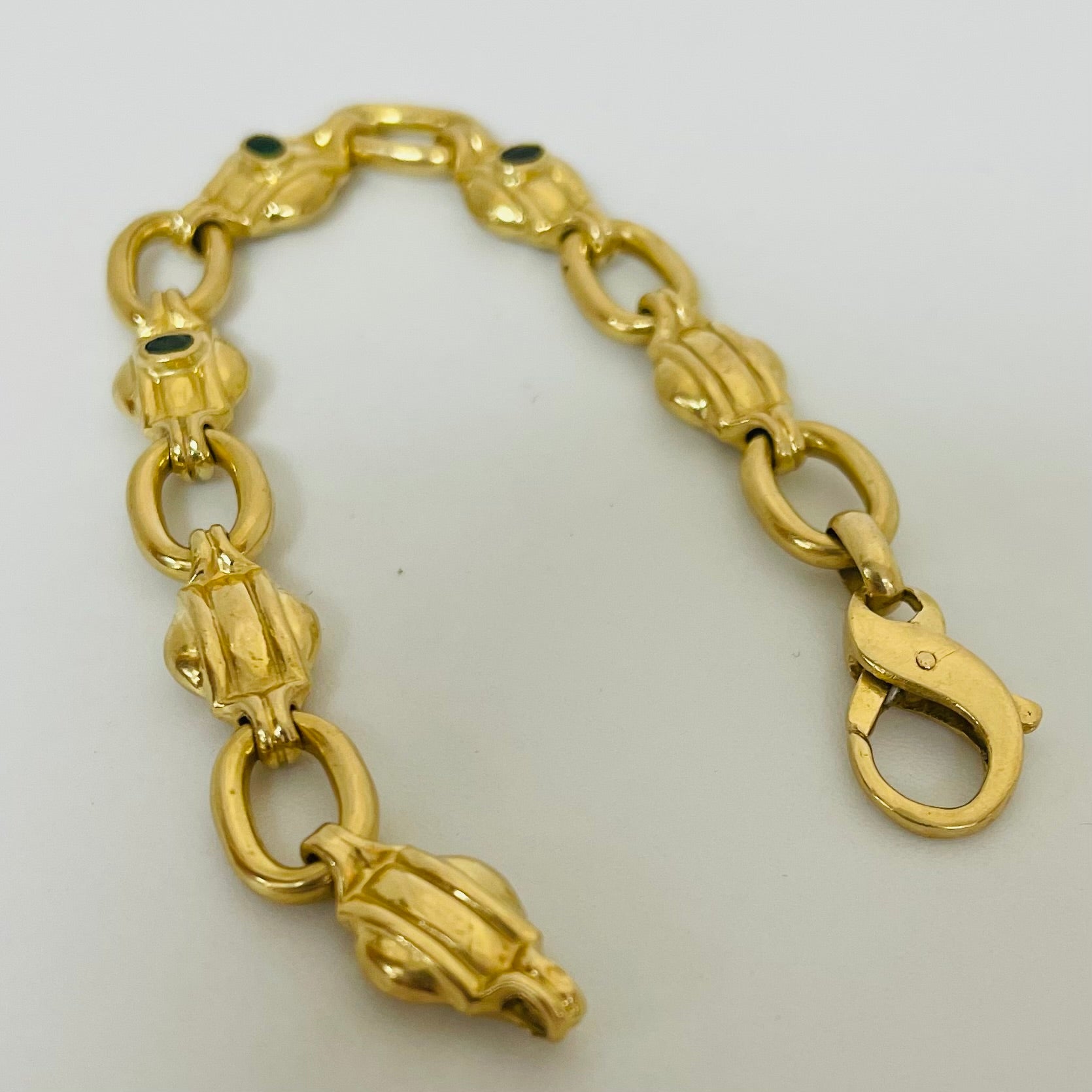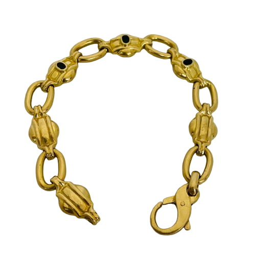 Bracelet maillon en or jaune 18 carats (750/1000), poinçonné, d’un poids de 14,25 grammes. Il mesure 19 cm de longueur, 1 cm de largeur et 0,5 cm d’épaisseur. Ce modèle à maille originale est orné de trois émeraudes et équipé d’un fermoir mousqueton. Proposé en très bon état général.