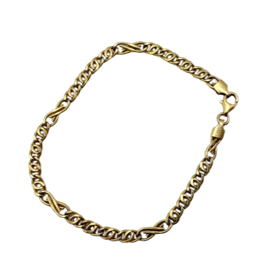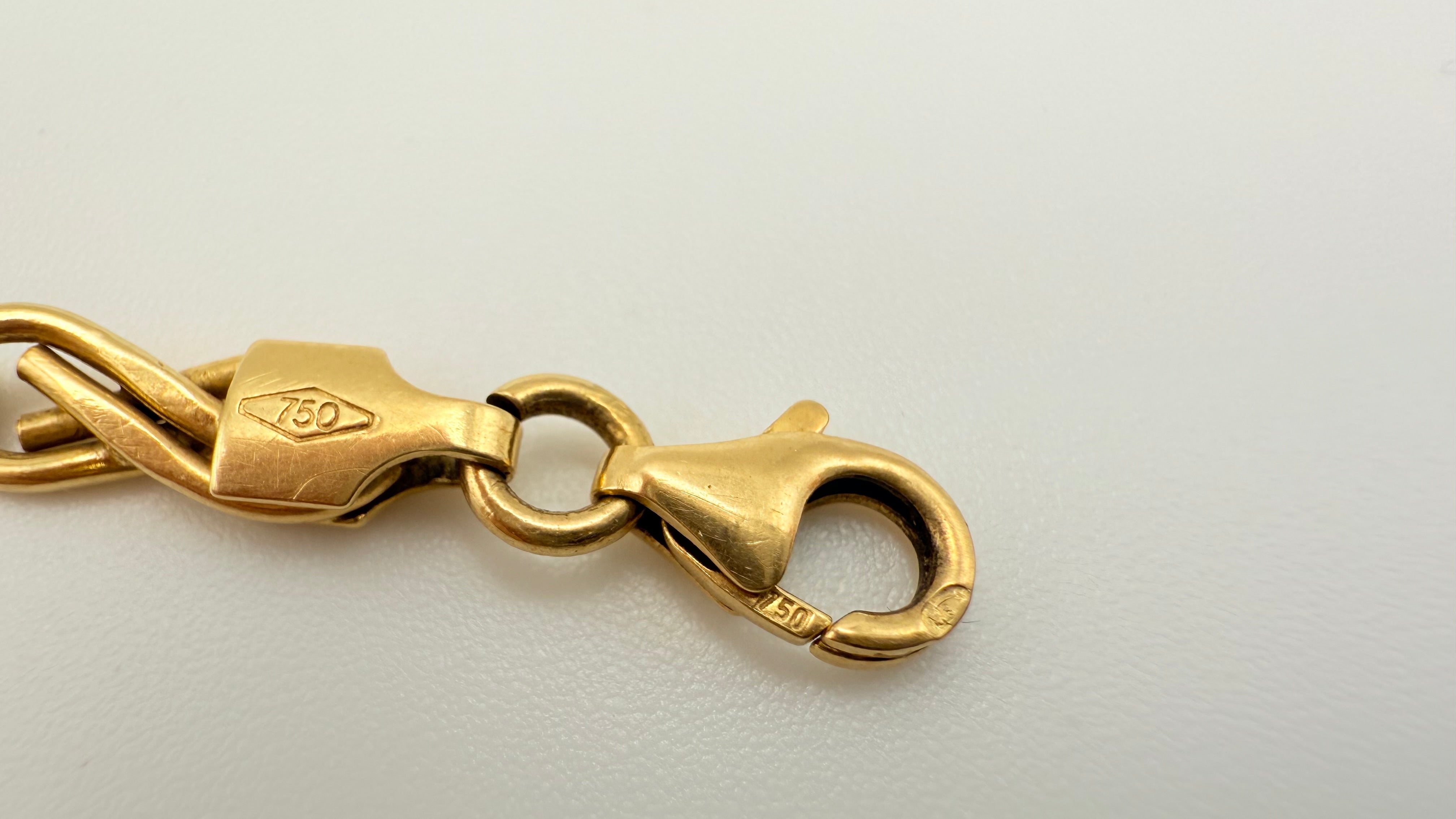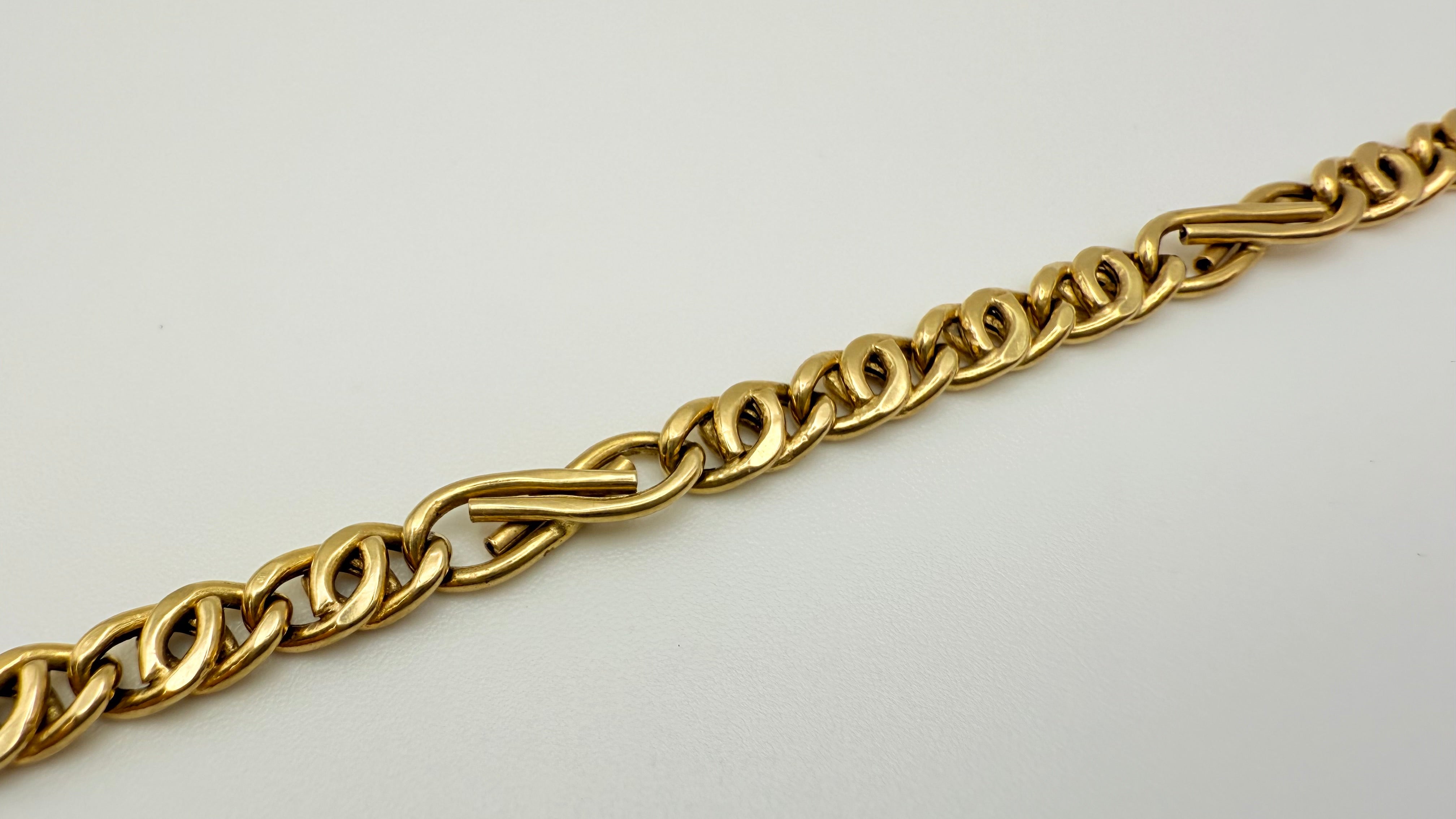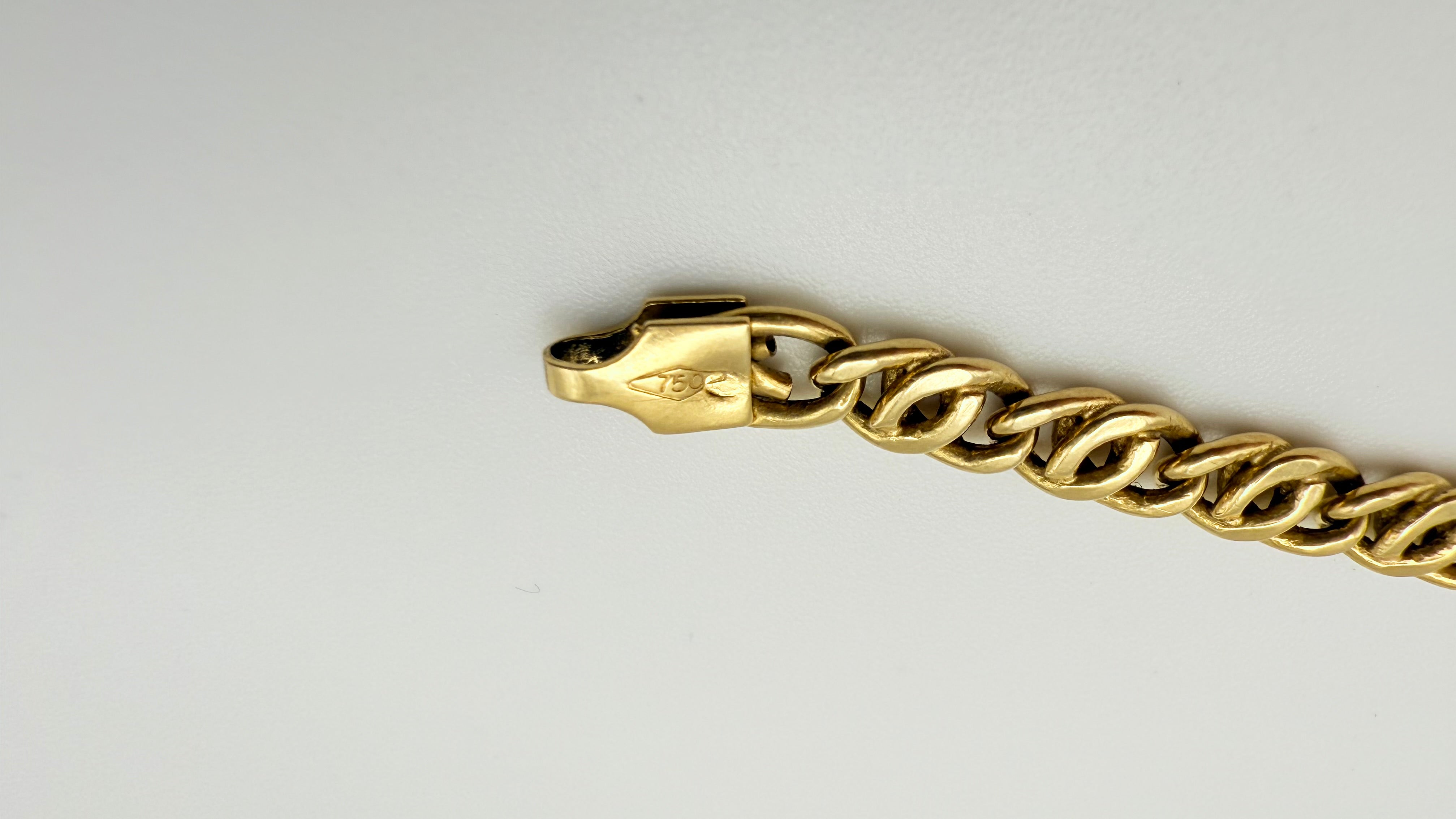 Bracelet de type gourmette est réalisé en or jaune 18K (750/1000) avec une maille fantaisie et porte le poinçon 750. Il mesure 20 cm de long, avec une largeur de 0,5 cm et une épaisseur de 0,2 cm, pour un poids de 5,28 grammes. Dépourvu de pierres, il est équipé d’un fermoir mousqueton et se trouve en très bon état.