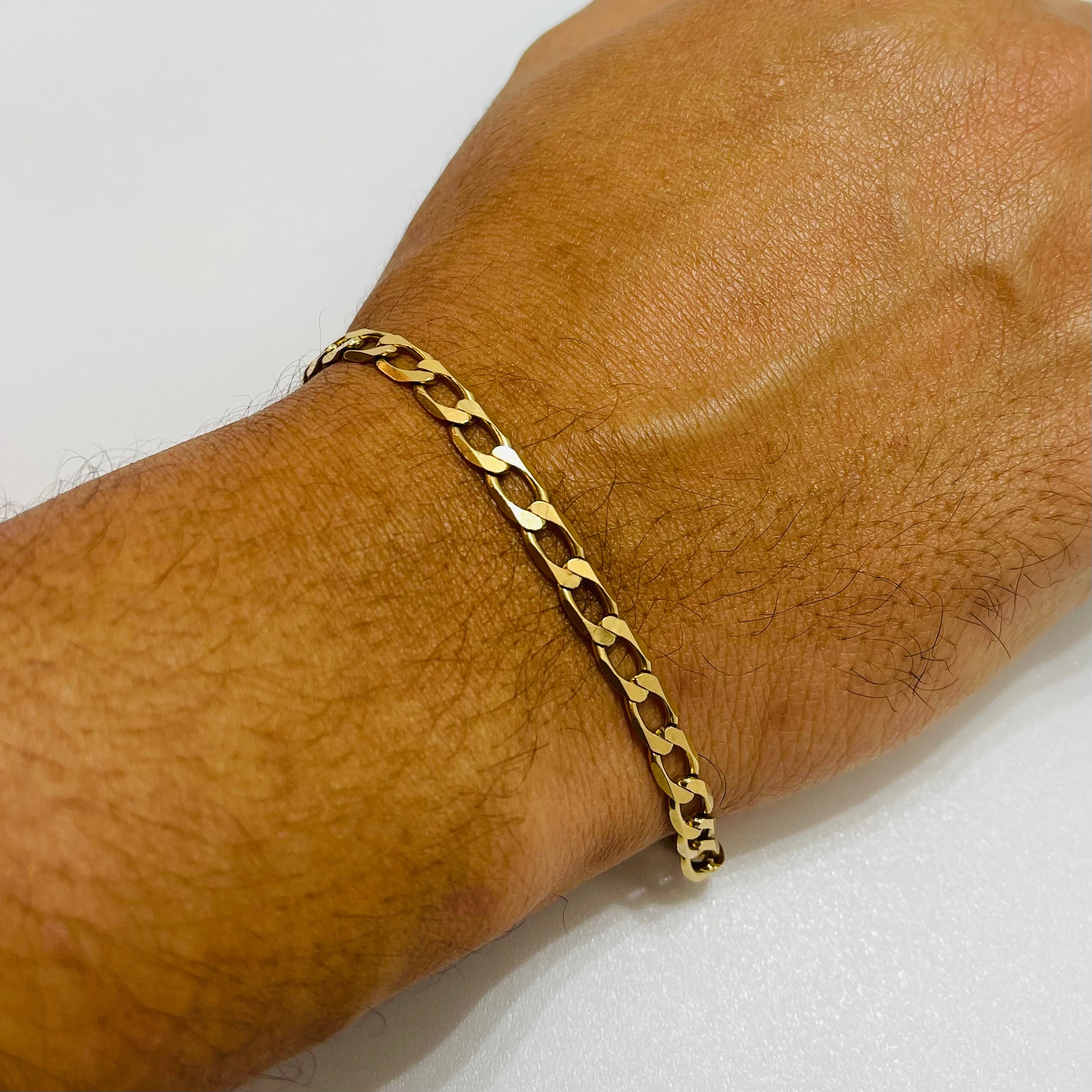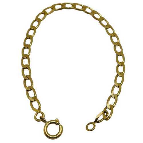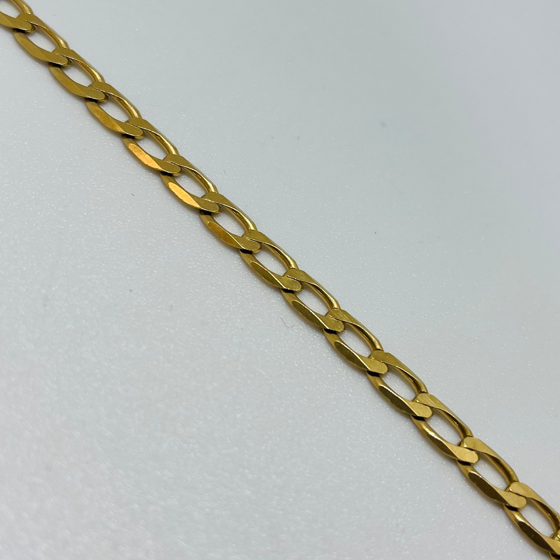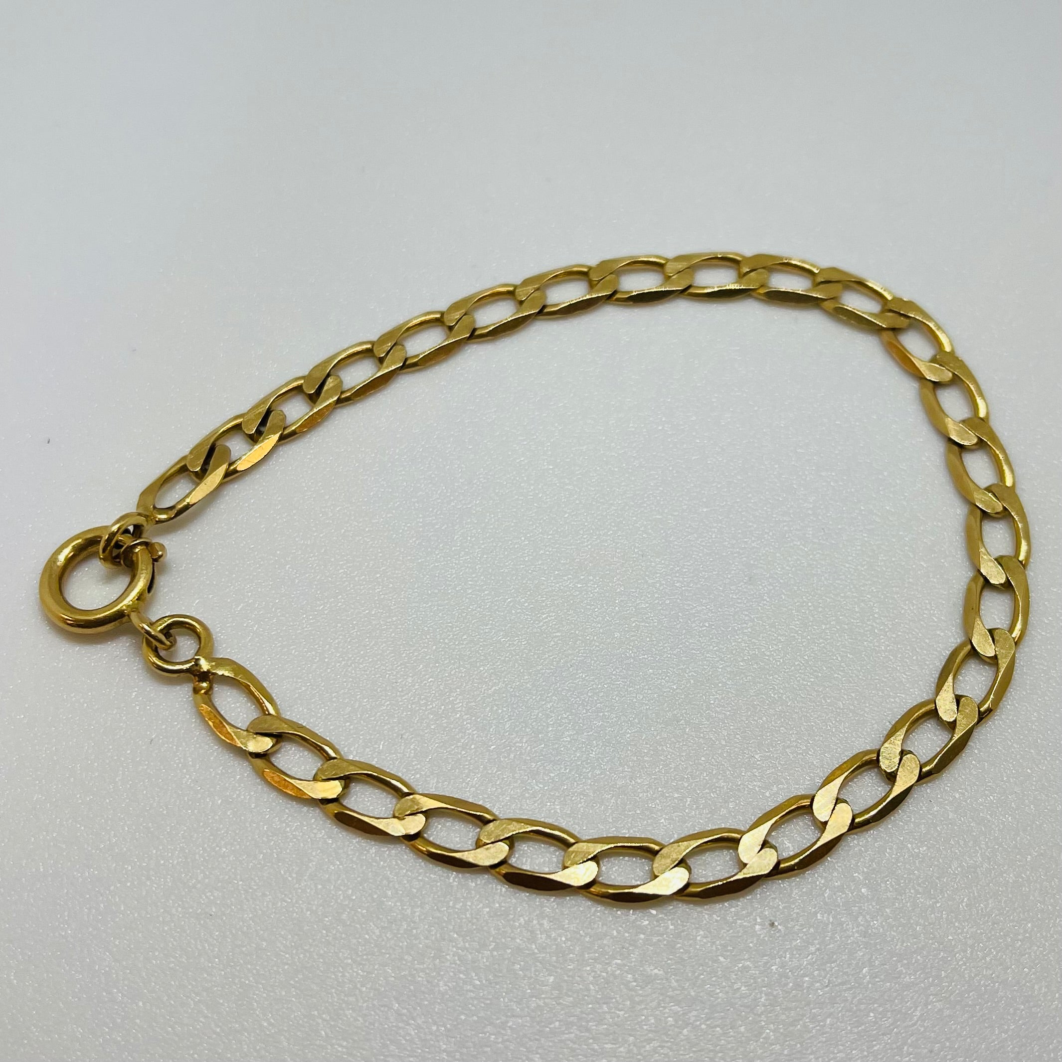 Gourmette en or jaune 18 carats (750/1000), poinçonnée 750 et tête d’aigle, en maille gourmette. Elle mesure 20,5 cm de long, avec une largeur de 4 mm et une épaisseur de 2 mm. Fermoir à anneau ressort. Modèle sans pierres, présenté en très bon état général.