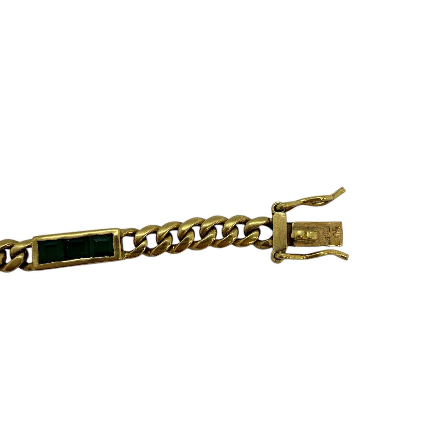 Gourmette en or jaune 18 carats, maille Figaro, ornée de 9 émeraudes taille carrée (0,05 ct chacune). Fermoir à cliquet, longueur 19,5 cm. Poids : 10,07 g. Très bon état.