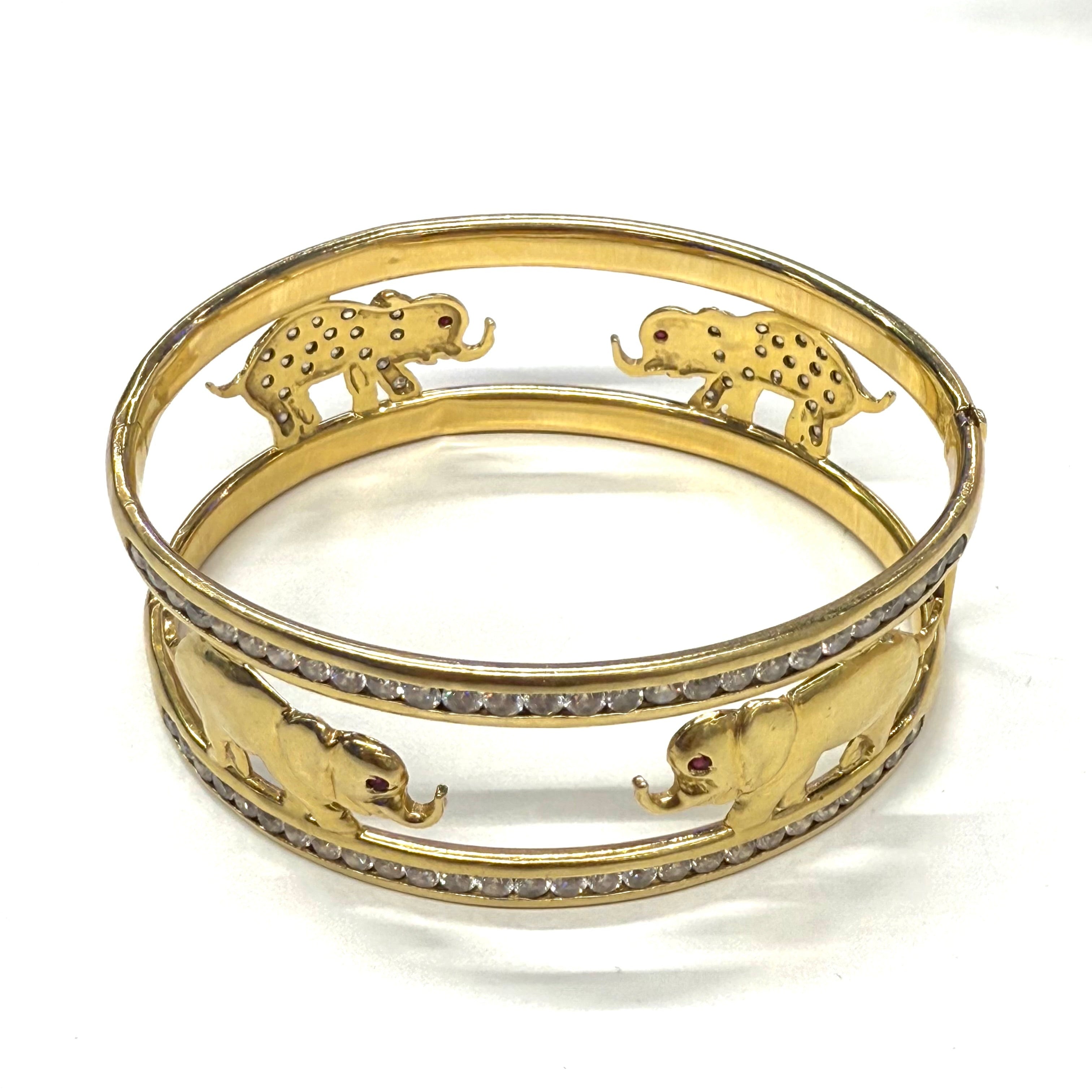 Ce superbe bracelet jonc manchette en or jaune 18 carats (750/1000), poinçonné 750, est une pièce à la fois audacieuse et raffinée. Son design imposant avec un diamètre de 6 cm et une largeur de 5,2 cm lui confère une présence remarquable au poignet. Avec un poids de 35,91 grammes, il offre solidité et élégance. Son motif éléphant, accompagné d’oxyde de zirconium, ajoute une touche de caractère et de symbolisme.