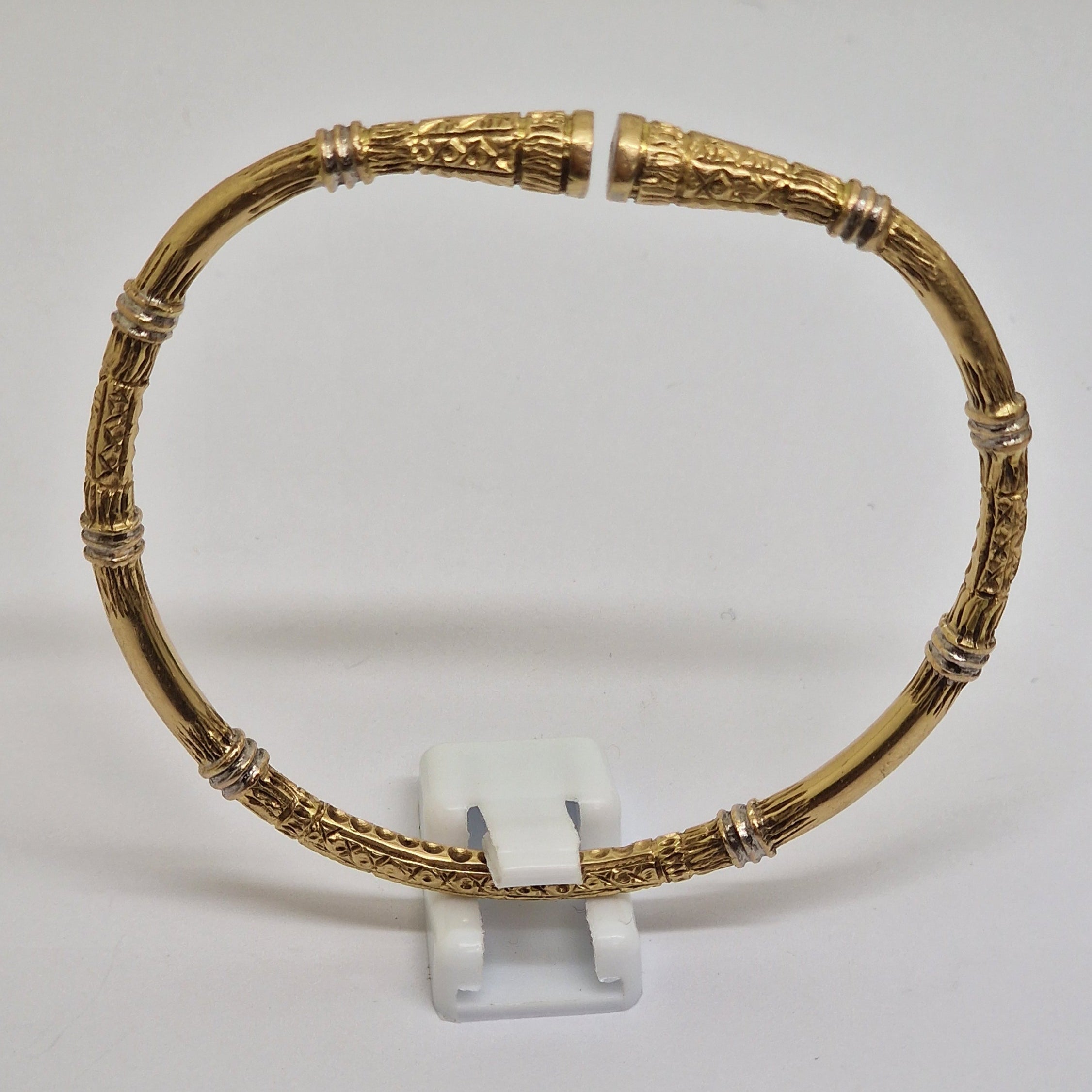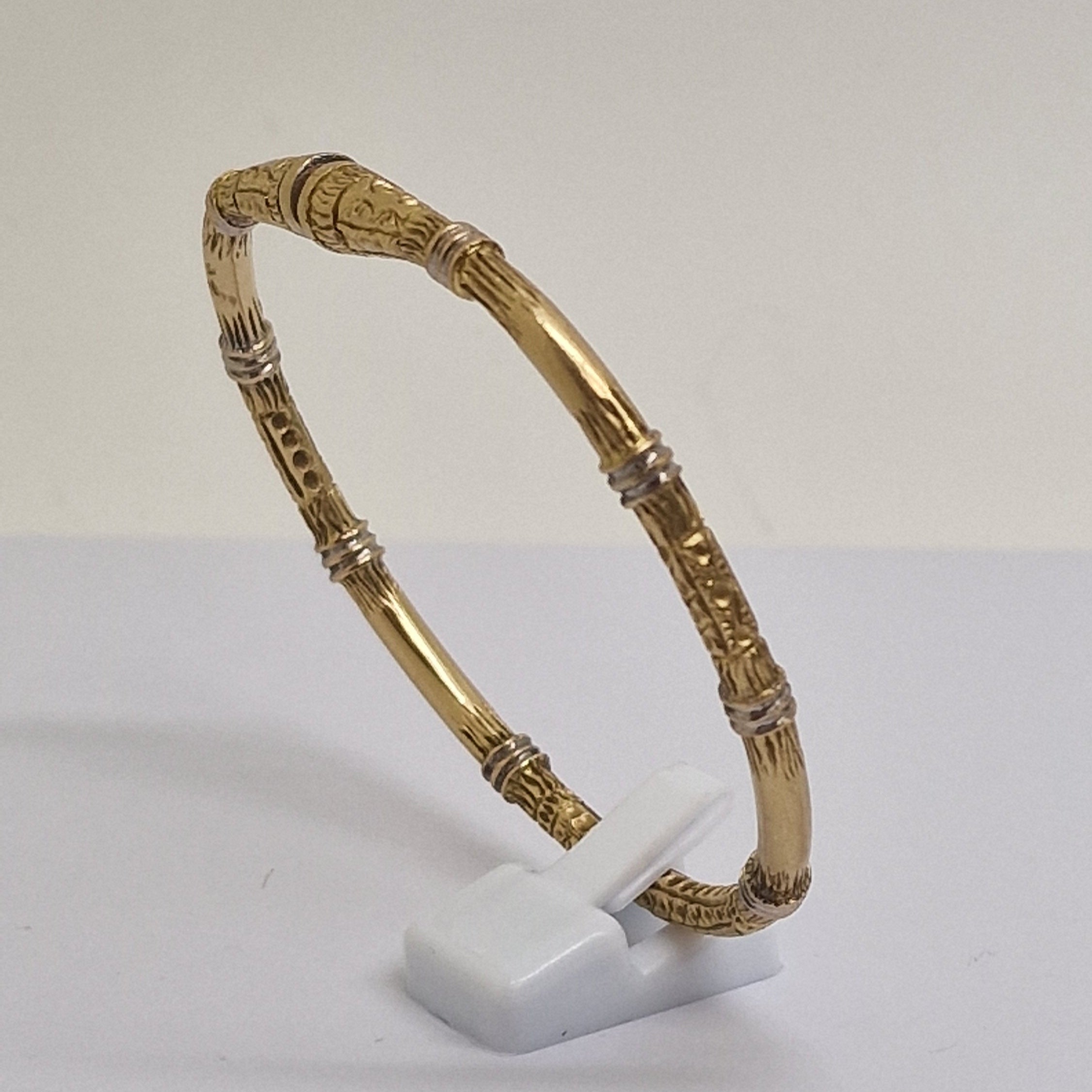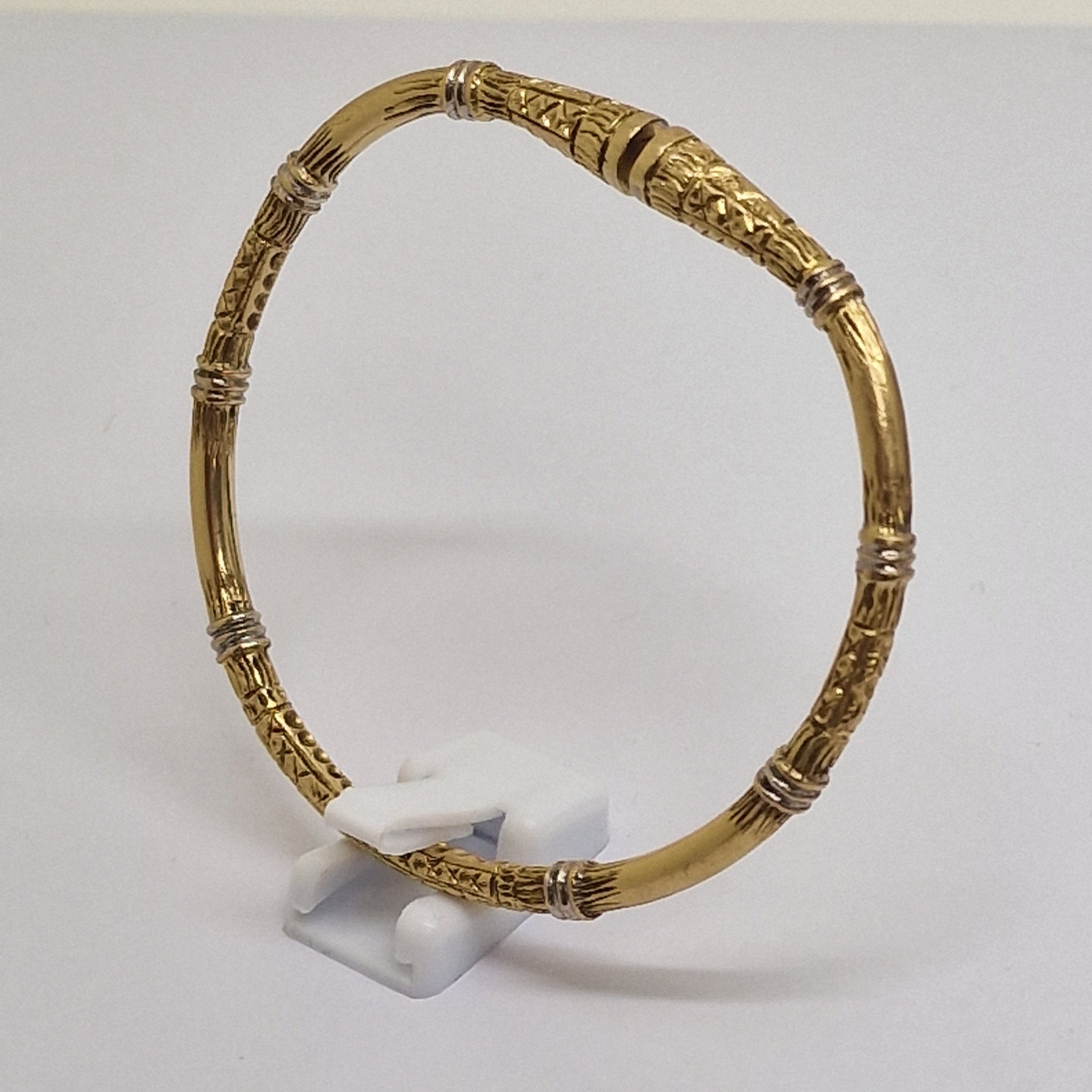 Jonc en or jaune et or blanc 18 carats (750/1000), poinçonné tête d’aigle, en très bon état. Ce bijou sans fermoir présente une forme rigide classique, avec une longueur de 6 cm, une largeur de 6,5 cm et une épaisseur de 4 mm. Son poids est de 30,98 grammes, et il ne contient aucune pierre. Un modèle élégant et intemporel, idéal pour une touche raffinée au poignet.