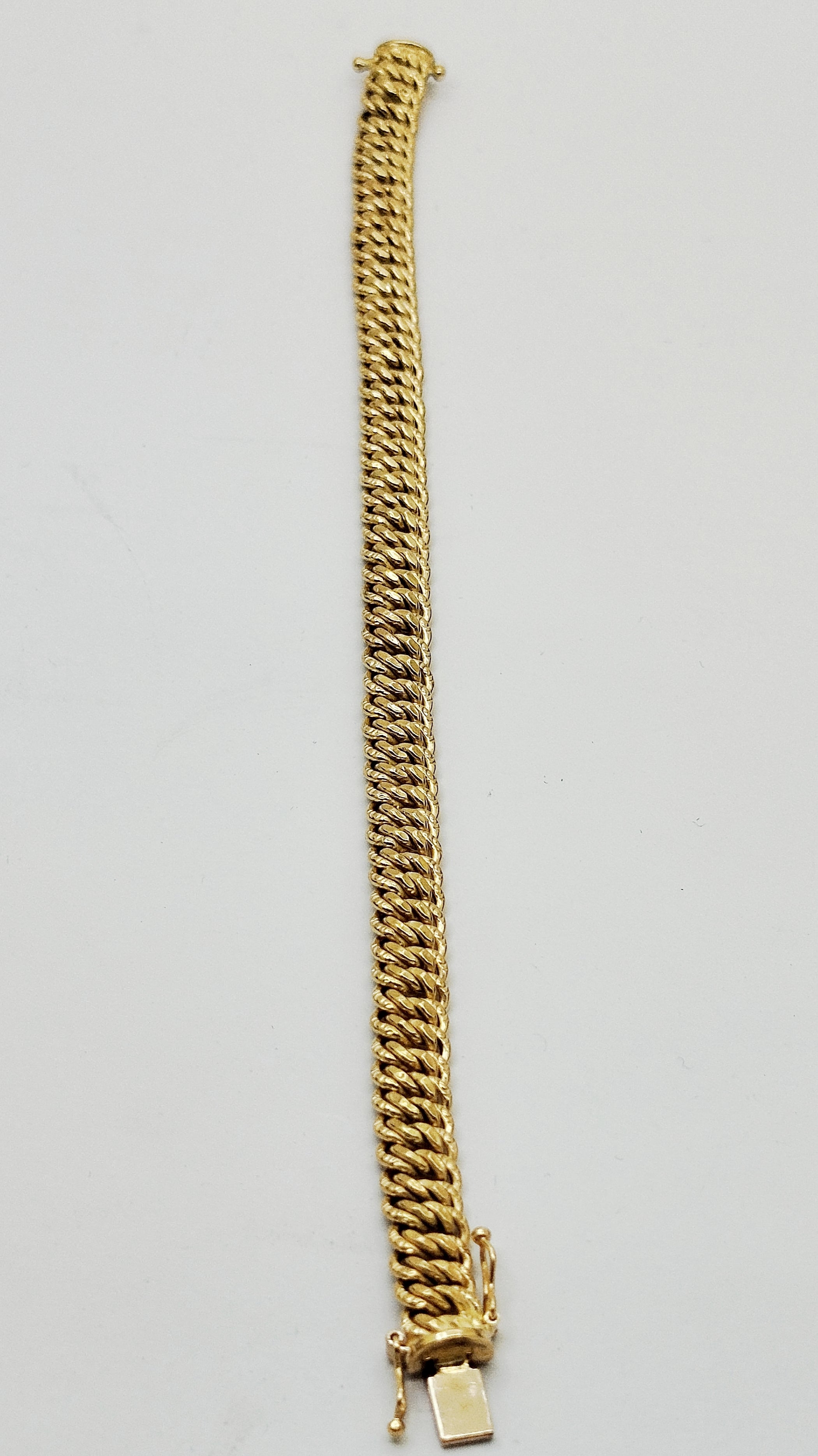 Élégant et solide, ce bracelet américain en or jaune 18 carats (10,62 g) présente une maille américaine raffinée et un fermoir à cliquet sécurisé. Largeur 0,7 cm, très bon état, un bijou intemporel et précieux.