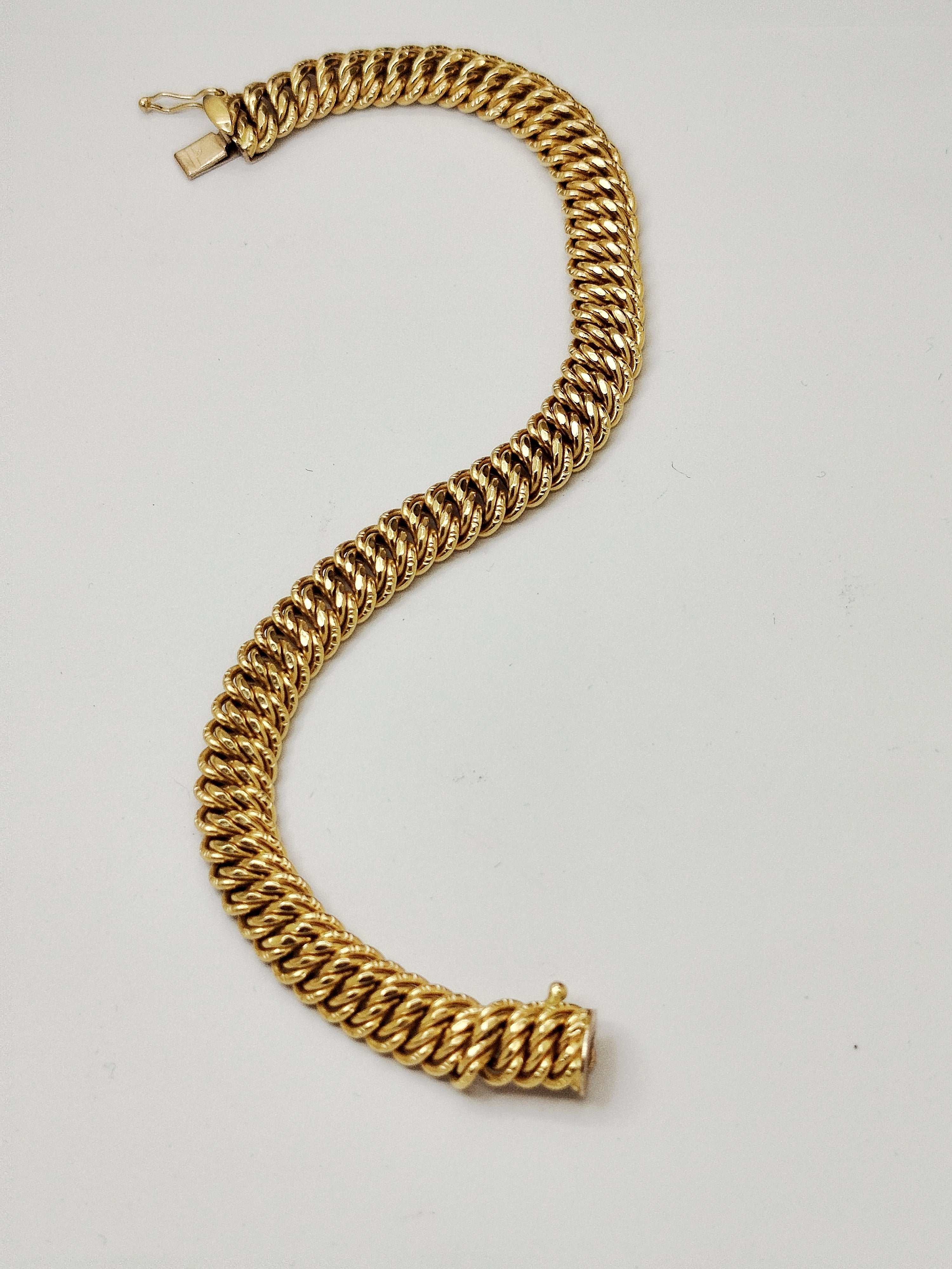 Bracelet en or jaune 750/1000 (18 carats), poinçons 18K et Tête d’Aigle, au design classique en maille Américaine. Poids 11,05 g, longueur 19 cm, largeur 0,5 cm, épaisseur 0,3 cm. Fermoir sécurisé à cliquet, sans pierre. En très bon état,