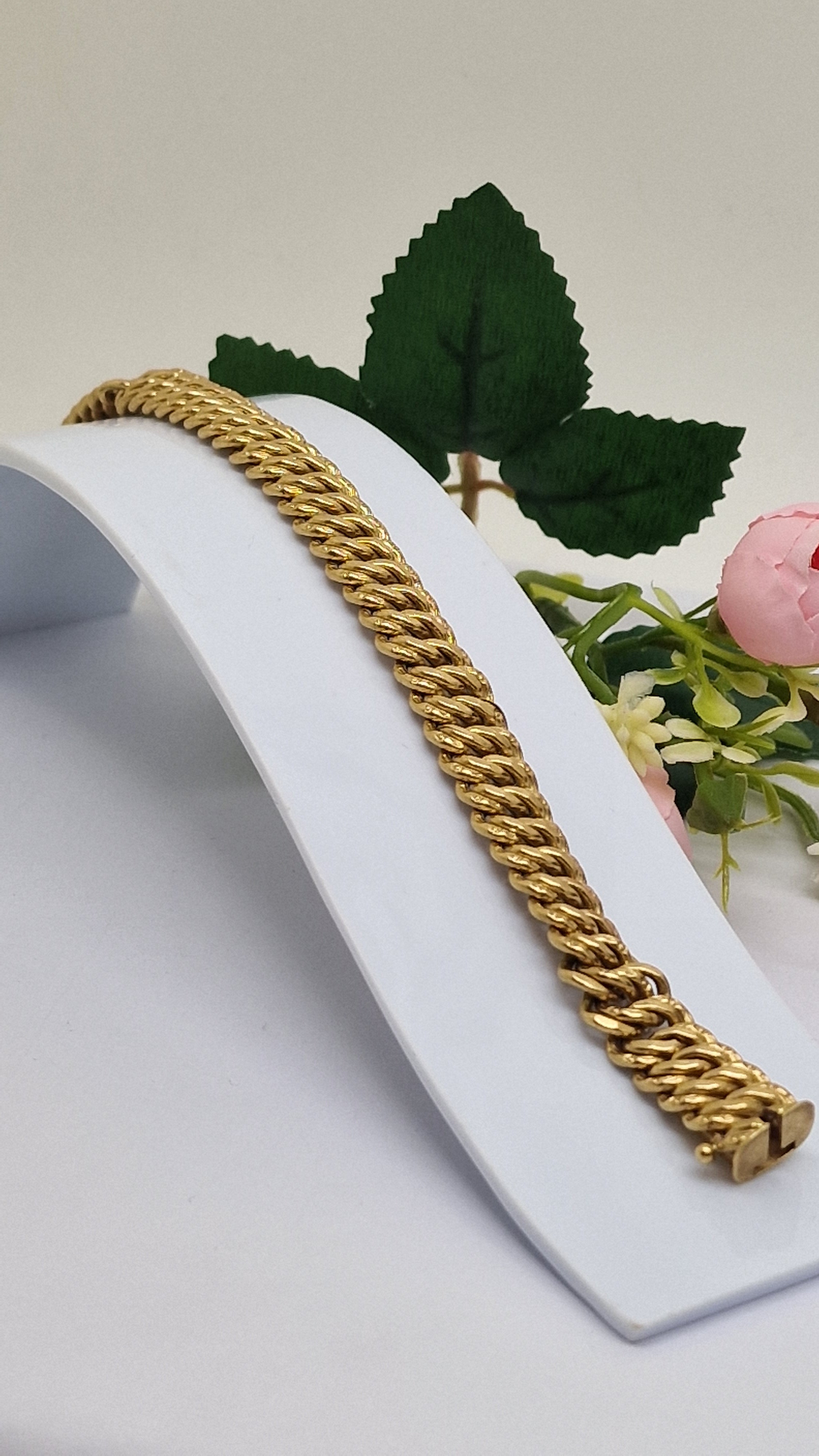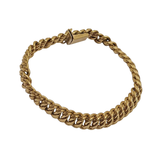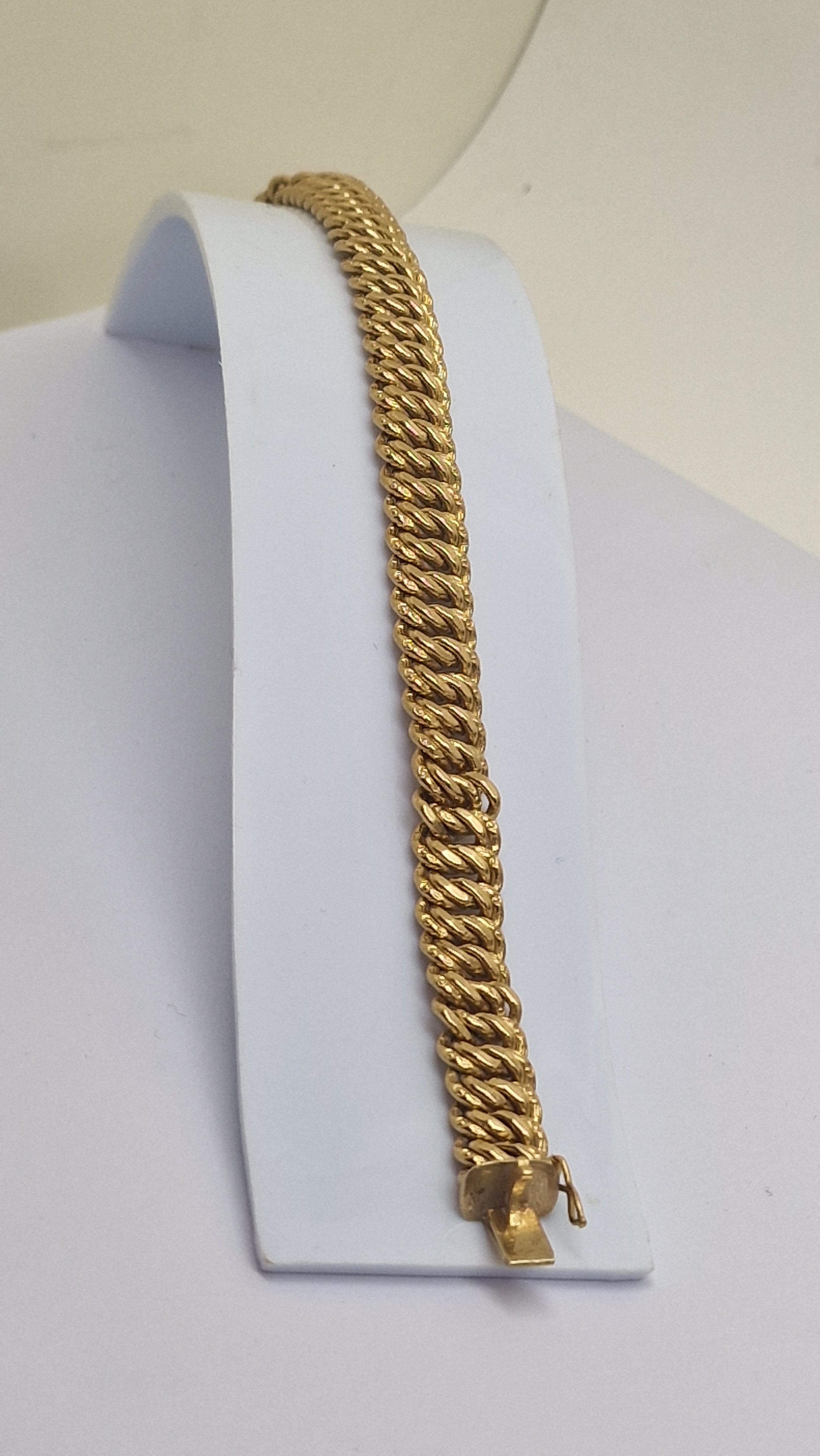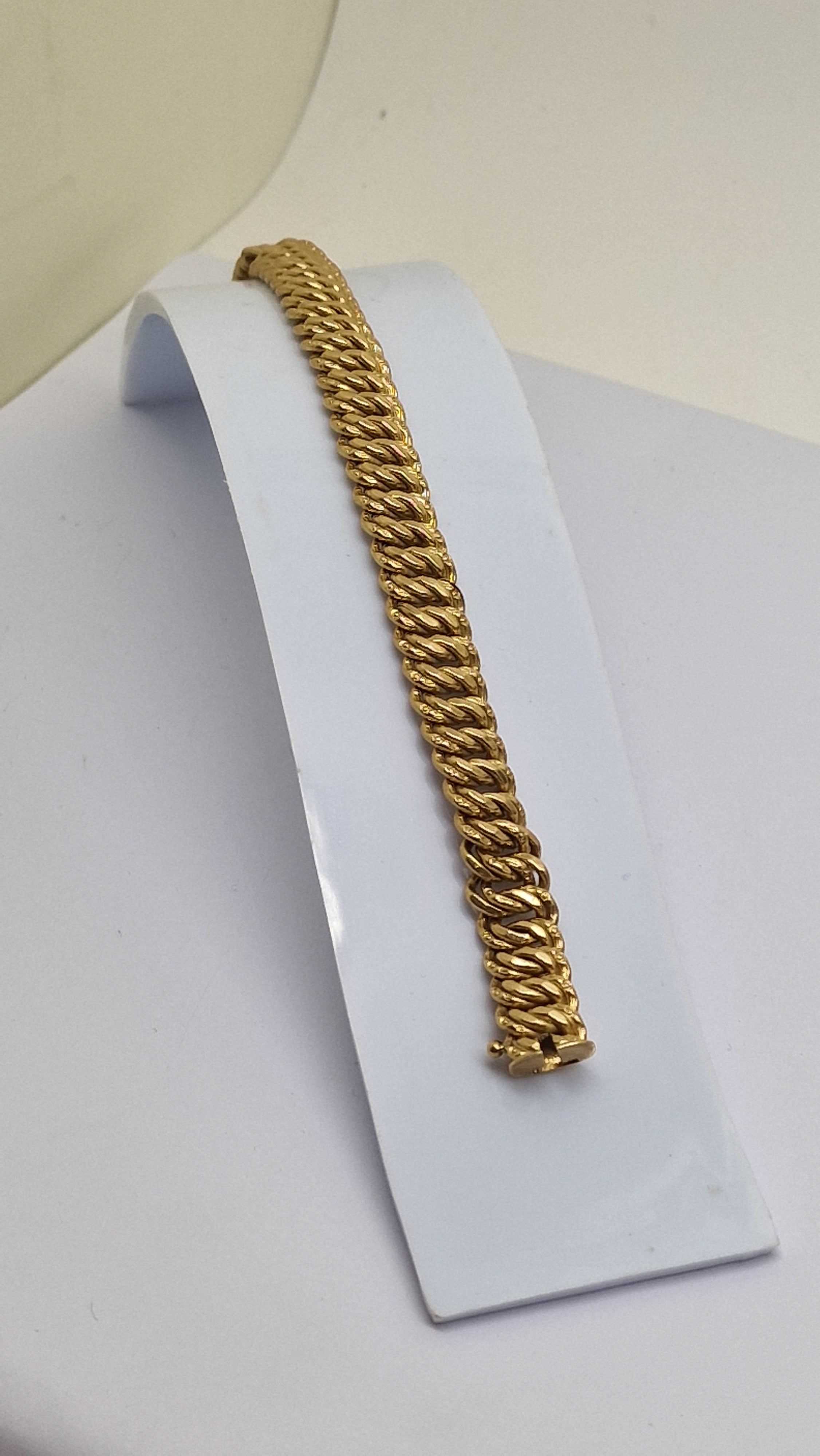 Bracelet maillon en or jaune 18 carats (750/1000), maille américaine, poinçonné tête d’aigle. Longueur : 20 cm ; largeur : 1 cm ; épaisseur : 3 mm. Poids : 17,59 g. Fermoir à cliquet. Sans pierre. Bon état.