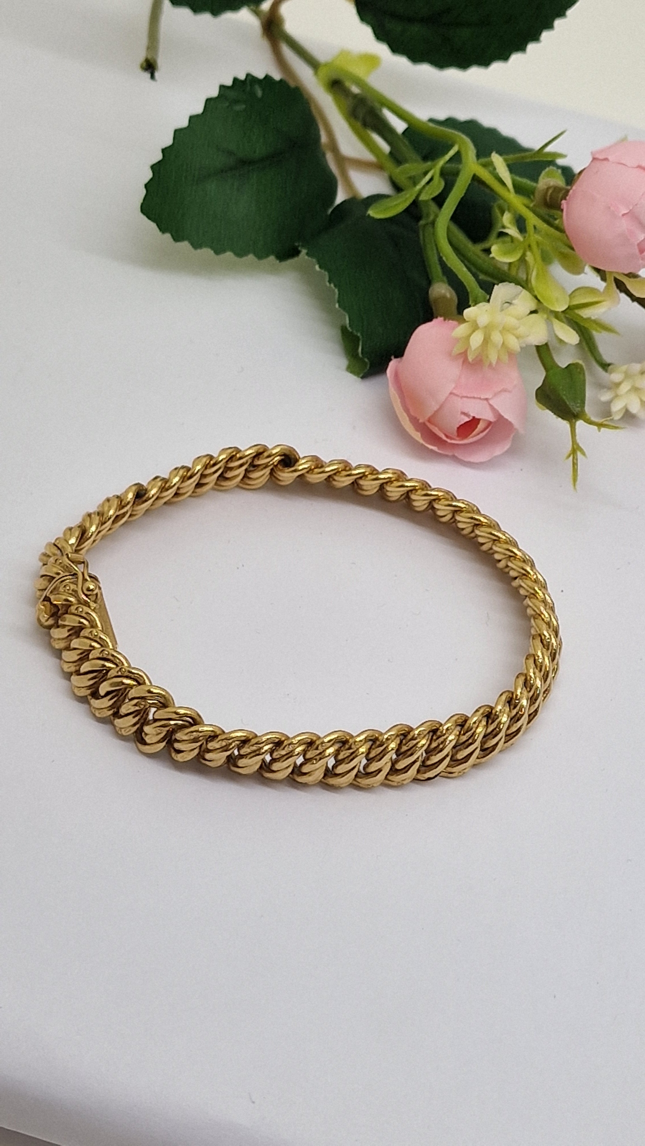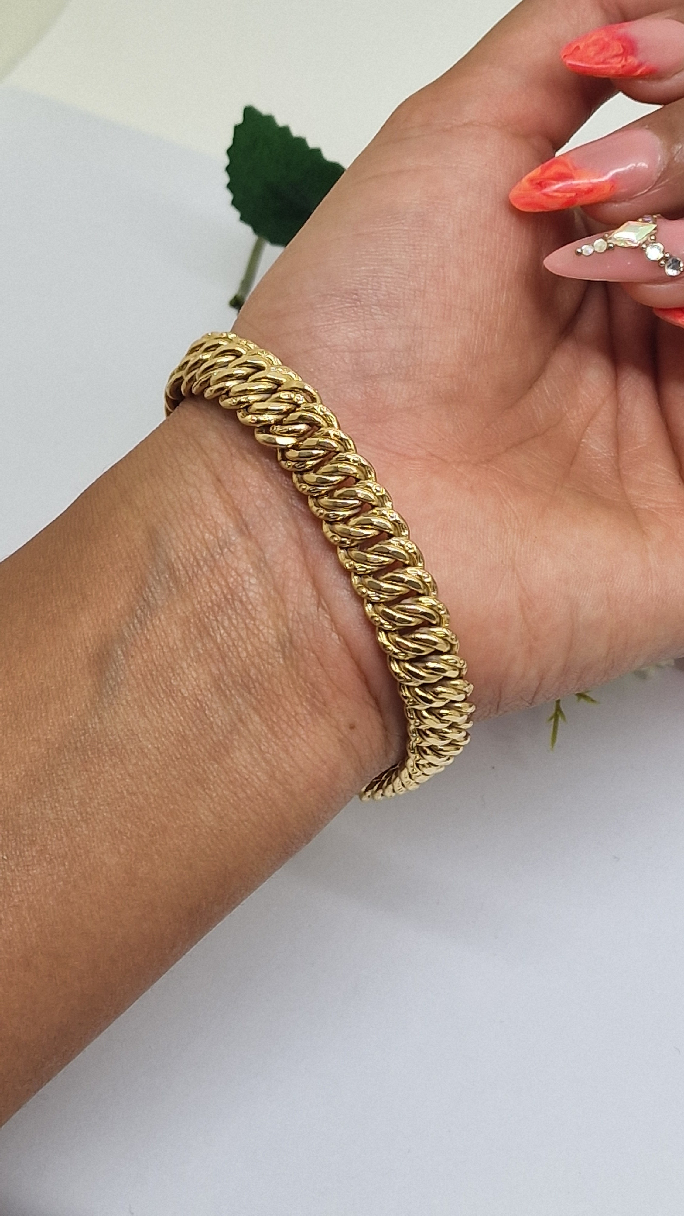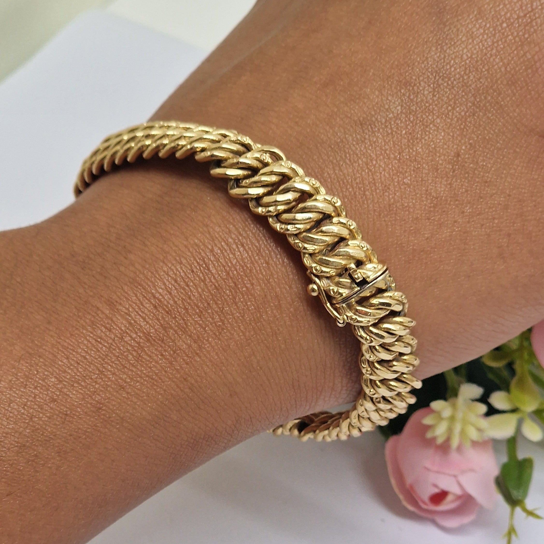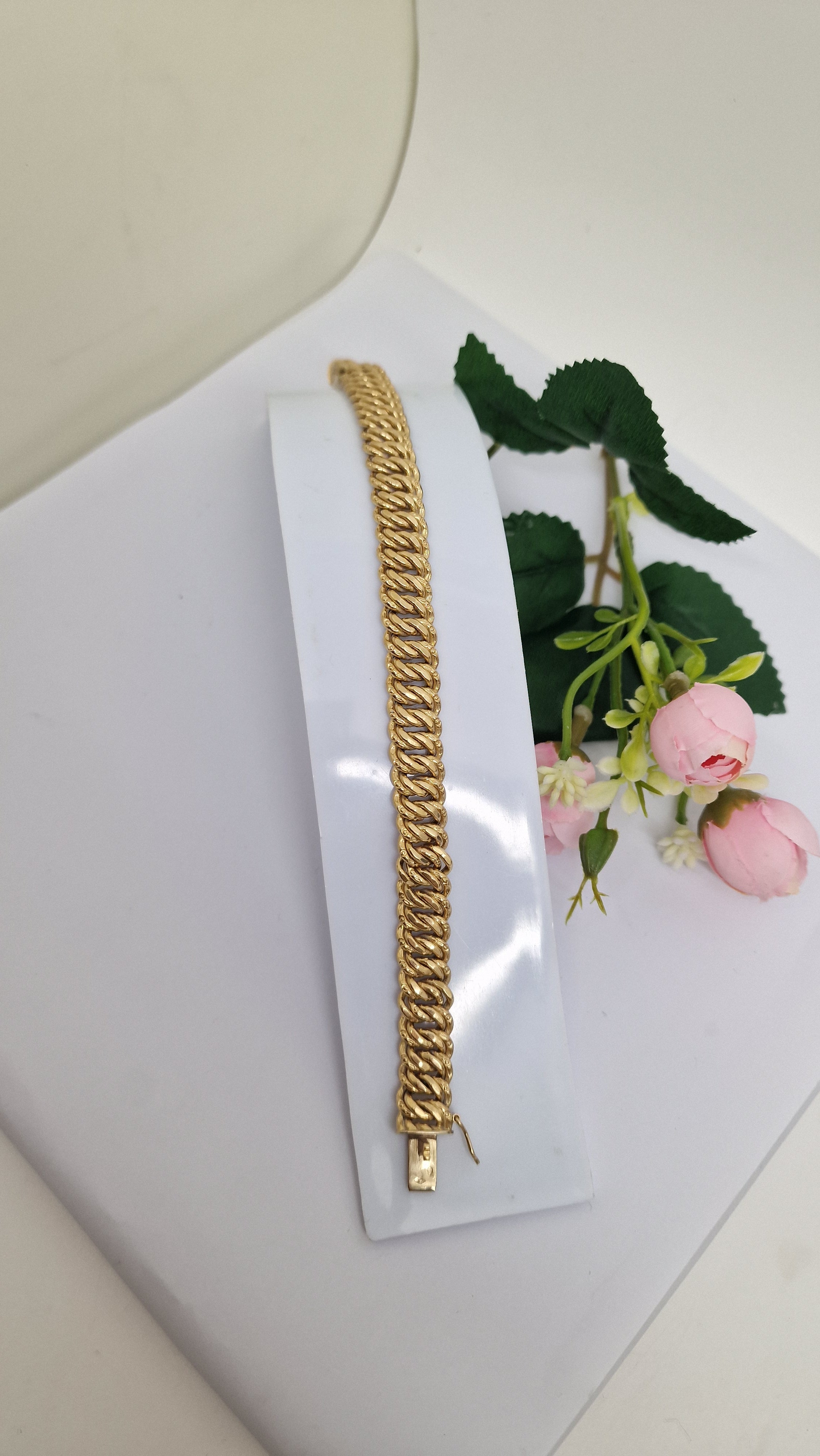 Bracelet maillon en or jaune 18 carats (750/1000), maille américaine, poinçonné tête d’aigle. Longueur : 20 cm ; largeur : 1 cm ; épaisseur : 3 mm. Poids : 17,59 g. Fermoir à cliquet. Sans pierre. Bon état.