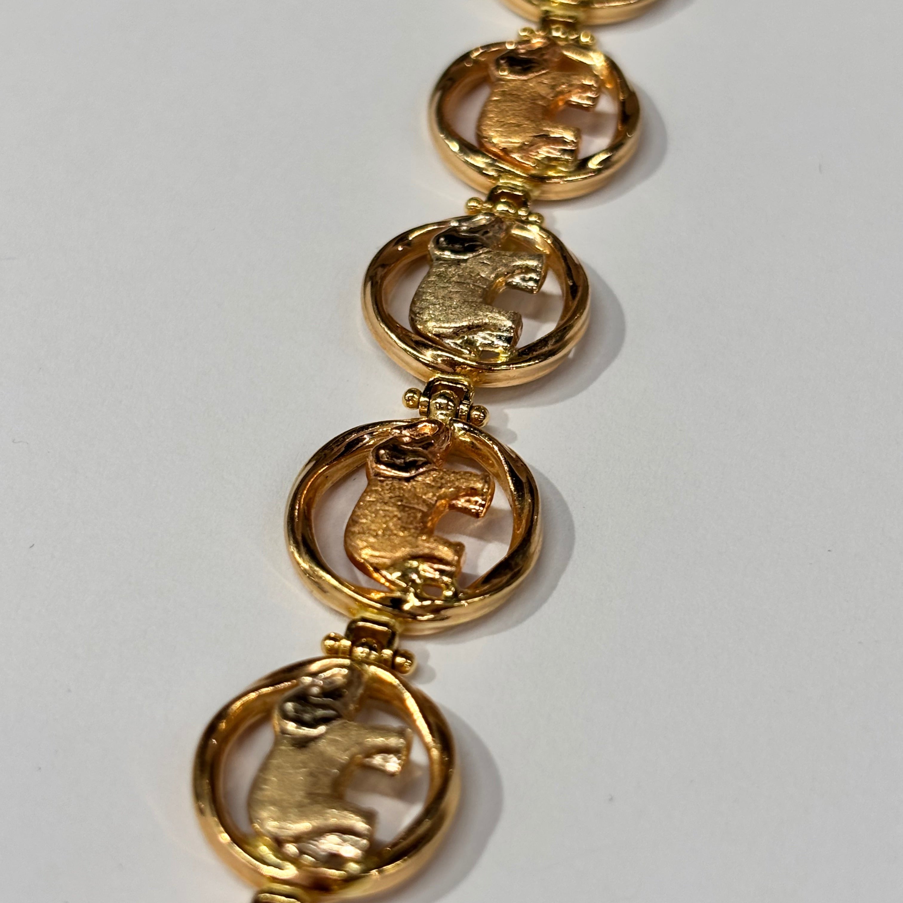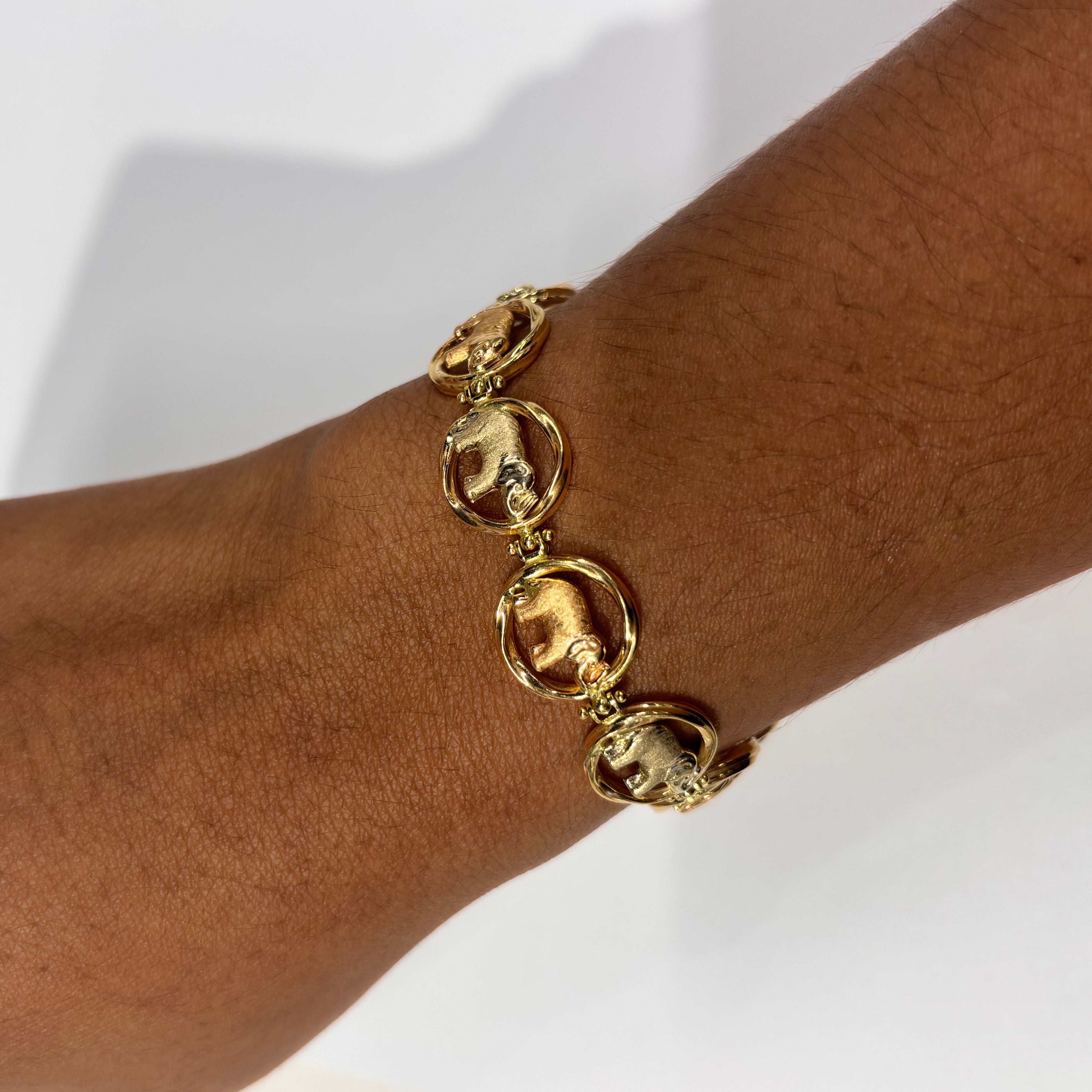 Bracelet à maillons de type jaseron en or jaune, or blanc et or rose 18 carats (750/1000), poinçonné "18K". Il pèse 12,60 grammes et mesure 20 cm de long, avec une largeur de 1,3 mm et une épaisseur de 0,3 mm. Ce modèle sans pierres est équipé d’un fermoir mousqueton, alliant sécurité et praticité. L’ensemble est en très bon état.