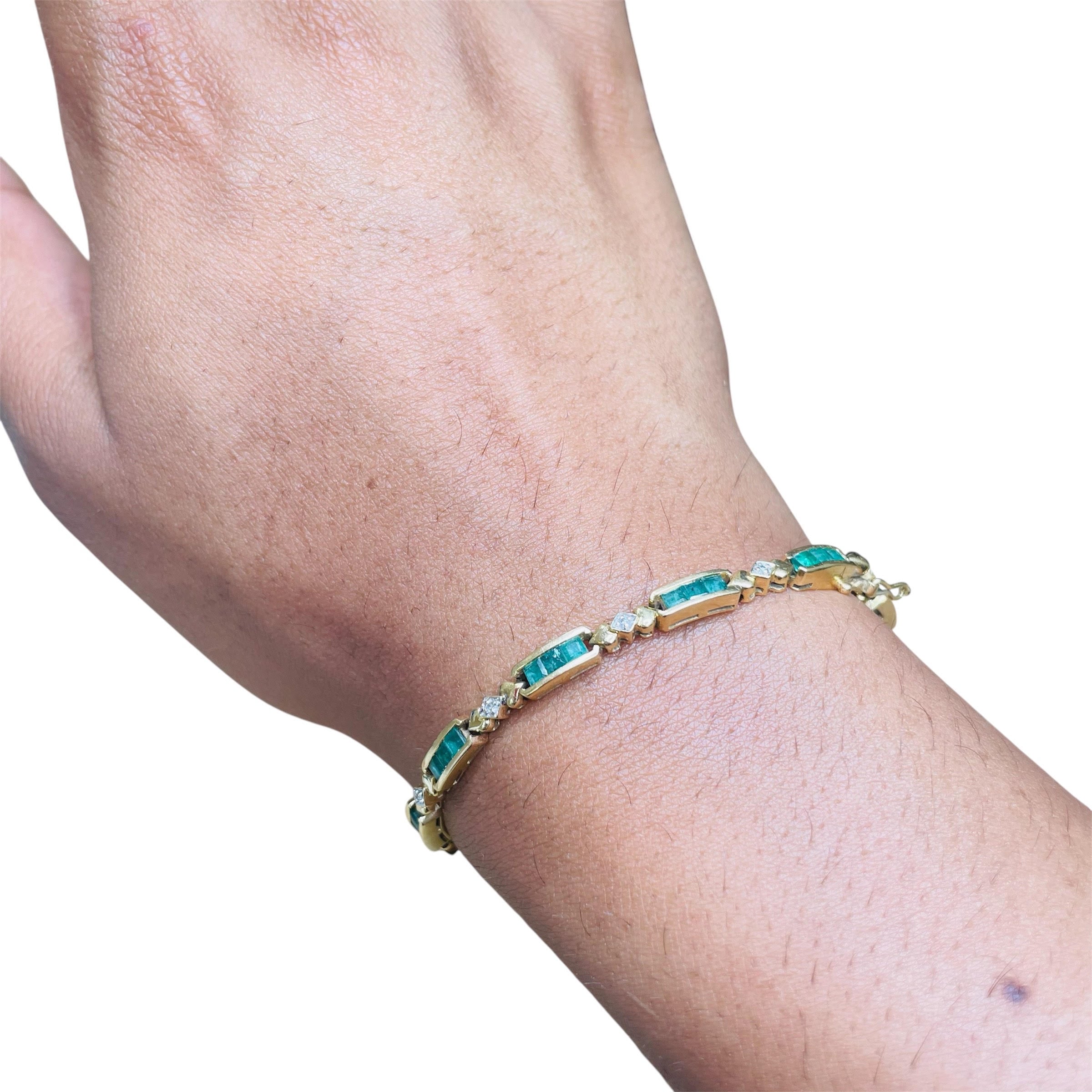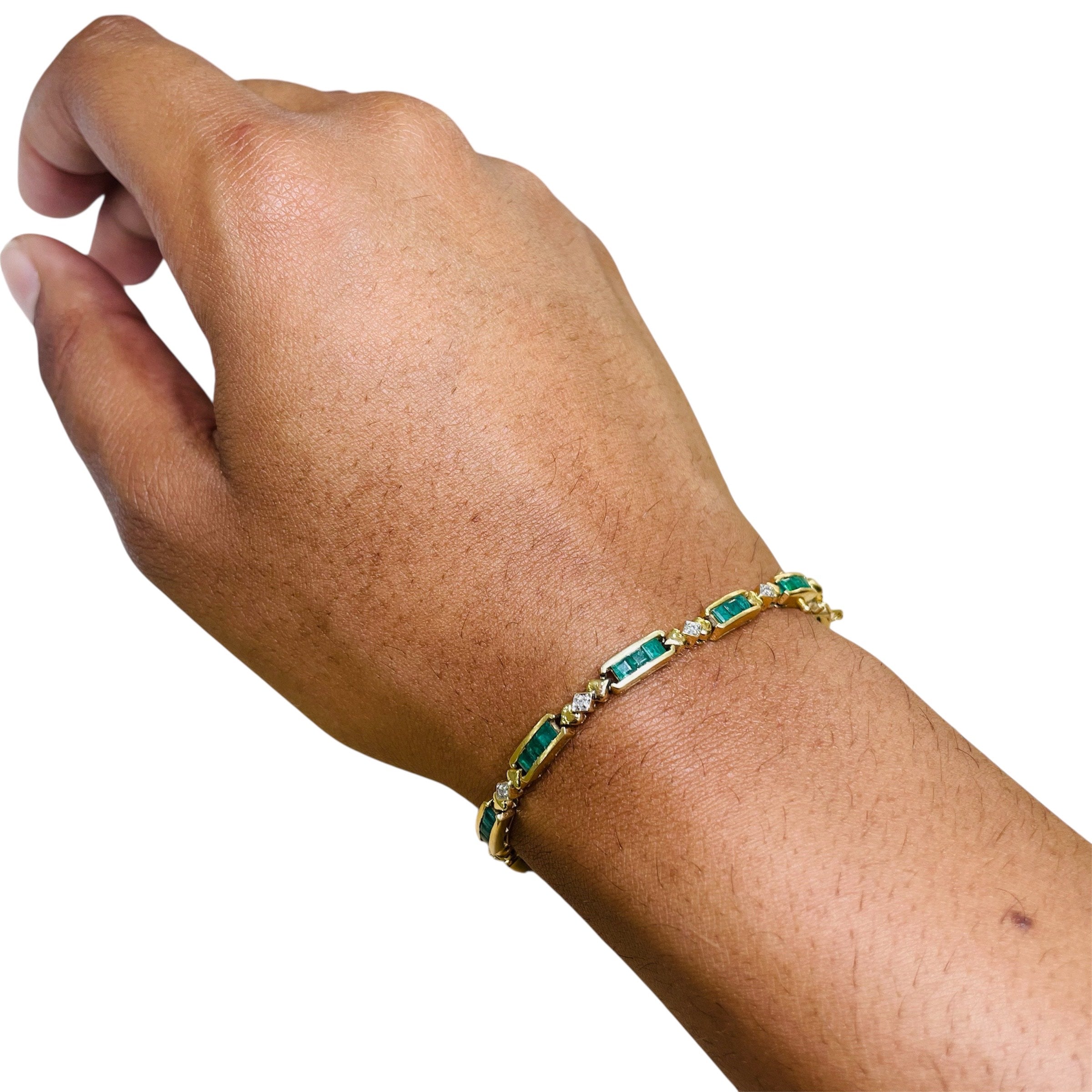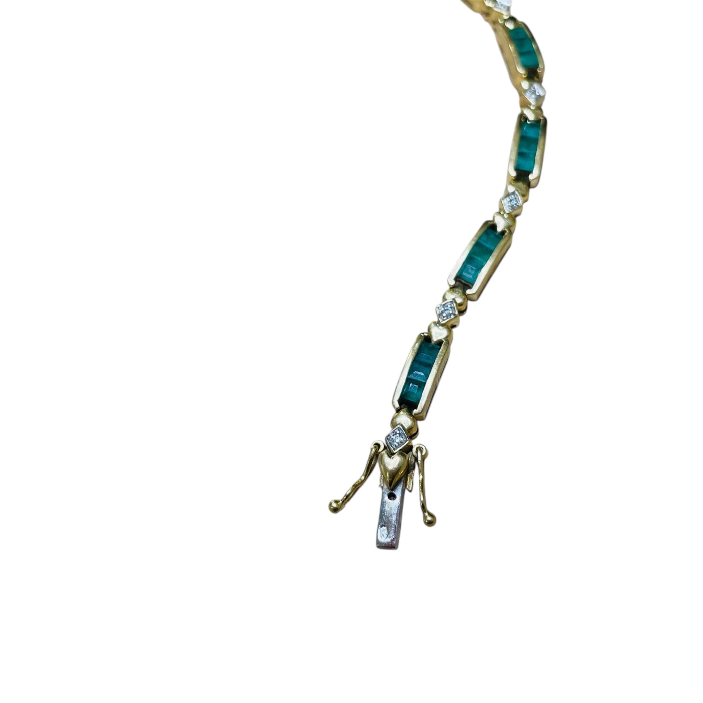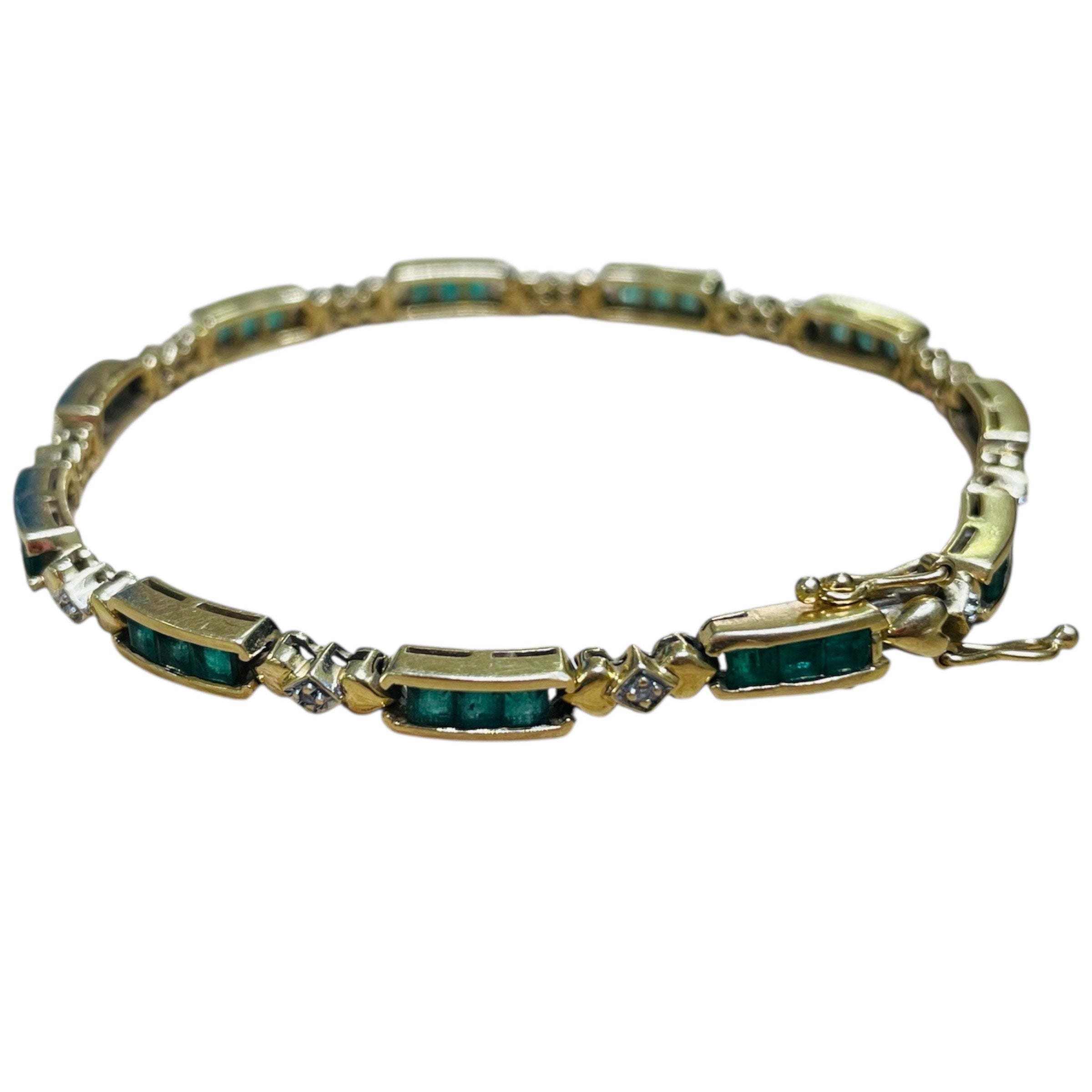 Bracelet maillon en or jaune 18 carats (750/1000), poinçonné tête d’aigle. Poids : 11,58 g. Longueur : 17 cm. Maille articulée. Serti de 11 diamants et une émeraude. Fermoir à cliquet. Très bon état.
