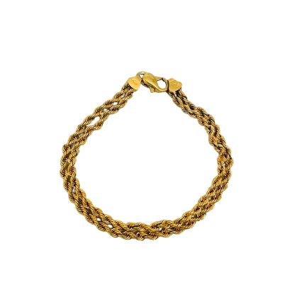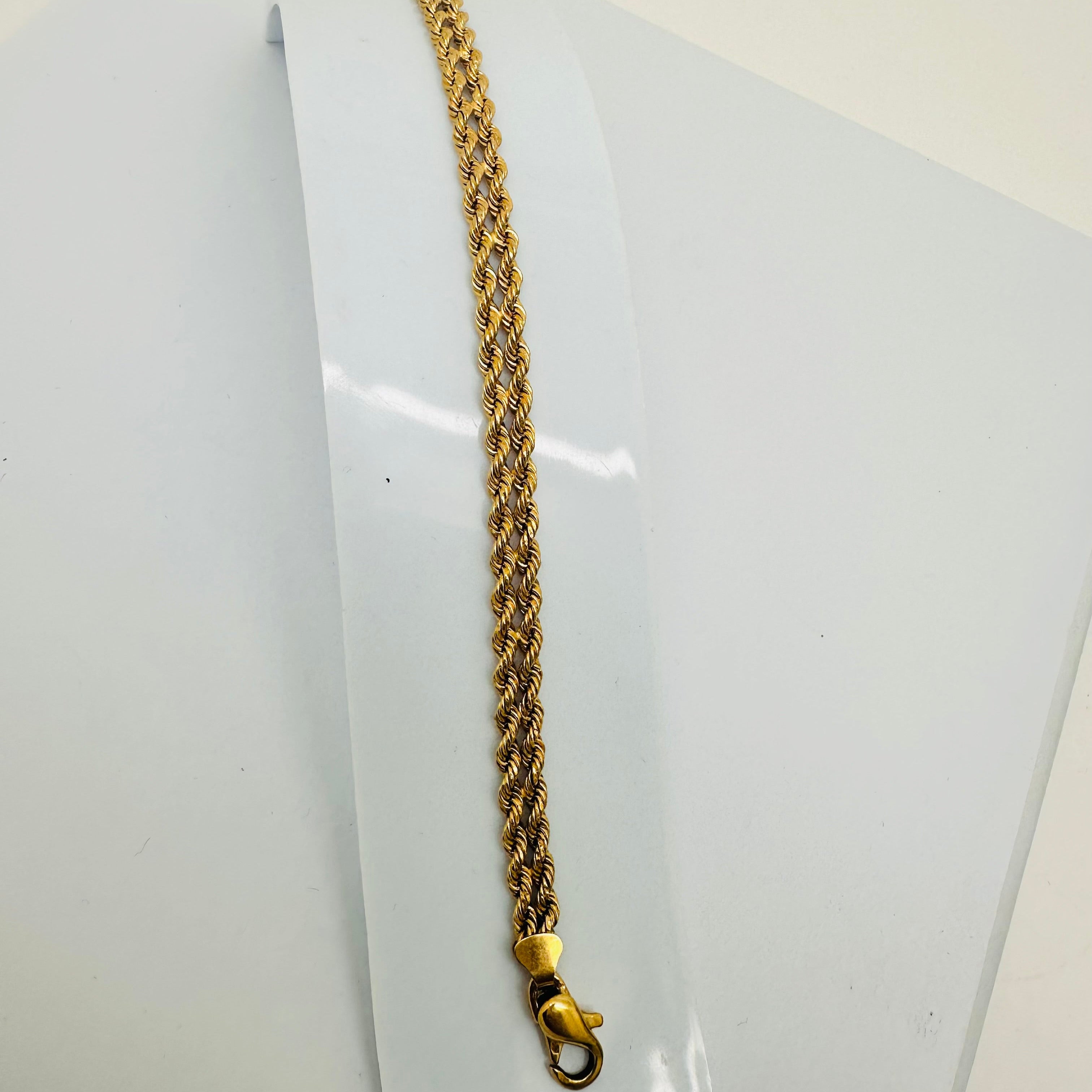Bracelet à maillons en or jaune 18 carats (750/1000), poinçonné Tête d’Aigle, avec une maille corde à l’aspect texturé et classique. Il mesure 19,5 cm de longueur, 6 mm de largeur et 2 mm d’épaisseur, et se ferme grâce à un fermoir mousqueton solide.