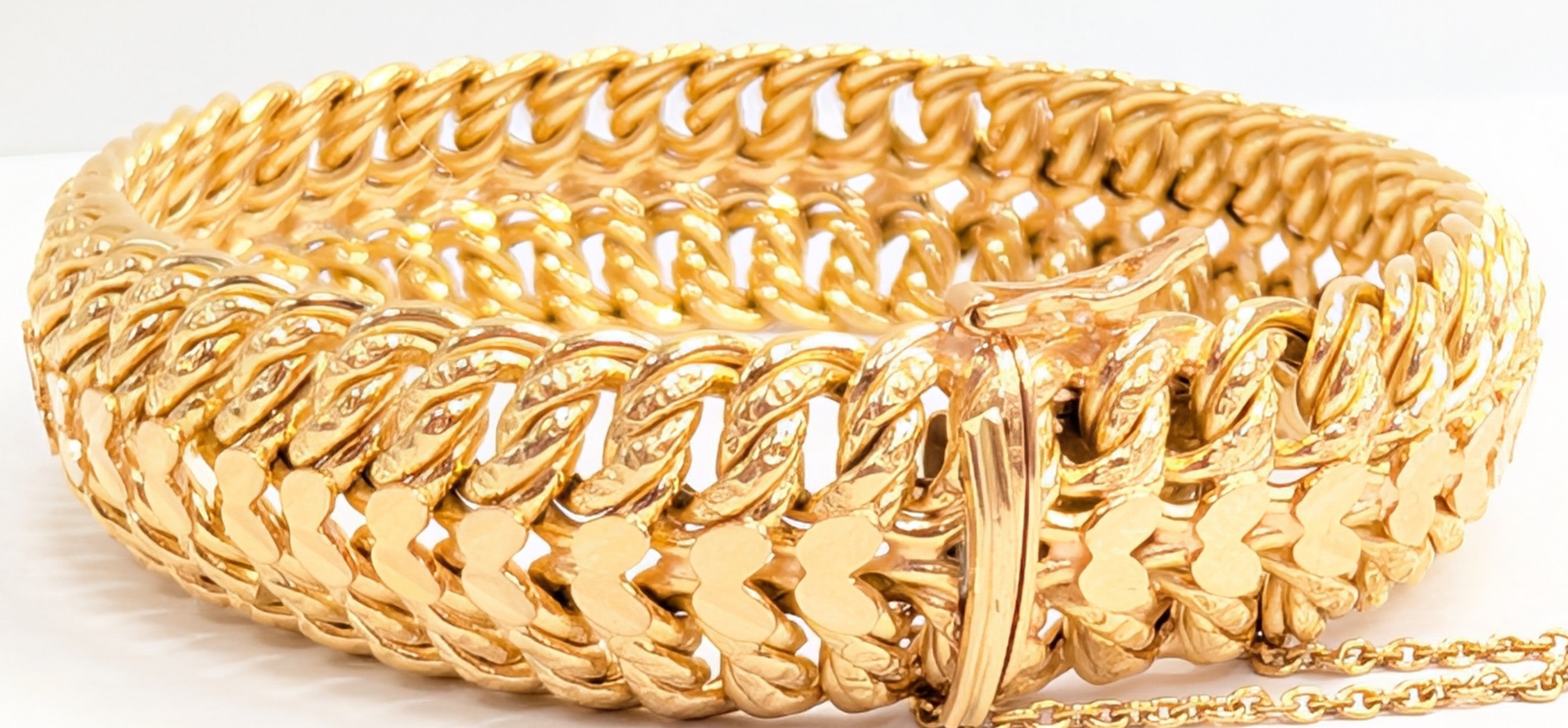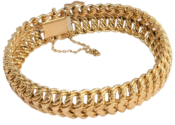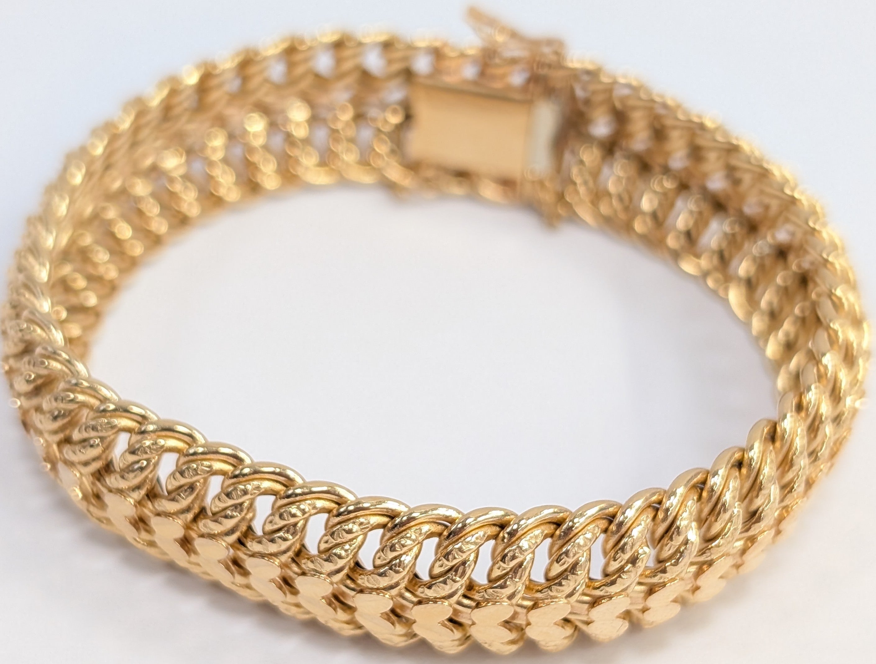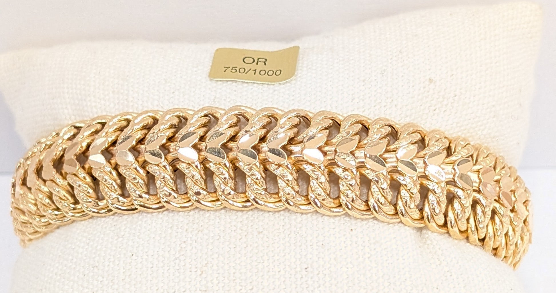 Bracelet maillon en or jaune 18 carats (750/1000), de type maille américaine, poinçonné tête d’aigle. Longueur 20 cm, largeur 14 mm, épaisseur 4 mm. Fermoir à cliquet sécurisé. Poids : 24,54 g. Sans pierre, en très bon état. Un bijou massif au style affirmé.