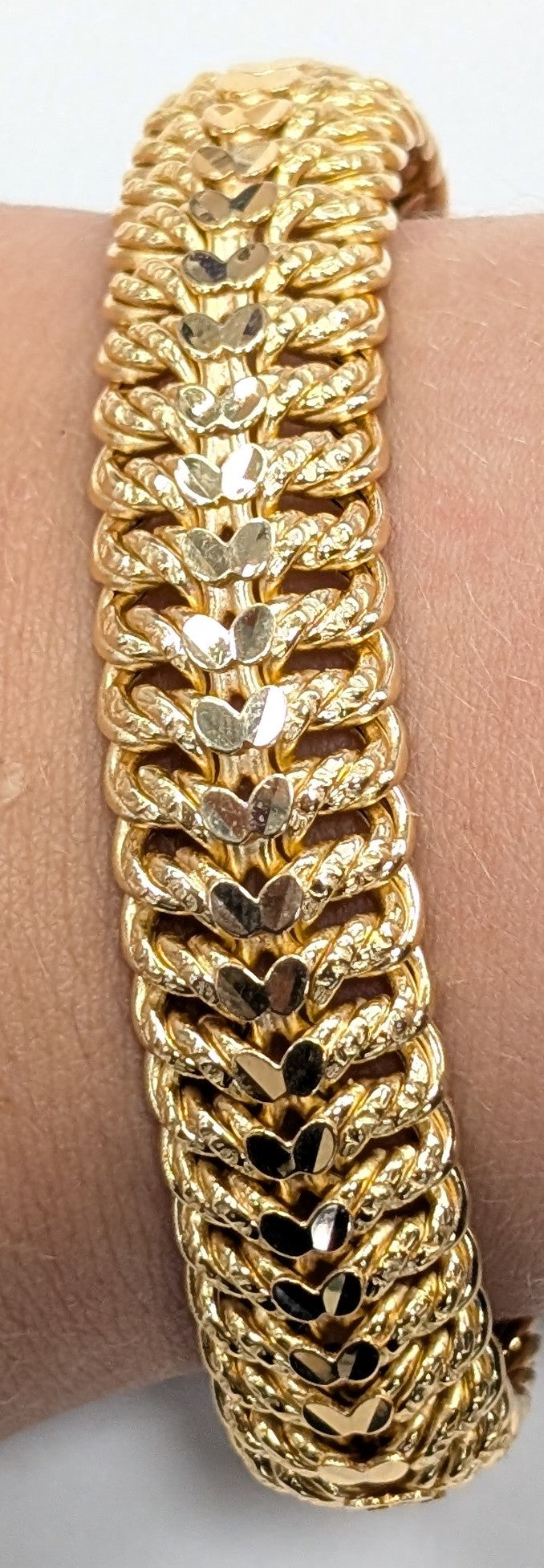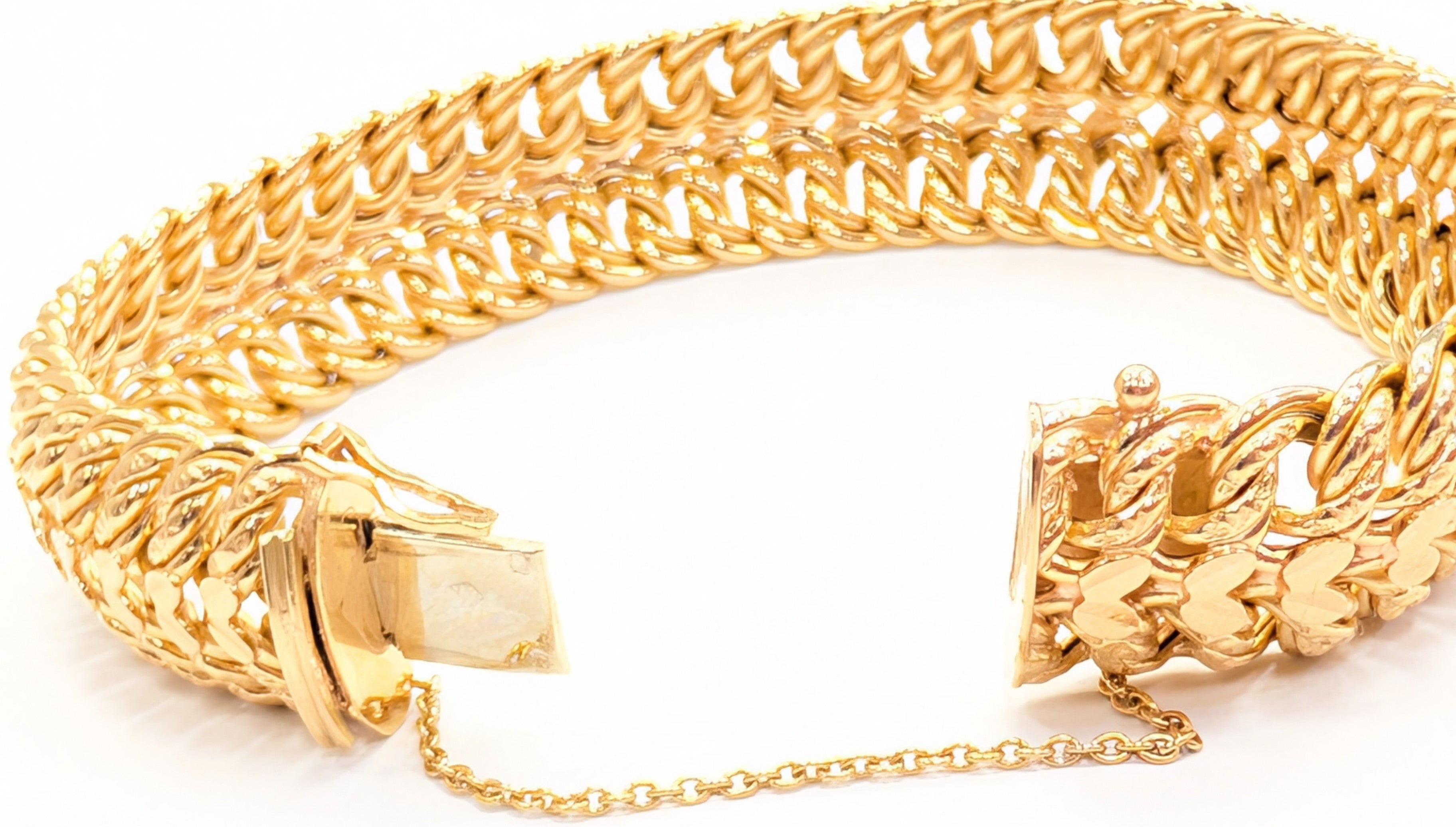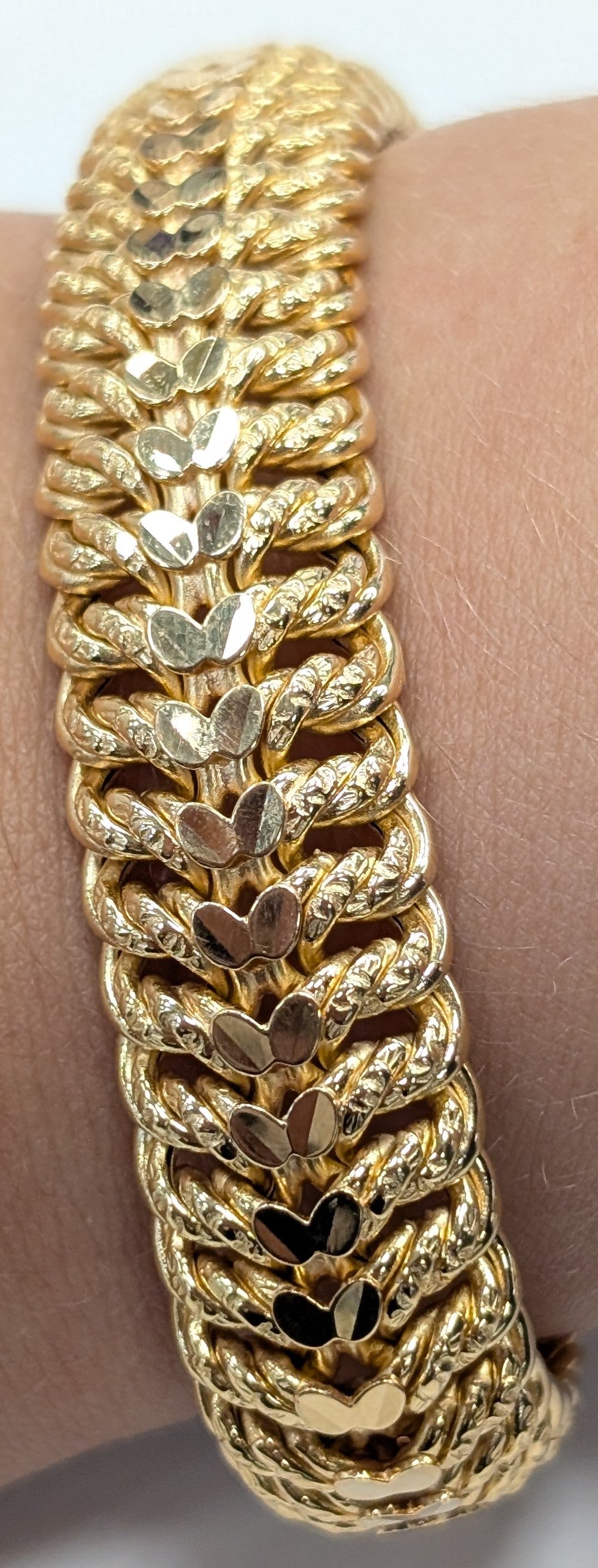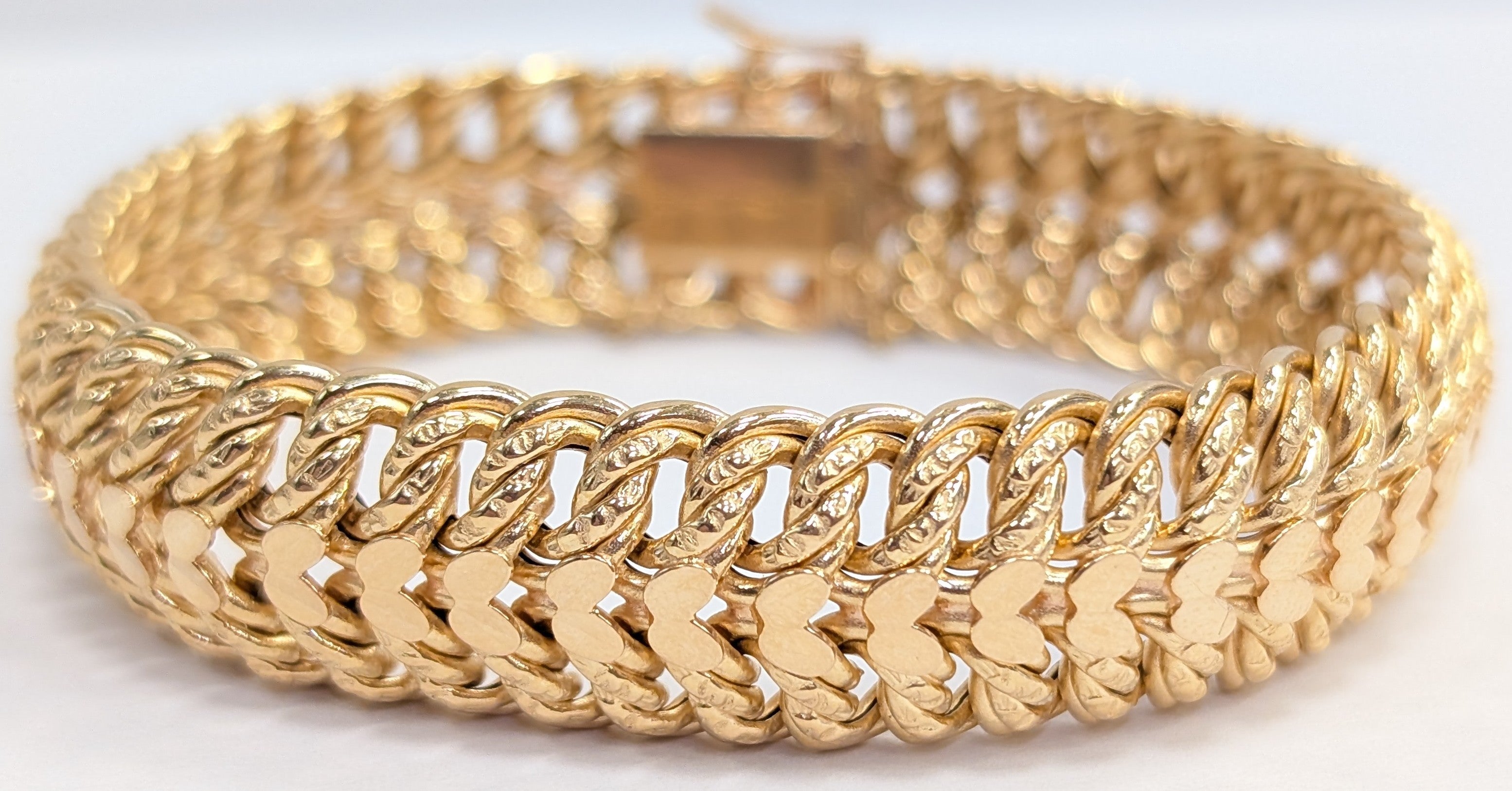 Bracelet maillon en or jaune 18 carats (750/1000), de type maille américaine, poinçonné tête d’aigle. Longueur 20 cm, largeur 14 mm, épaisseur 4 mm. Fermoir à cliquet sécurisé. Poids : 24,54 g. Sans pierre, en très bon état. Un bijou massif au style affirmé.