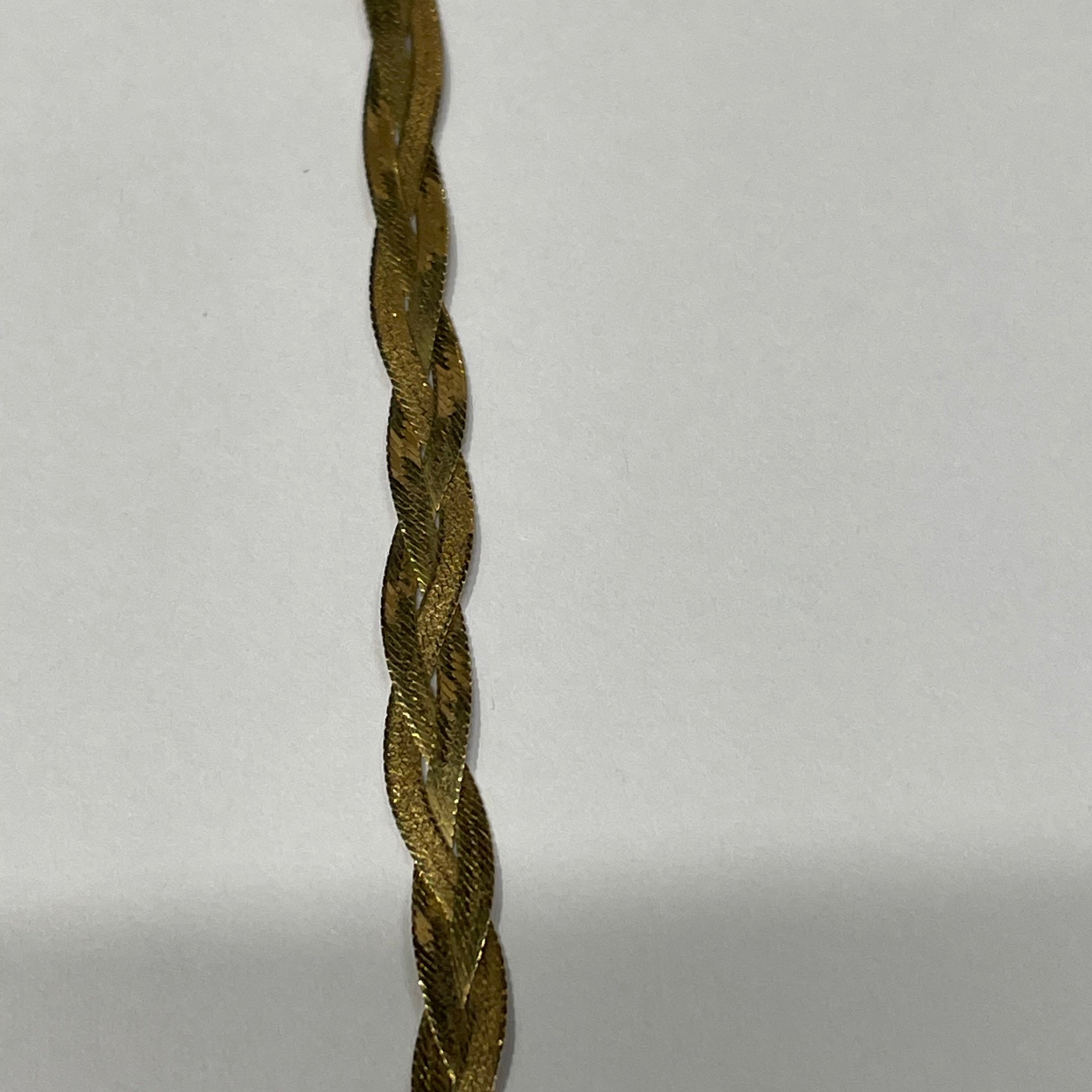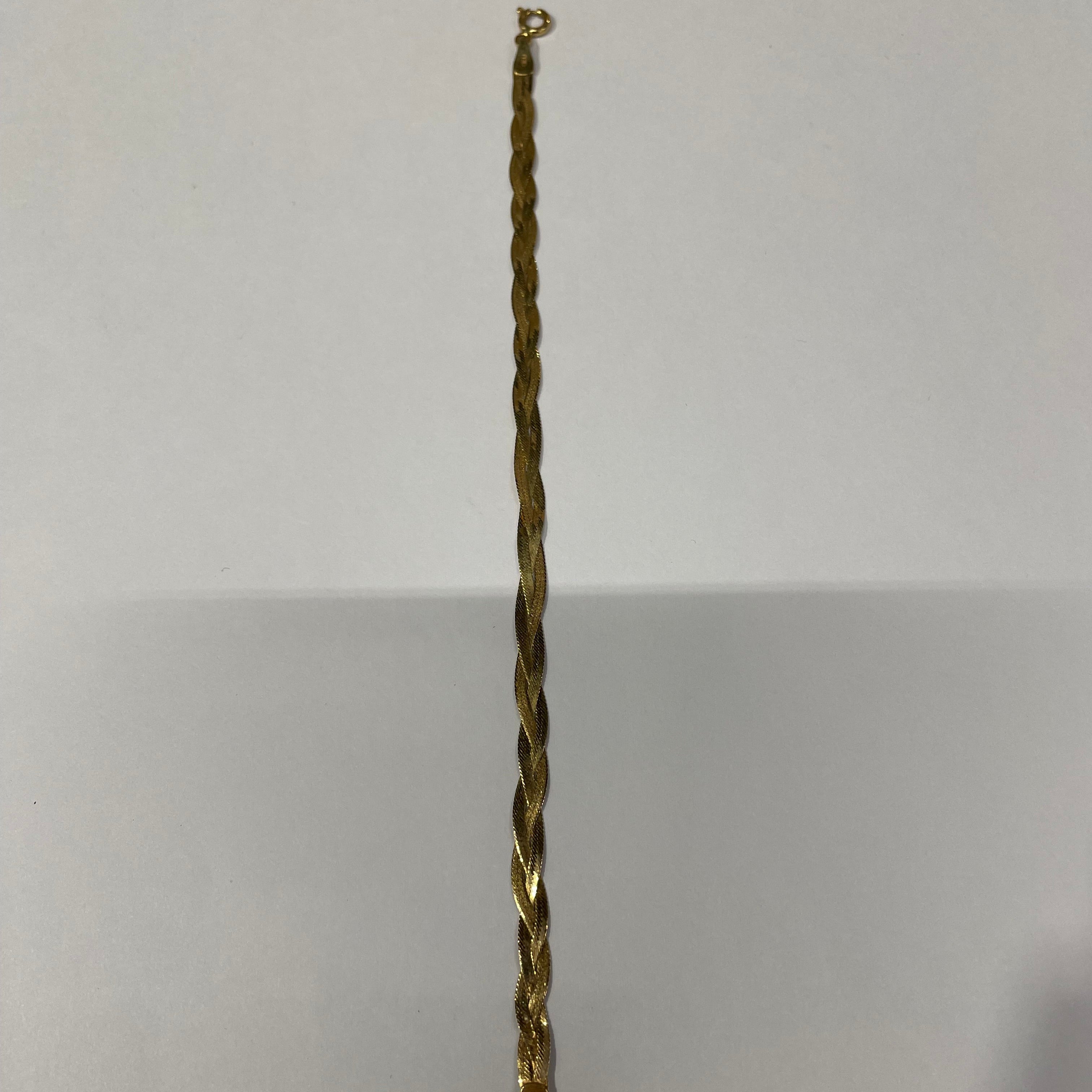 Bracelet maillon en or jaune 18 carats (750/1000) avec maille tressée pèse 2.56 grammes et mesure 18 cm de longueur. Il a une largeur de 0.1 mm et une épaisseur de 0.7 mm, avec un fermoir à anneau ressort. Sans pierres, il est en très bon état.