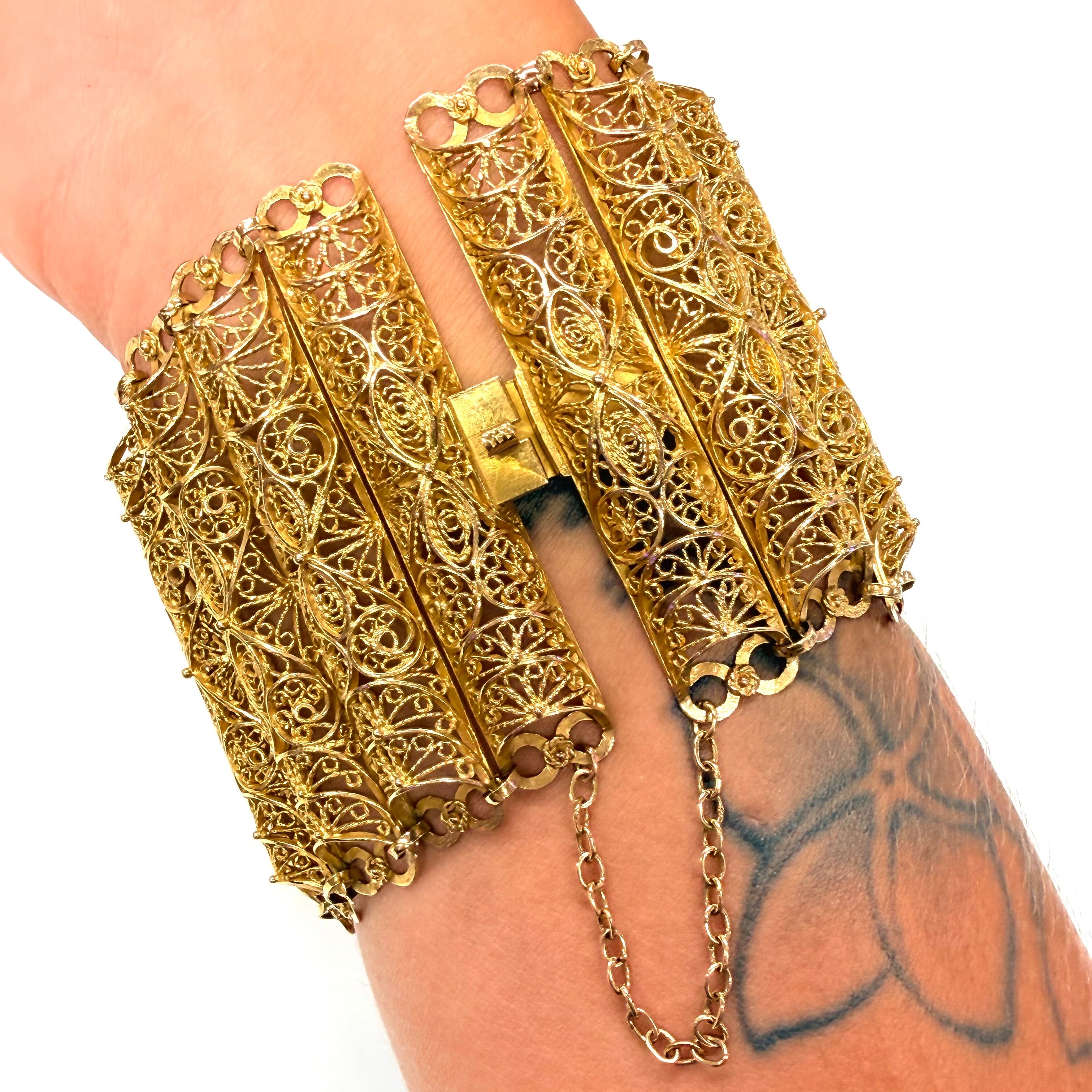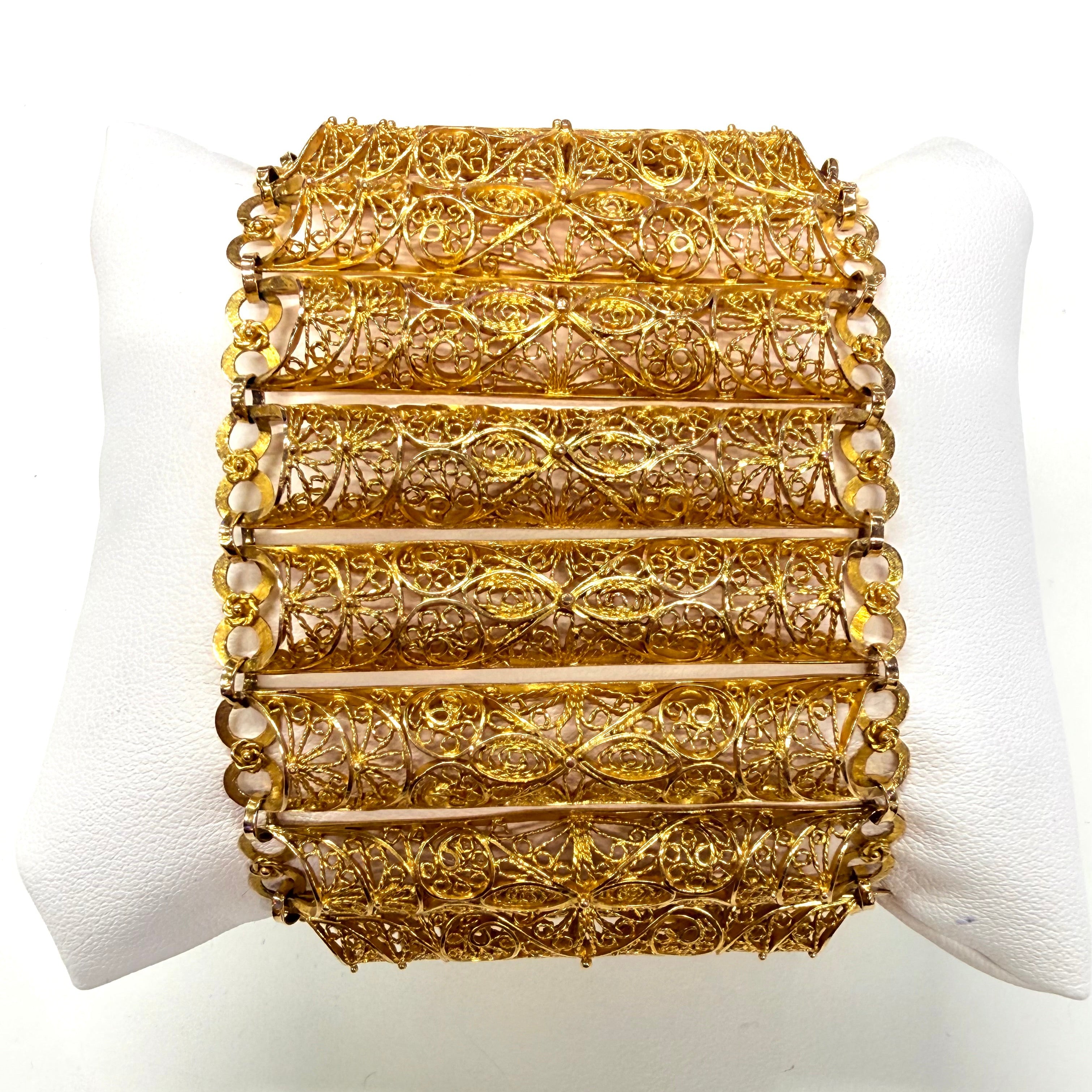 Imposante et raffinée, cette manchette en or jaune 18 carats (750/1000) se distingue par son design barrette élégant et contemporain. Avec un poids de 76,23 g, une longueur d’environ 17 cm, une largeur de 5 cm et une épaisseur de 0,5 cm, elle offre un effet visuel fort et sophistiqué au poignet. Son fermoir à cliquet garantit sécurité et confort. Un bijou statement en très bon état, parfait pour affirmer votre style avec élégance.