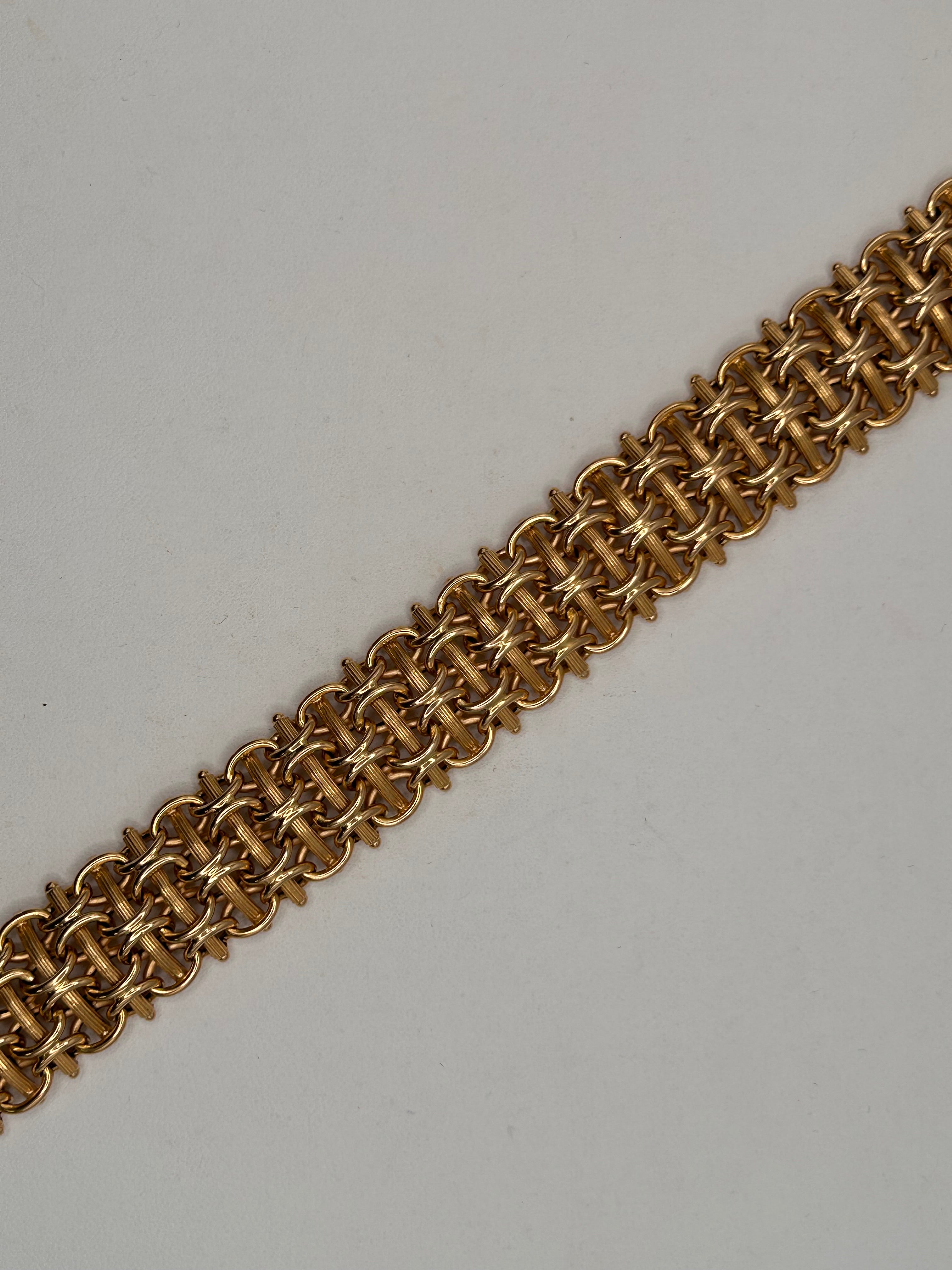 Bracelet manchette en or jaune 18 carats (750/1000) présente une maille fantaisie et porte le poinçon tête d’aigle. Il mesure 21 cm de long, 2,2 cm de large et 5 mm d’épaisseur, pour un poids imposant de 43,82 grammes. Dépourvu de pierres, il est équipé d’un fermoir à cliquet et se trouve en très bon état.