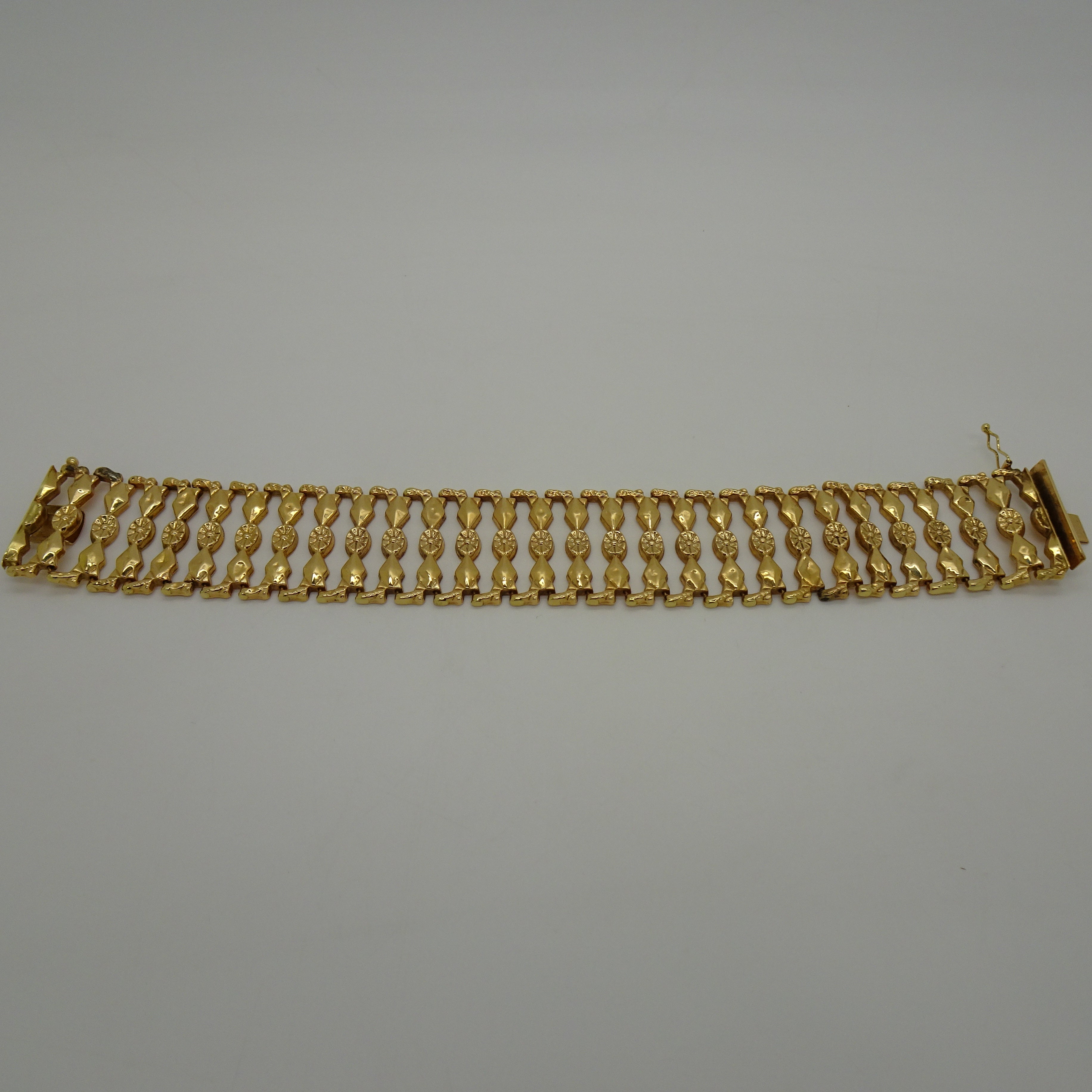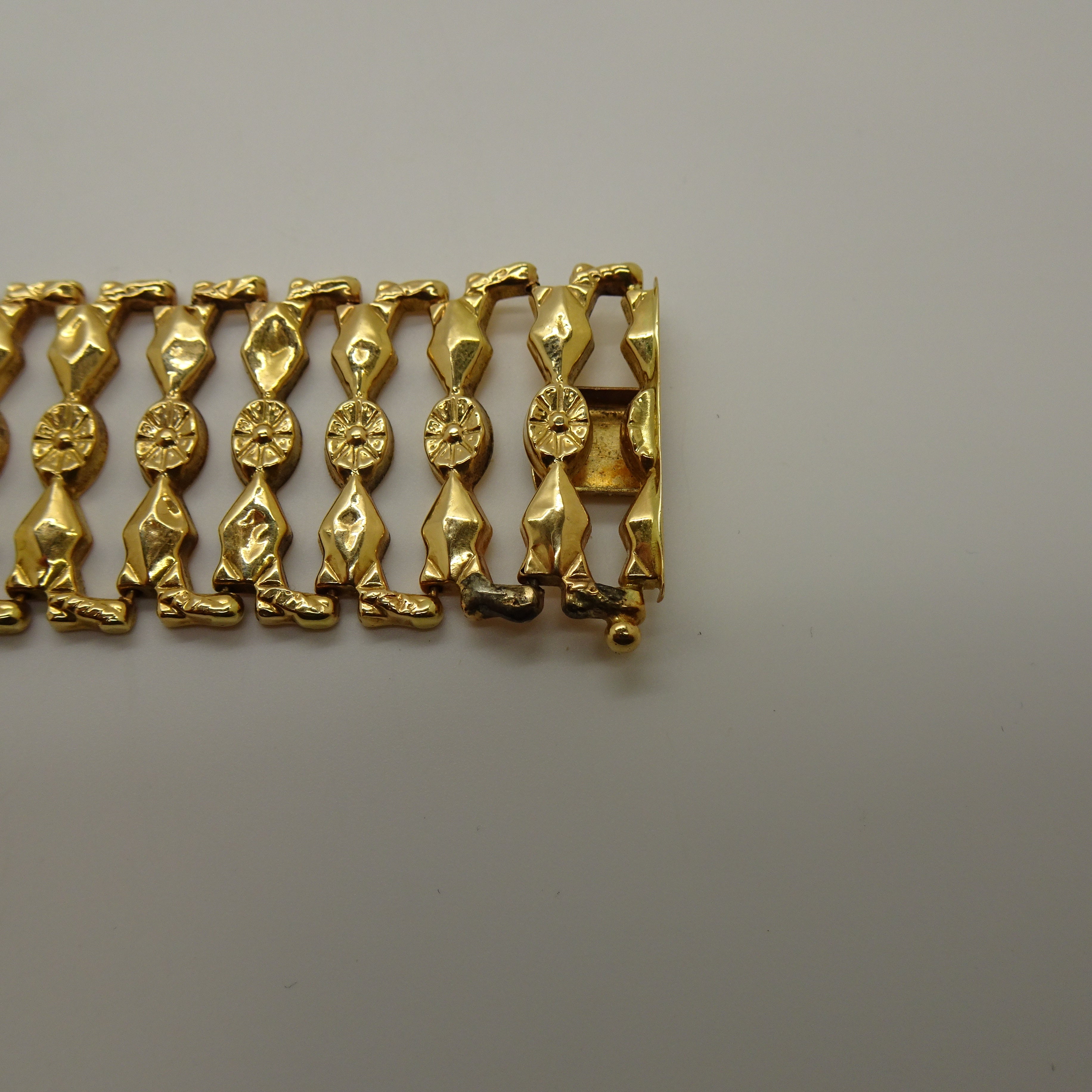 Bracelet manchette à maille plate est en or jaune 18 carats (750/1000) et porte le poinçon tête d’aigle. Il mesure 19 cm de long, 22 mm de large et 2,09 mm d’épaisseur, pour un poids de 20,10 grammes. Dépourvu de pierres et doté d’un fermoir à cliquet, il est en très bon état.