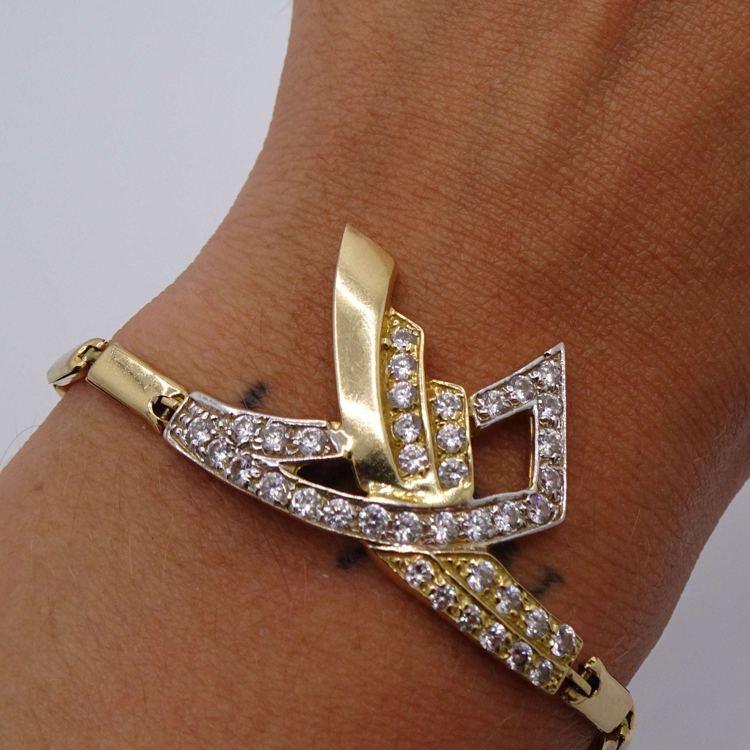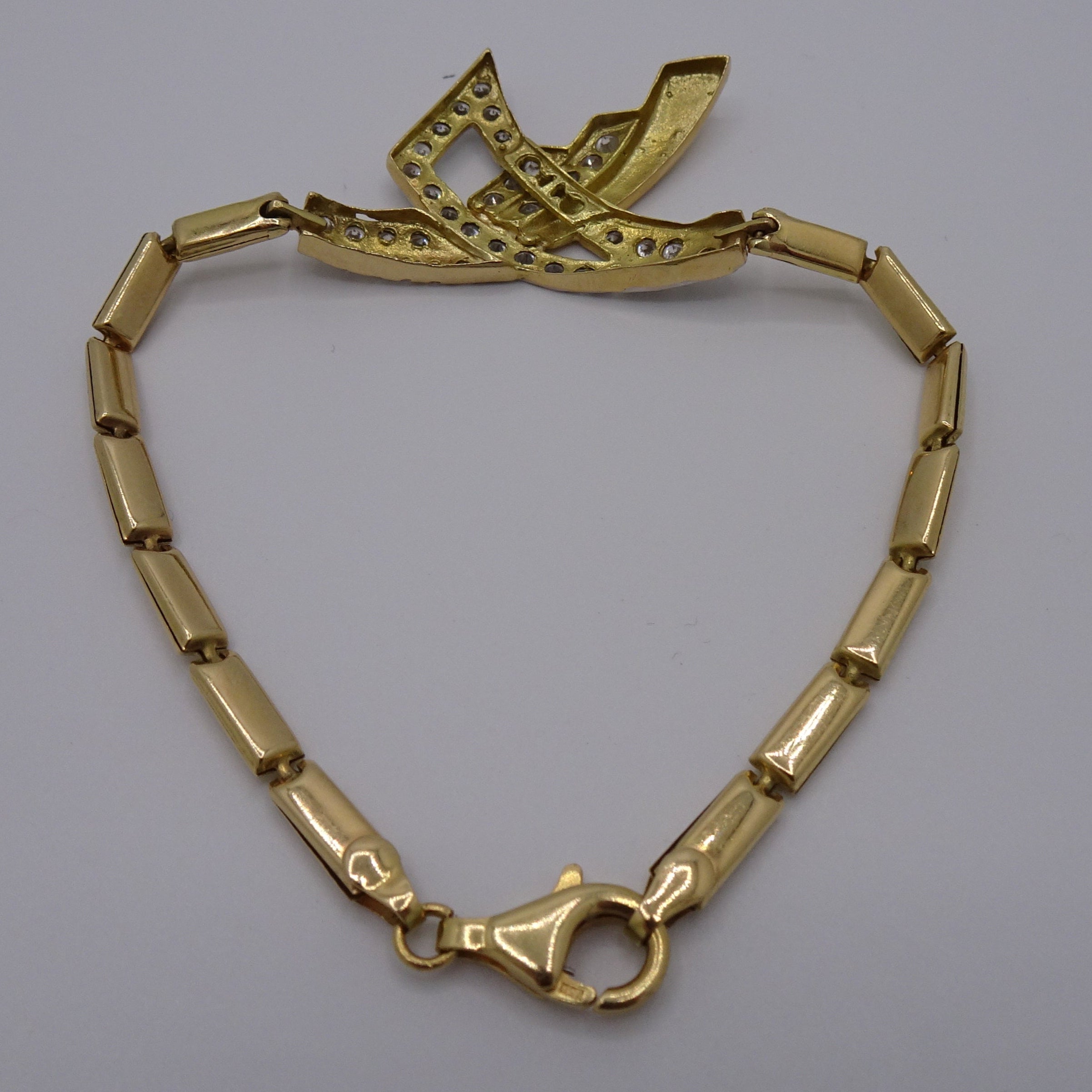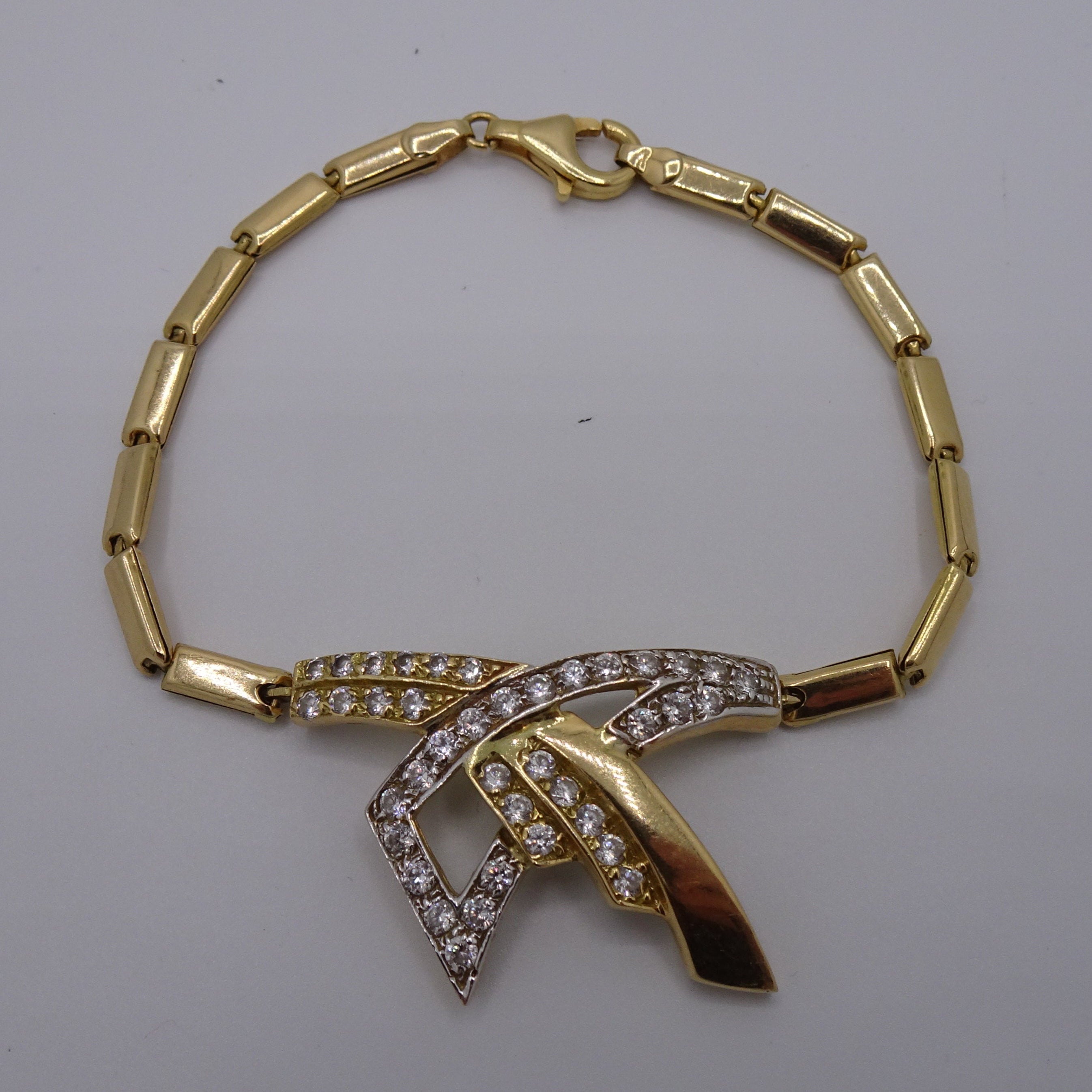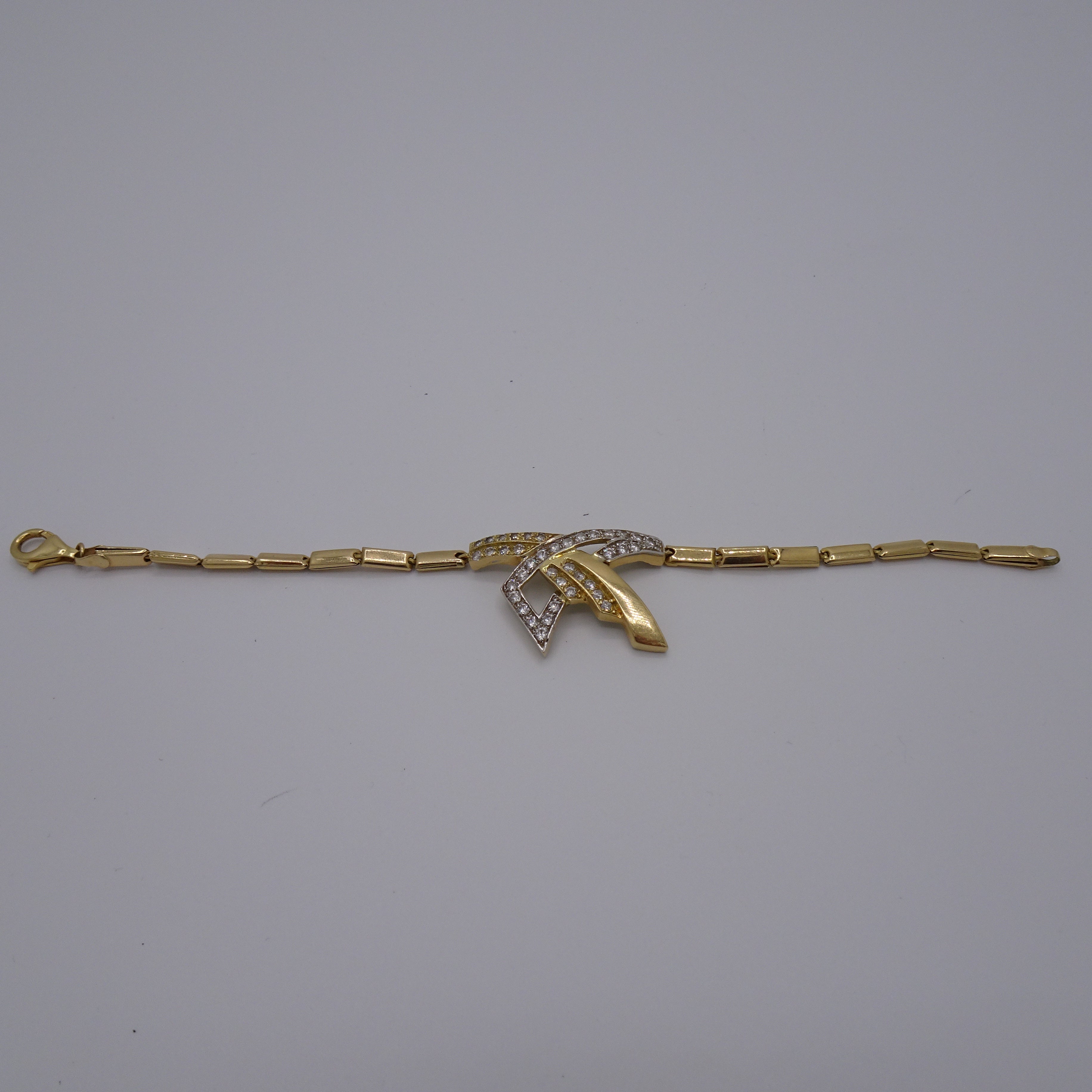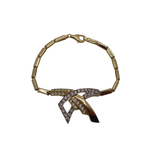 Bracelet maillon en or jaune 18 carats (750/1000), poinçonné 750. Maille rectangle sertie de 38 oxydes de zirconium taille brillant pour une brillance élégante. Longueur : 19 cm, largeur : 3,4 mm, épaisseur : 2 mm. Fermoir mousqueton. Poids : 8,52 g. En très bon état.