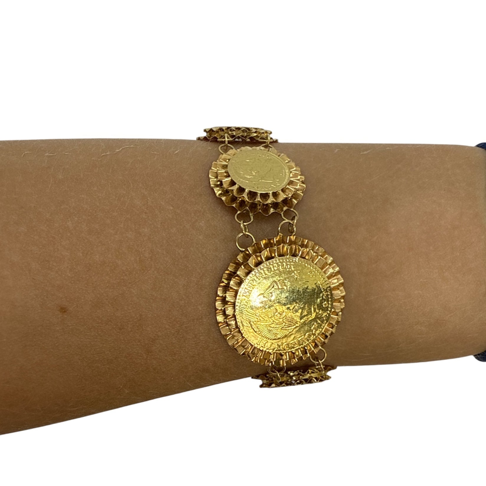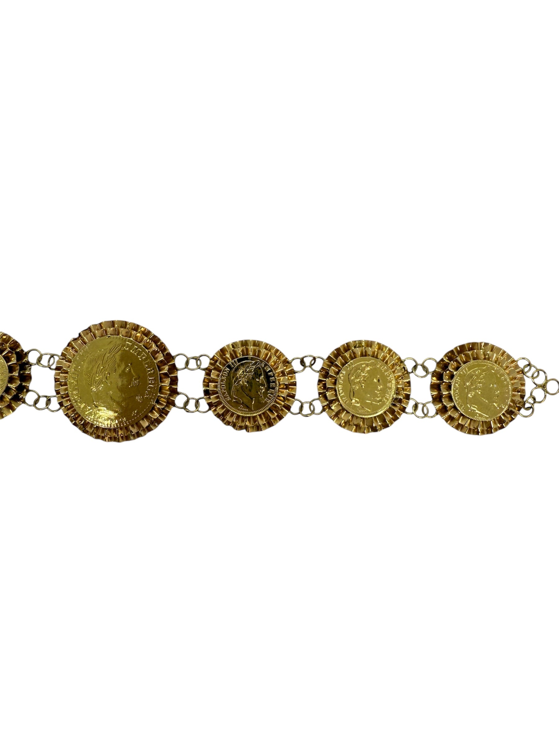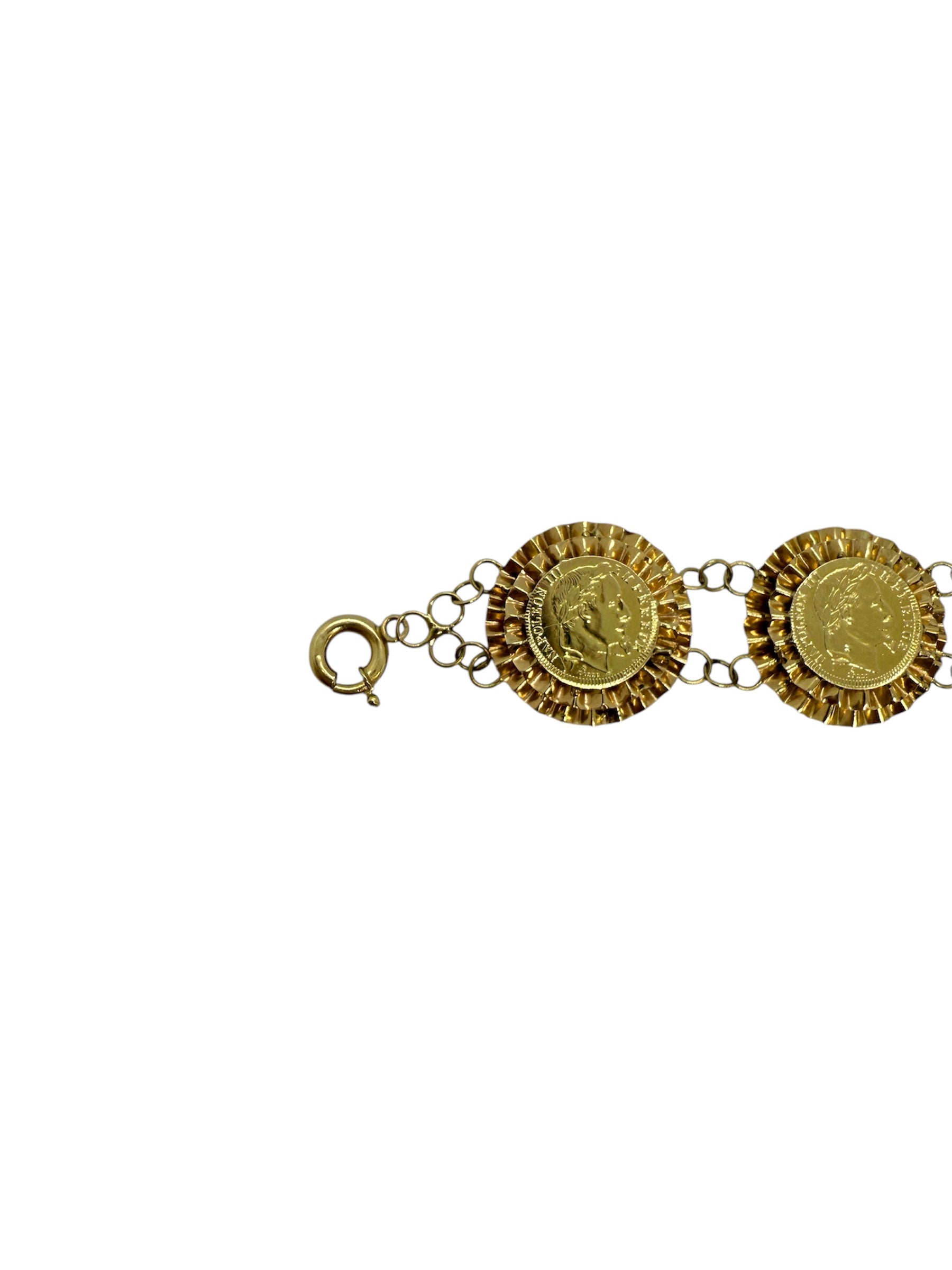 Bracelet de style Napoléon III, reproduction en or jaune 18 carats (750/1000), sans poinçon. Composé d’une maille jaseron large, il mesure 19 cm de long, 22 mm de large et 2 mm d’épaisseur, pour un poids de 10,48 grammes. Fermoir à anneau ressort. Une pièce élégante et distinctive, en très bon état.