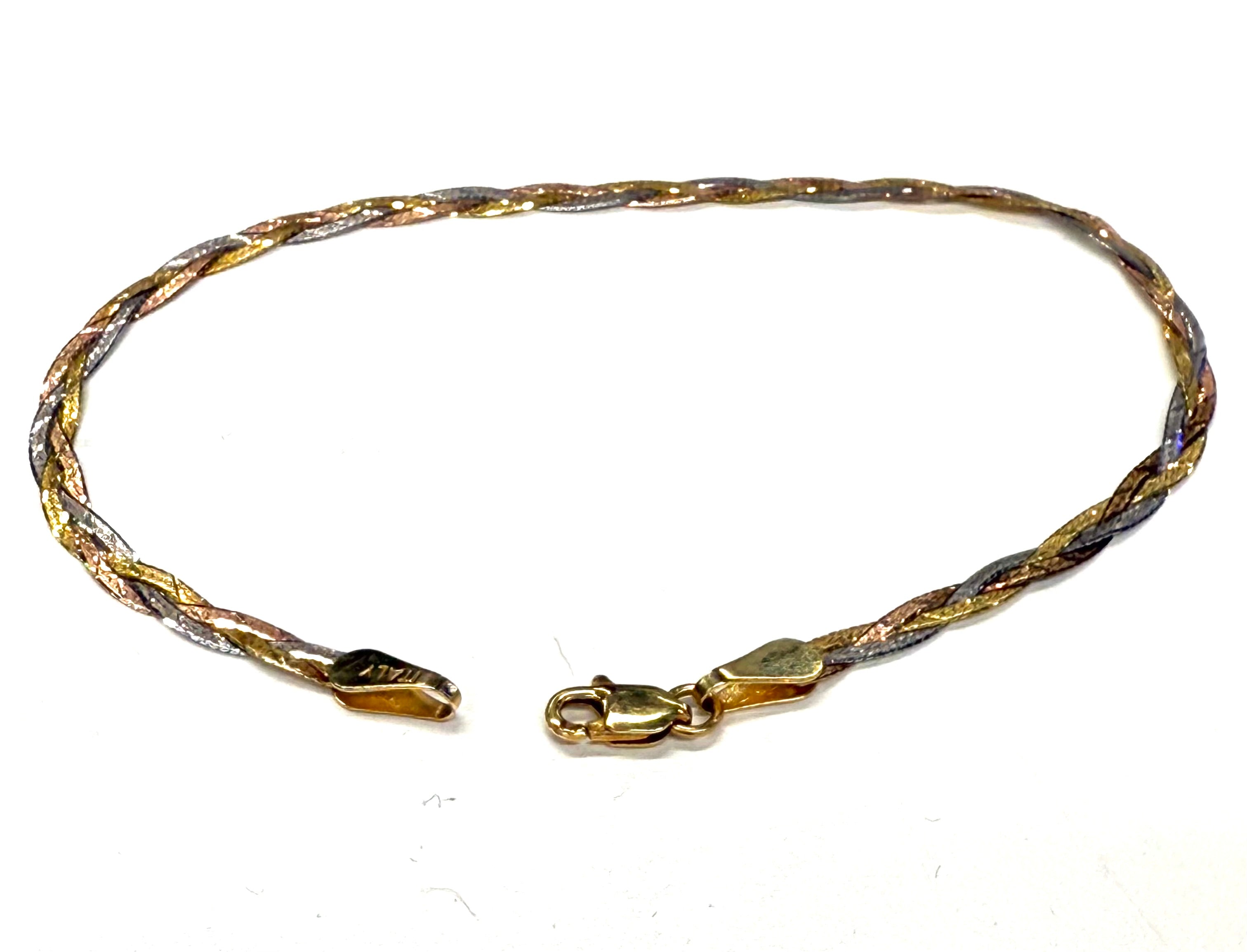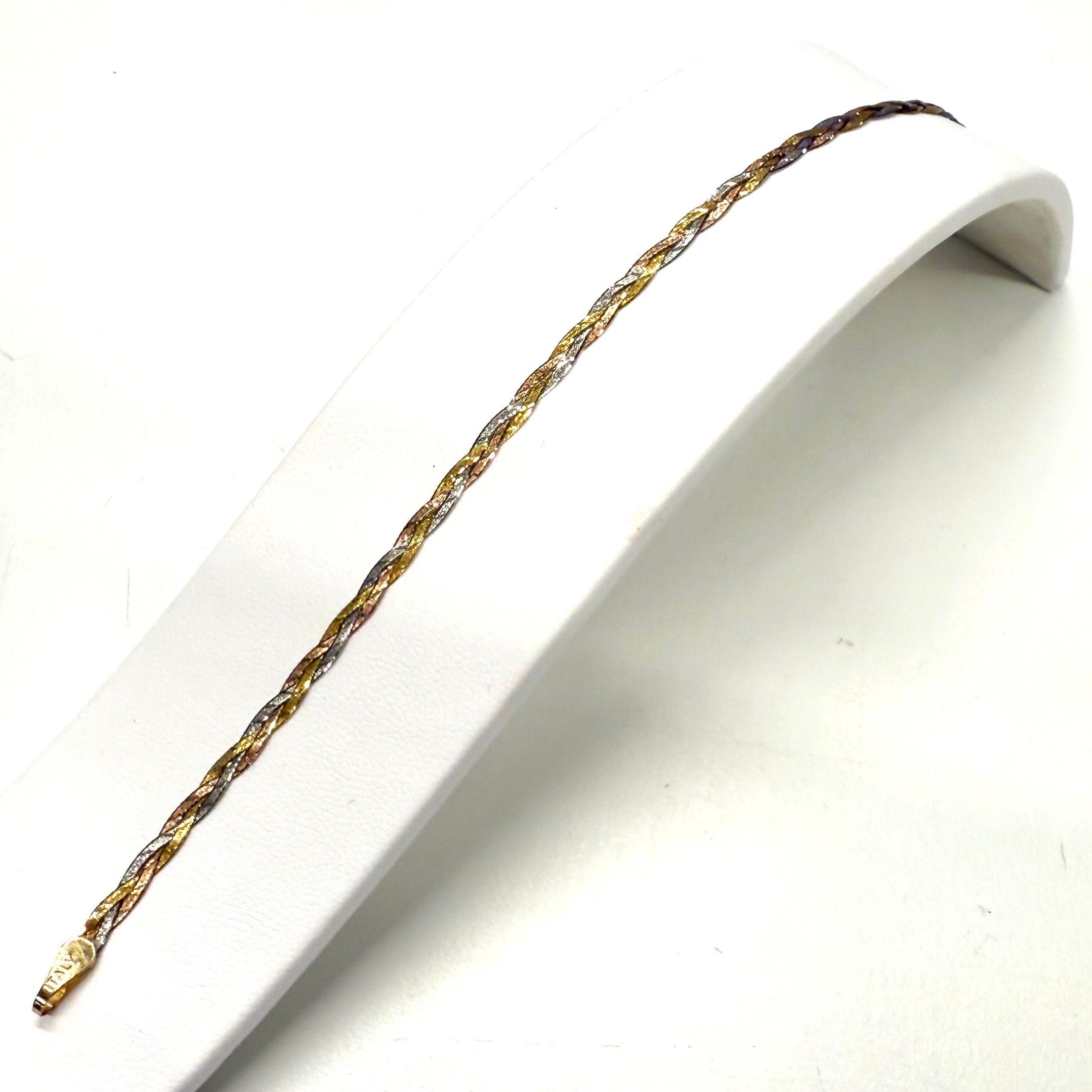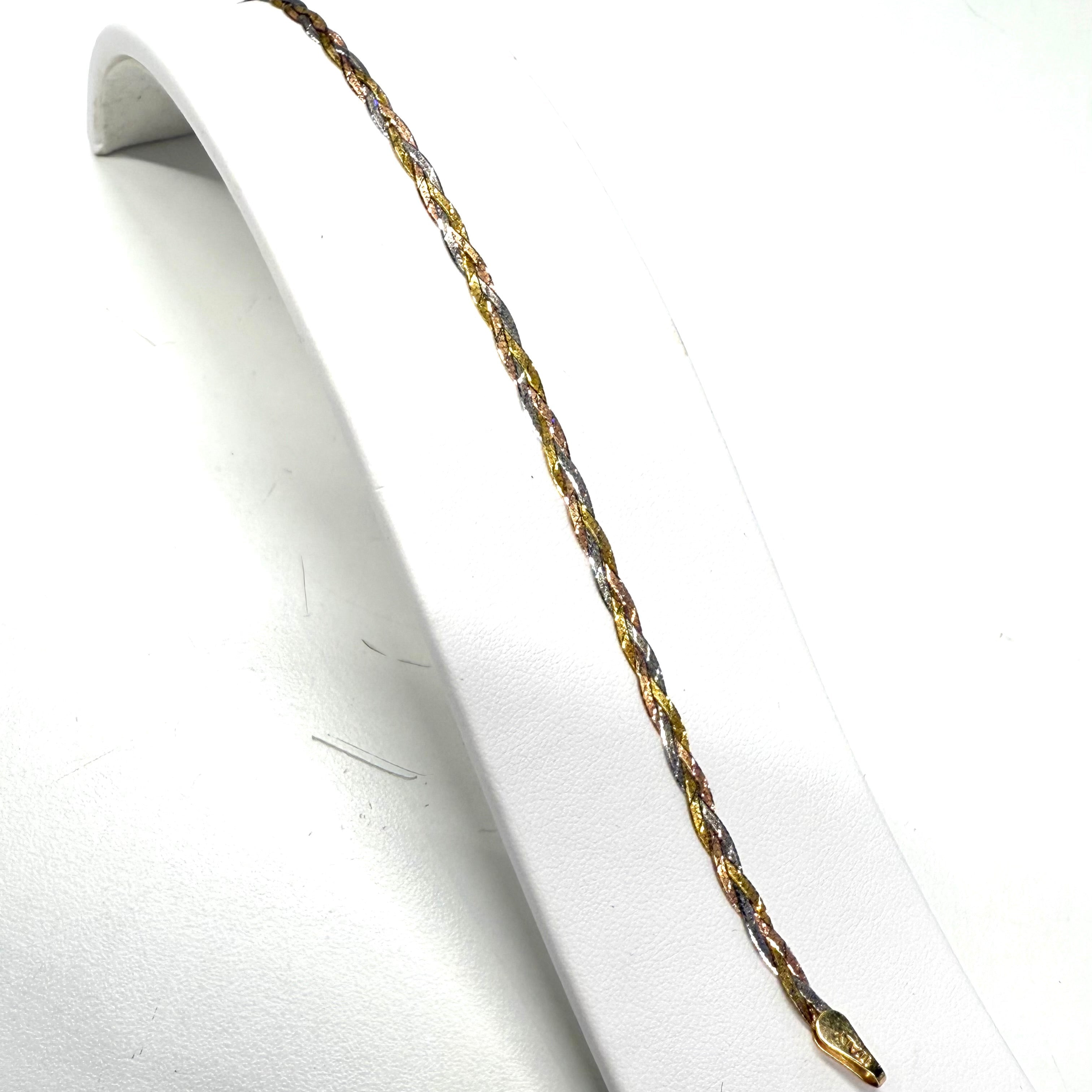 Bracelet tressé en or 18 carats (750/1000), associant harmonieusement or jaune, or blanc et or rose, poinçonné 750. Il mesure 19 cm de long, avec une largeur de 0,3 cm et une épaisseur de 0,1 cm. Son fermoir mousqueton assure un maintien sûr et discret.