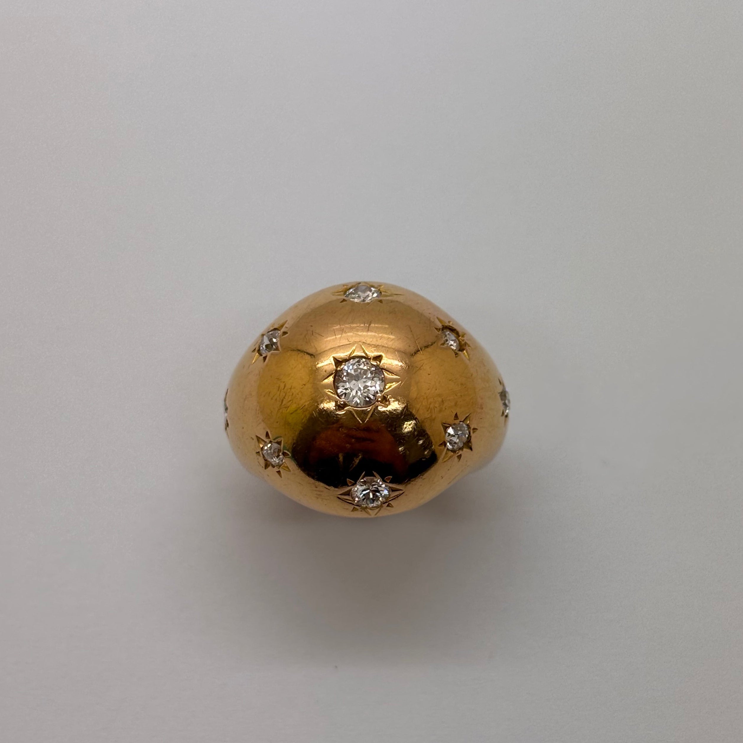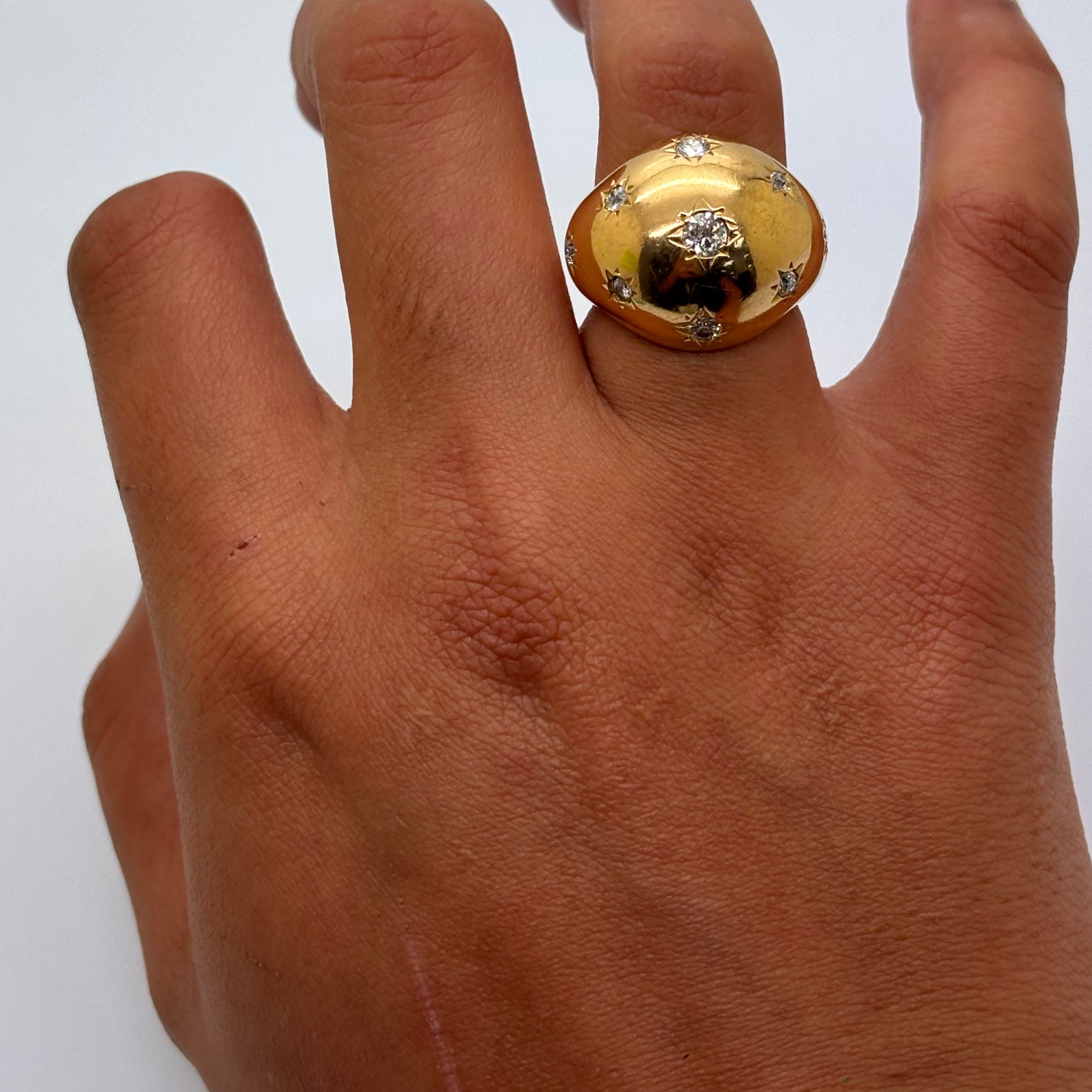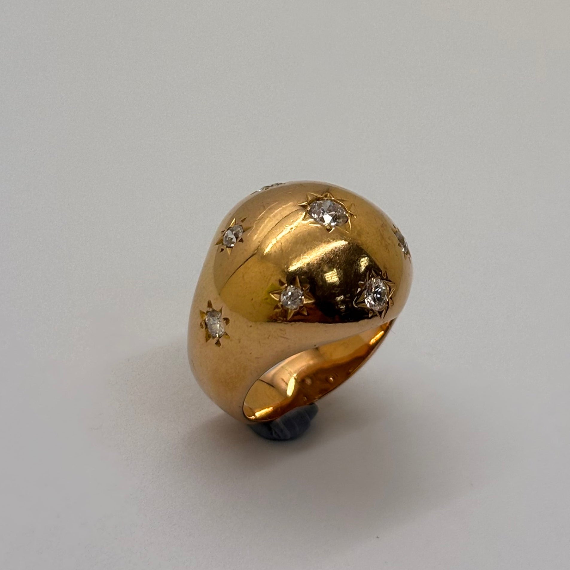 Chevalière en or jaune 18 carats (750/1000) ornée de 9 diamants. D’un poids de 11,13 grammes et de taille 53, cette bague présente un design classique avec une touche de brillance. Elle est en bon état général.