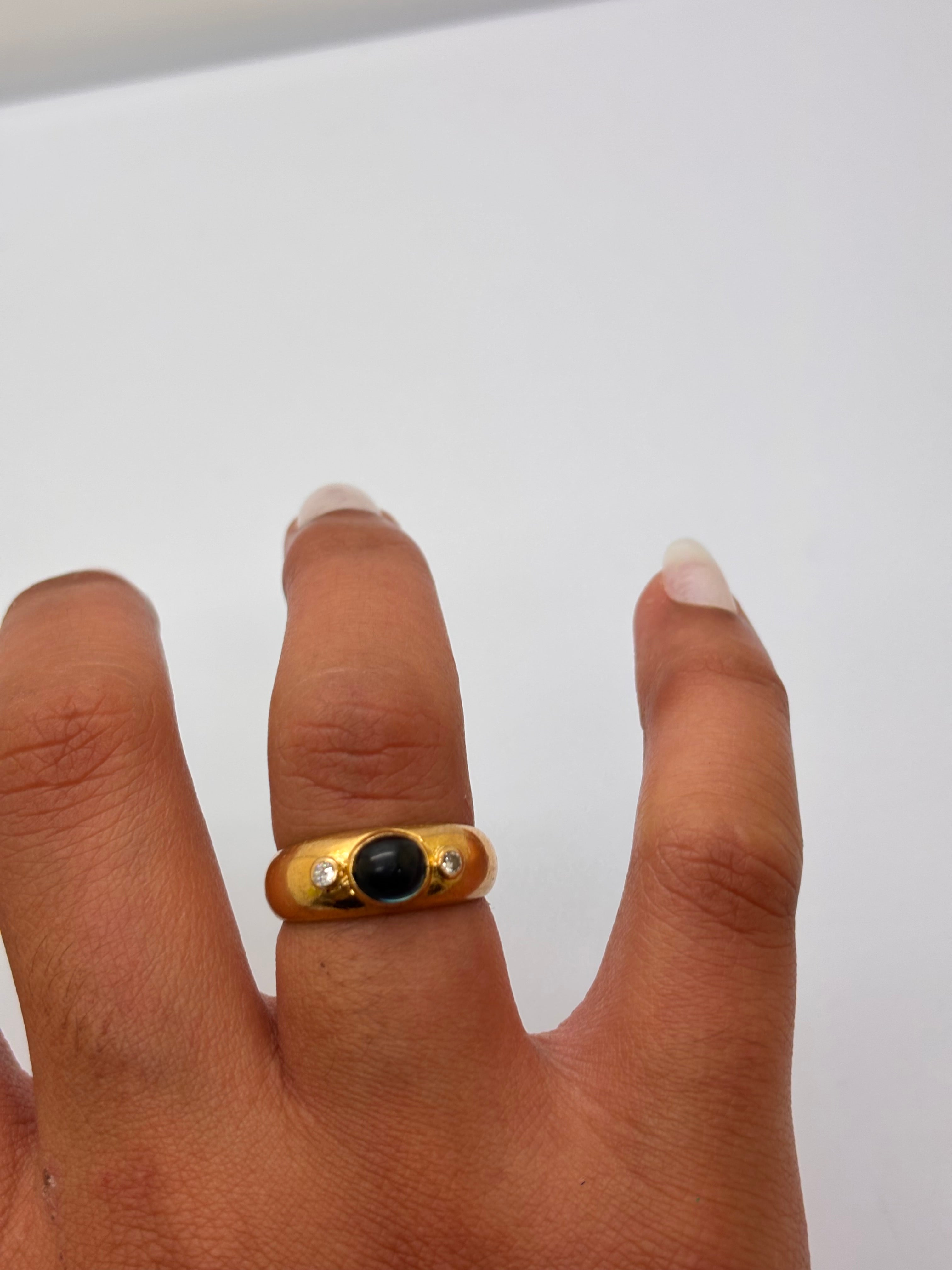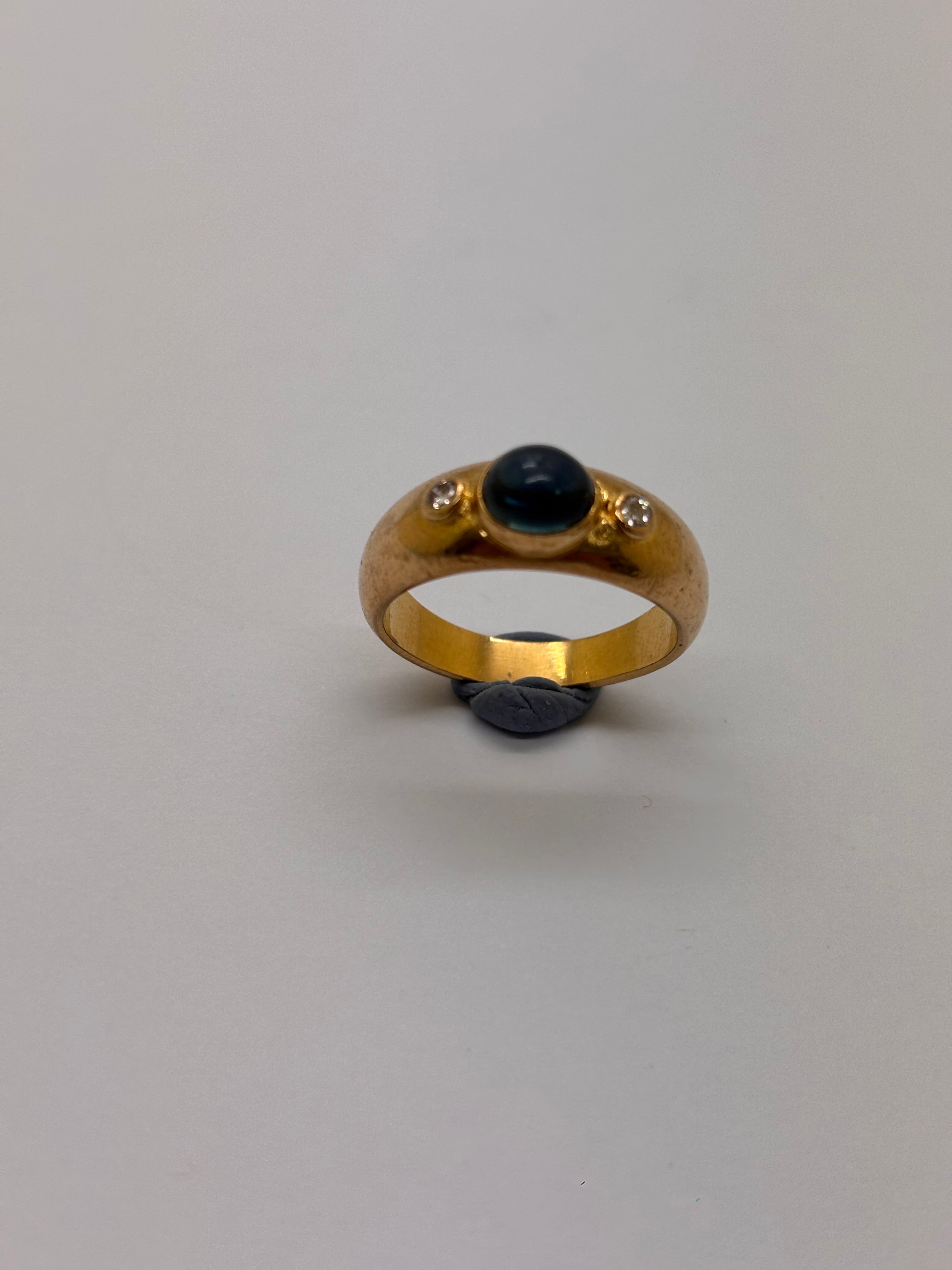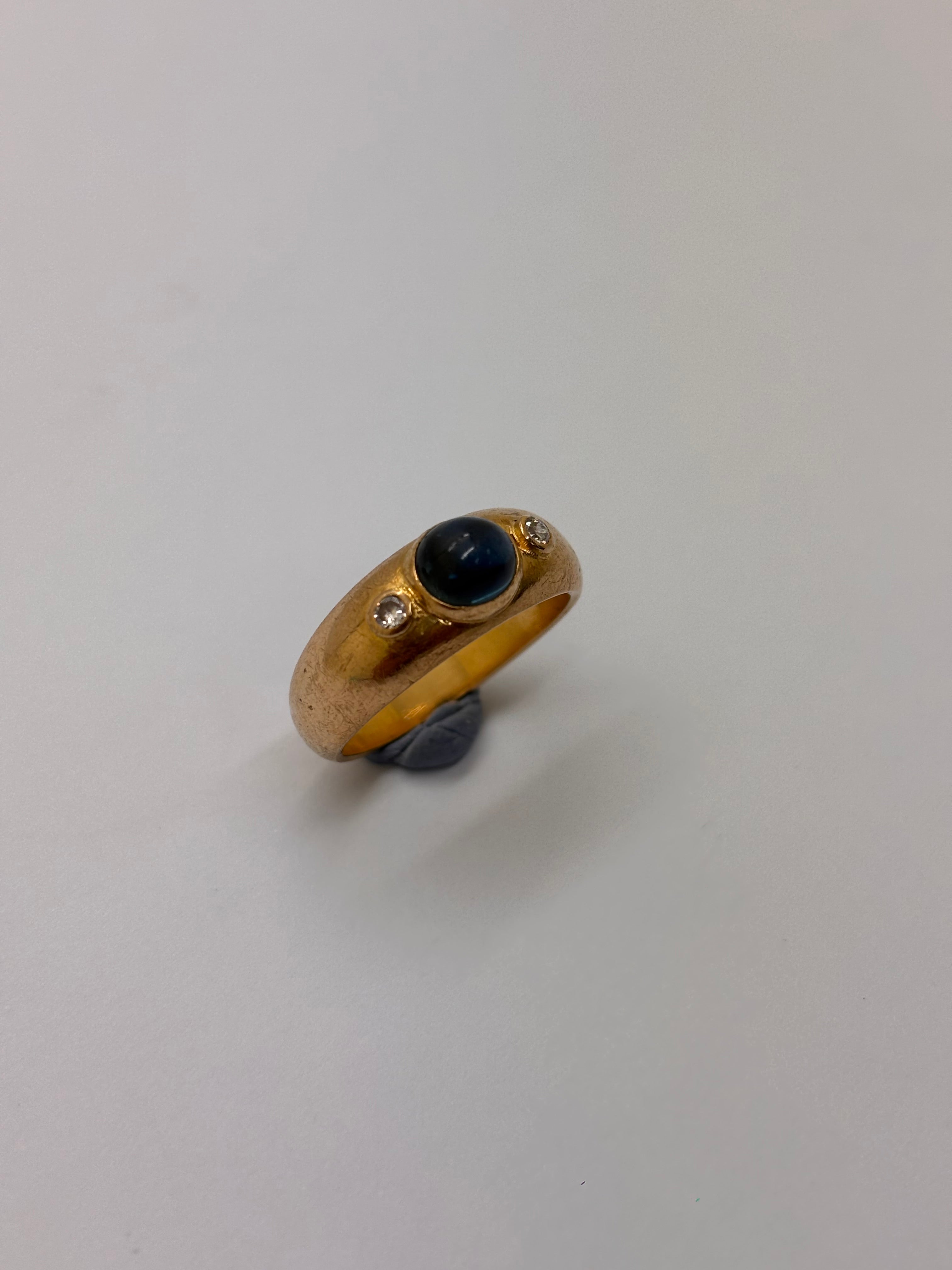 Chevalière en or jaune 18 carats (750/1000) est ornée de deux diamants et d’un saphir central, apportant une touche d'élégance à son design classique. D’un poids de 6,32 grammes, elle est proposée en taille 51,5.