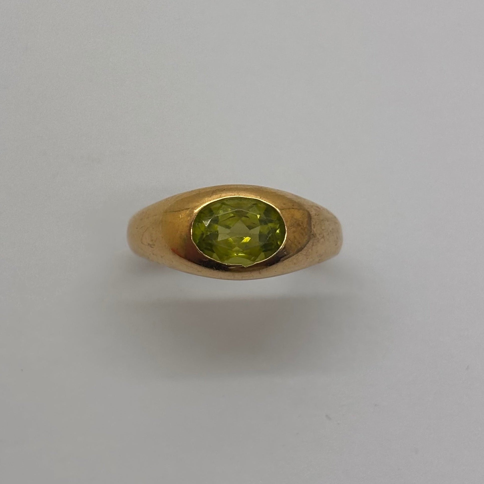 Bague chevalière empierrée en or jaune 18K, taille 53, poids 2,22 g, sertie d’un péridot.