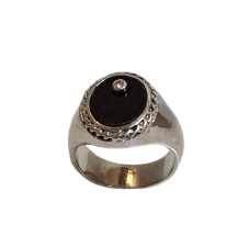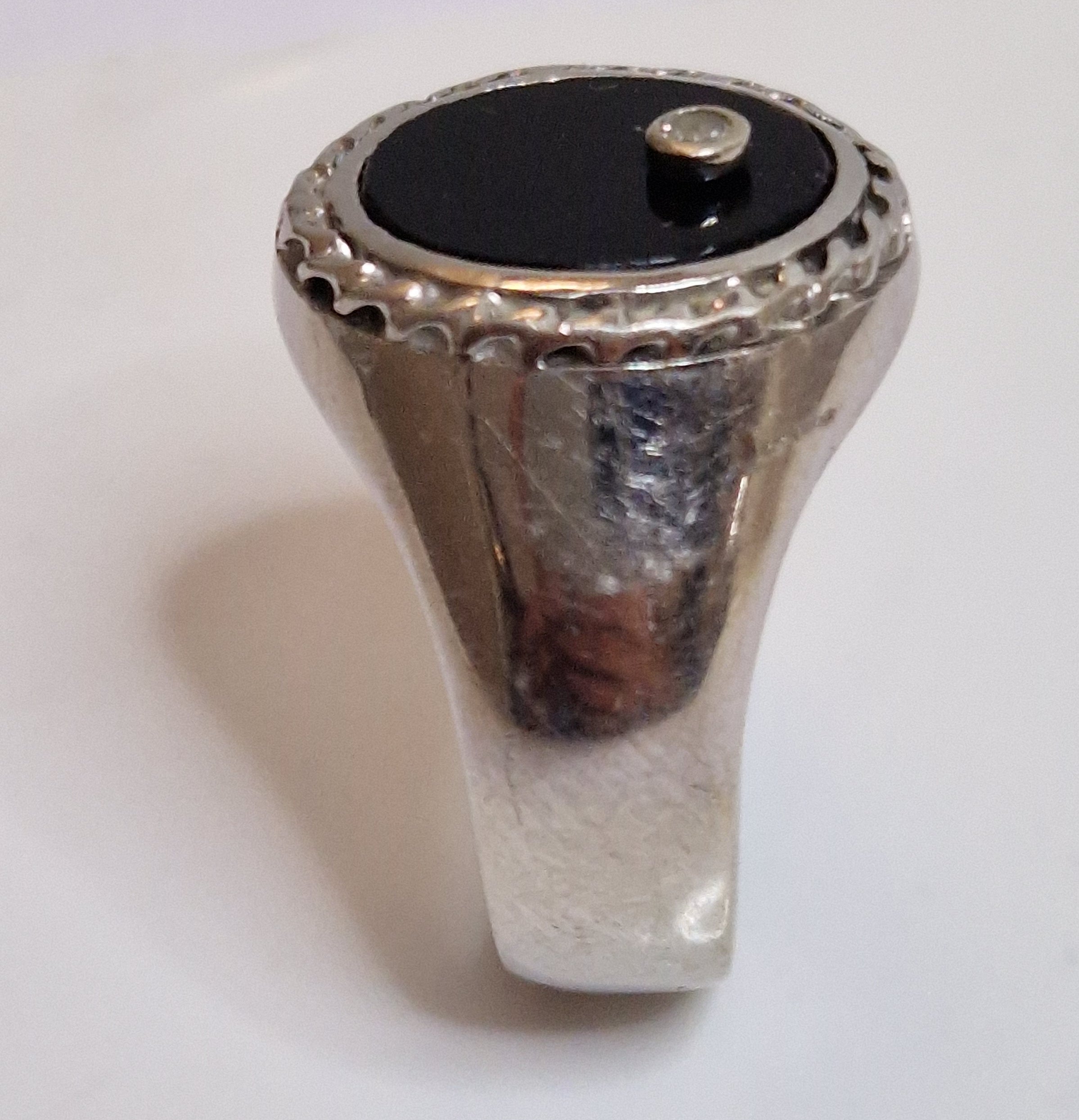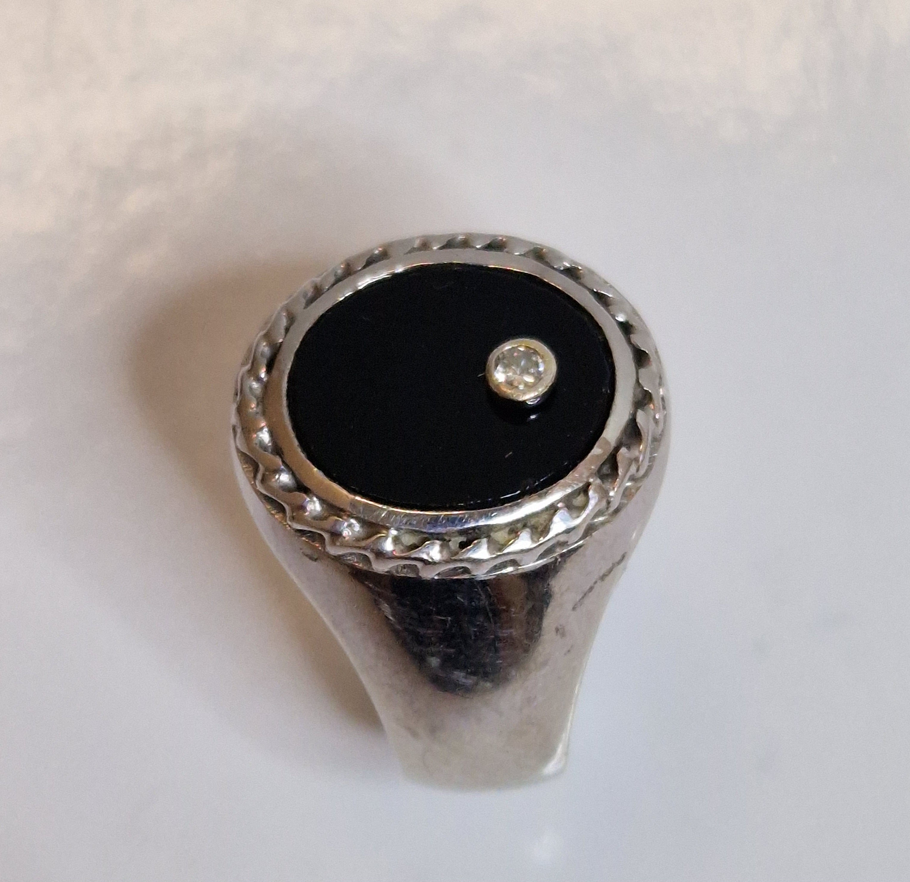 Chevalière homme en or 750/1000, plateau onyx avec diamant centrale . Bordure ciselée élégante. Un classique chic et intemporel.