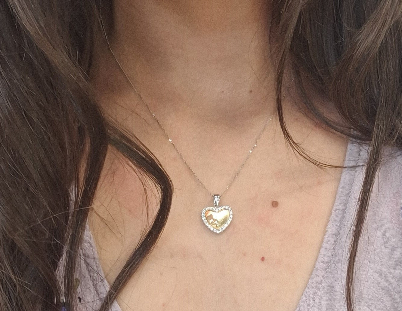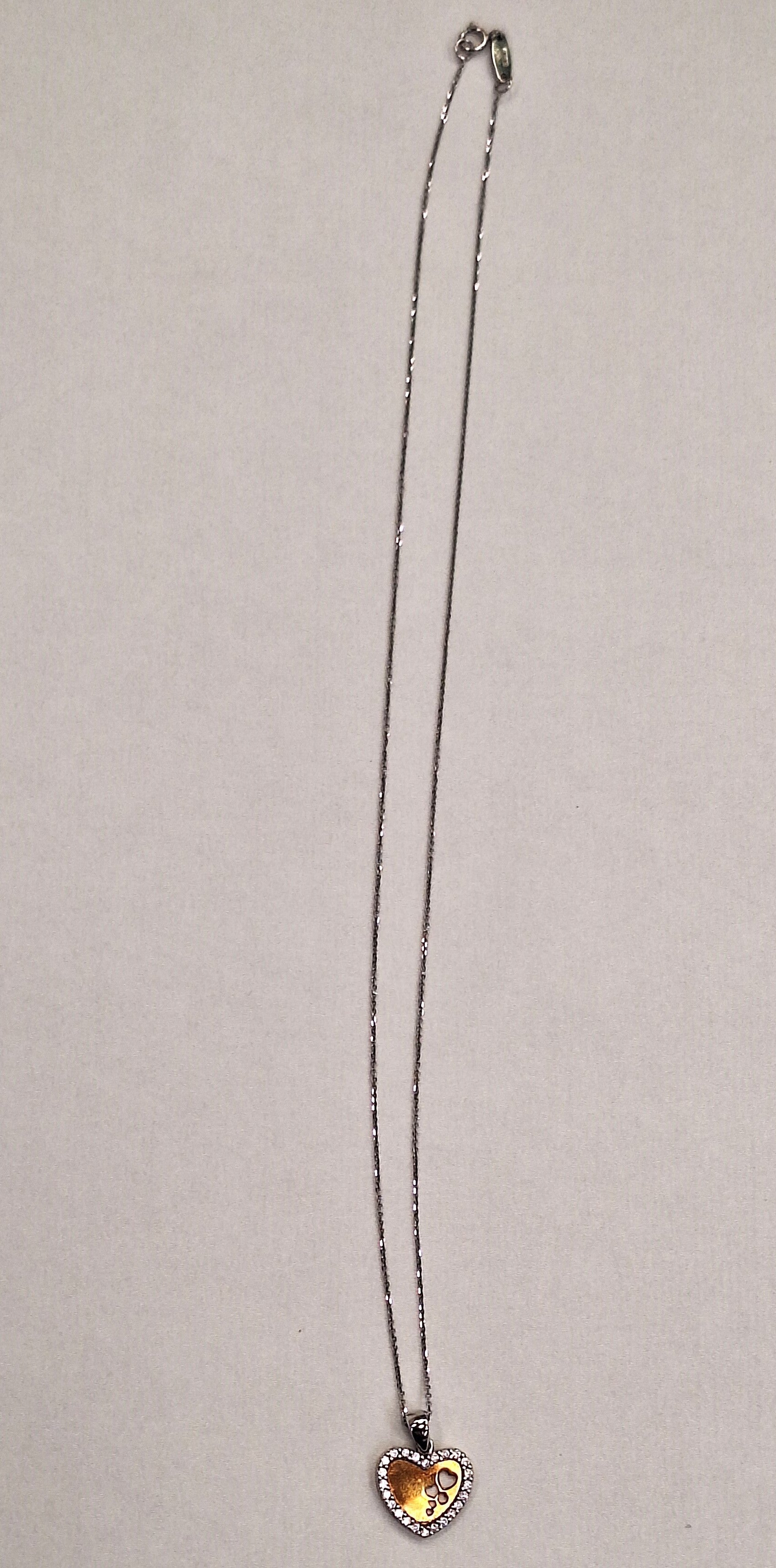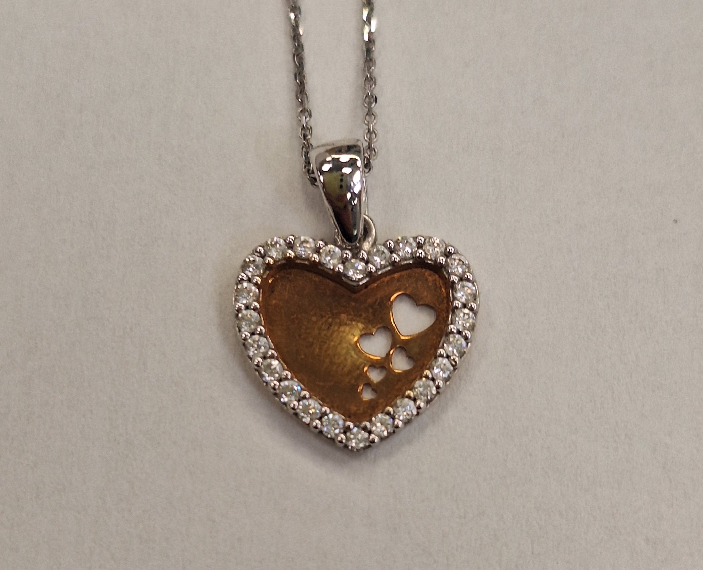 Très joli collier princesse en or blanc 18 carats serti d'un pendentif en forme de coeur en or blanc, et fond en or jaune 18 carats entourée de 24 oxydes de zirconium.
