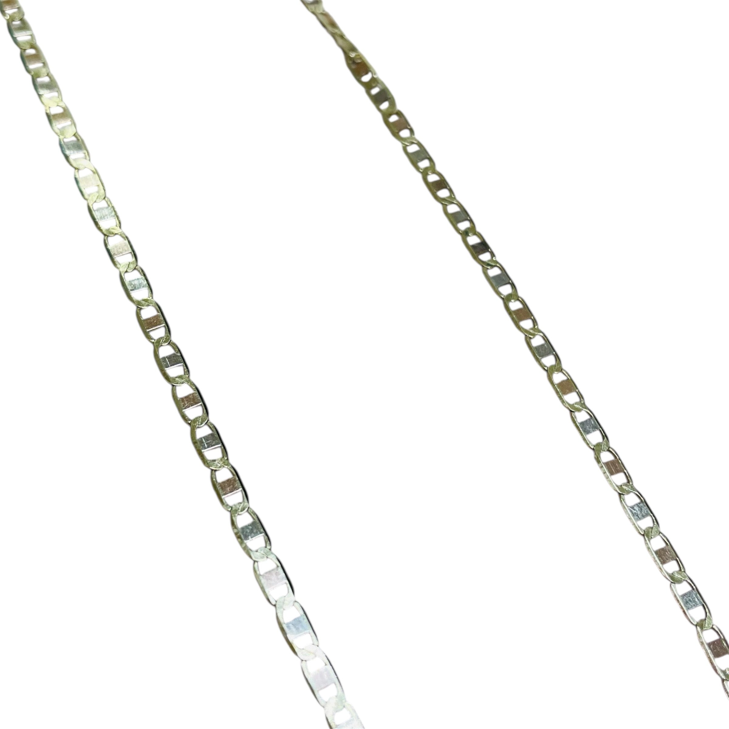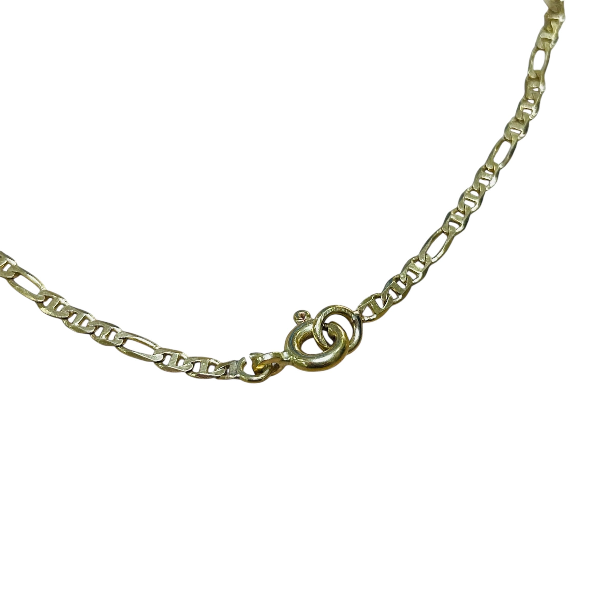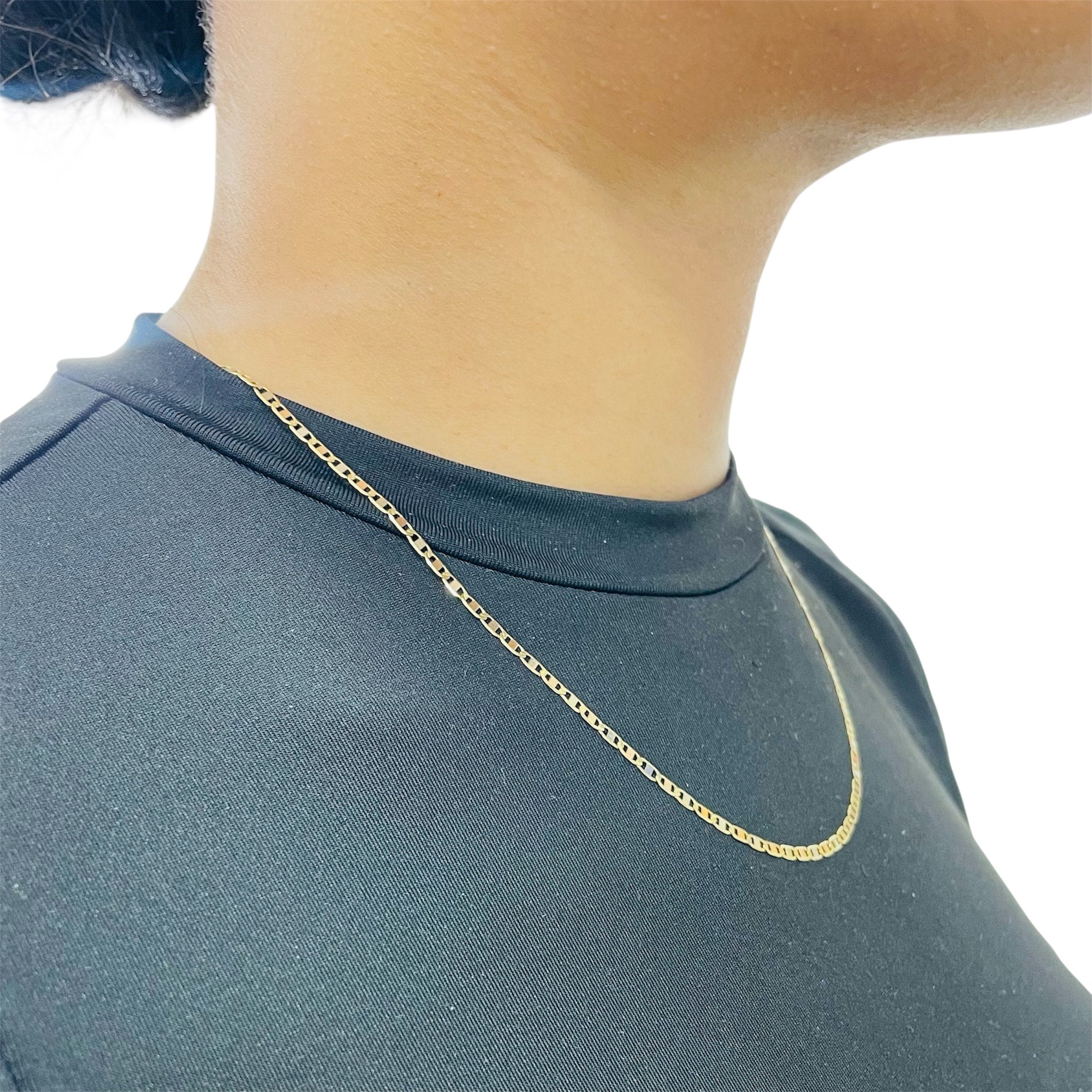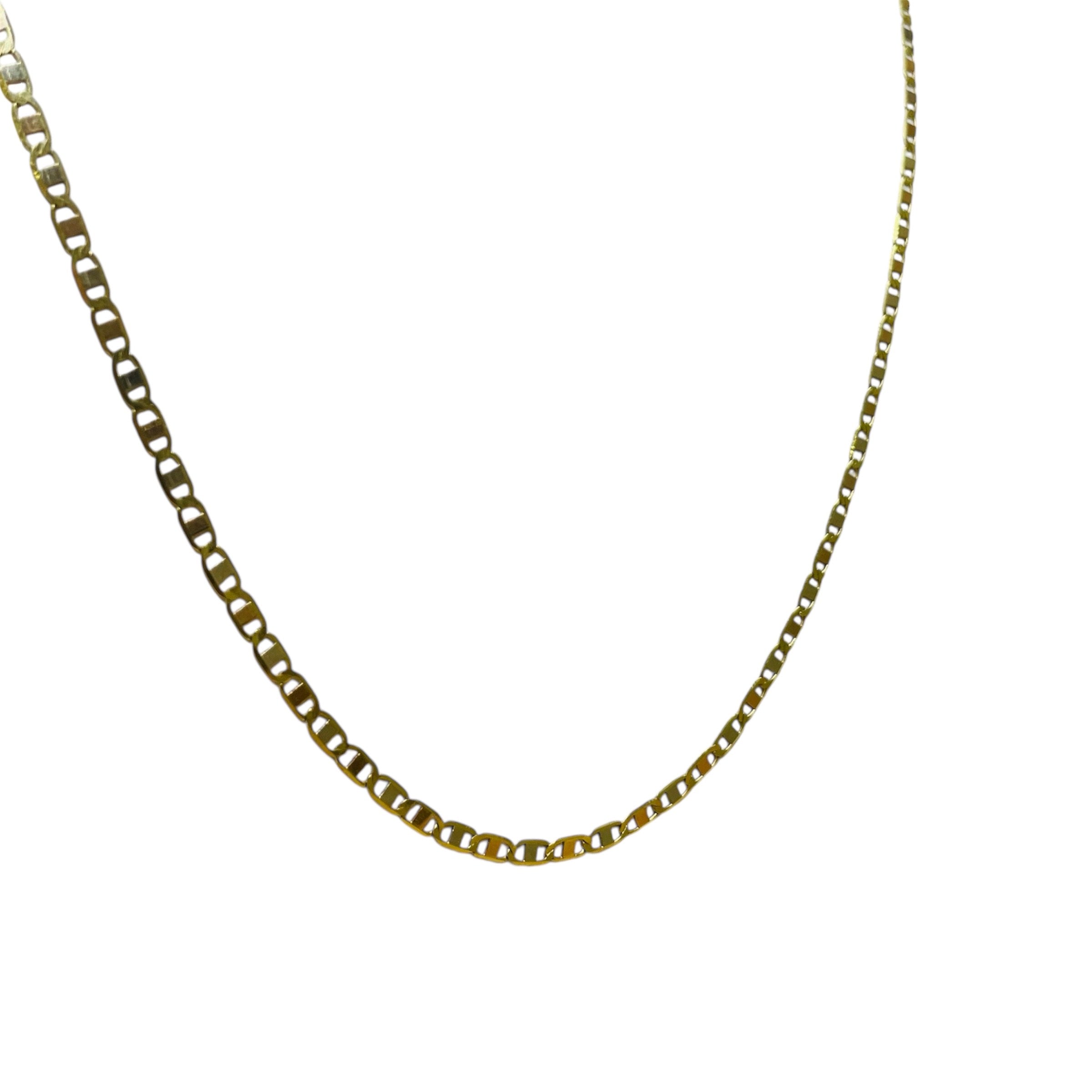 Collier chaîne en or jaune 18 carats (750/1000), maille marine fine. Poinçonné 750. Longueur : 51 cm ; largeur et épaisseur : 1 mm. Poids : 2,85 g. Fermoir anneau‑ressort. Sans pierre. Bon état.
