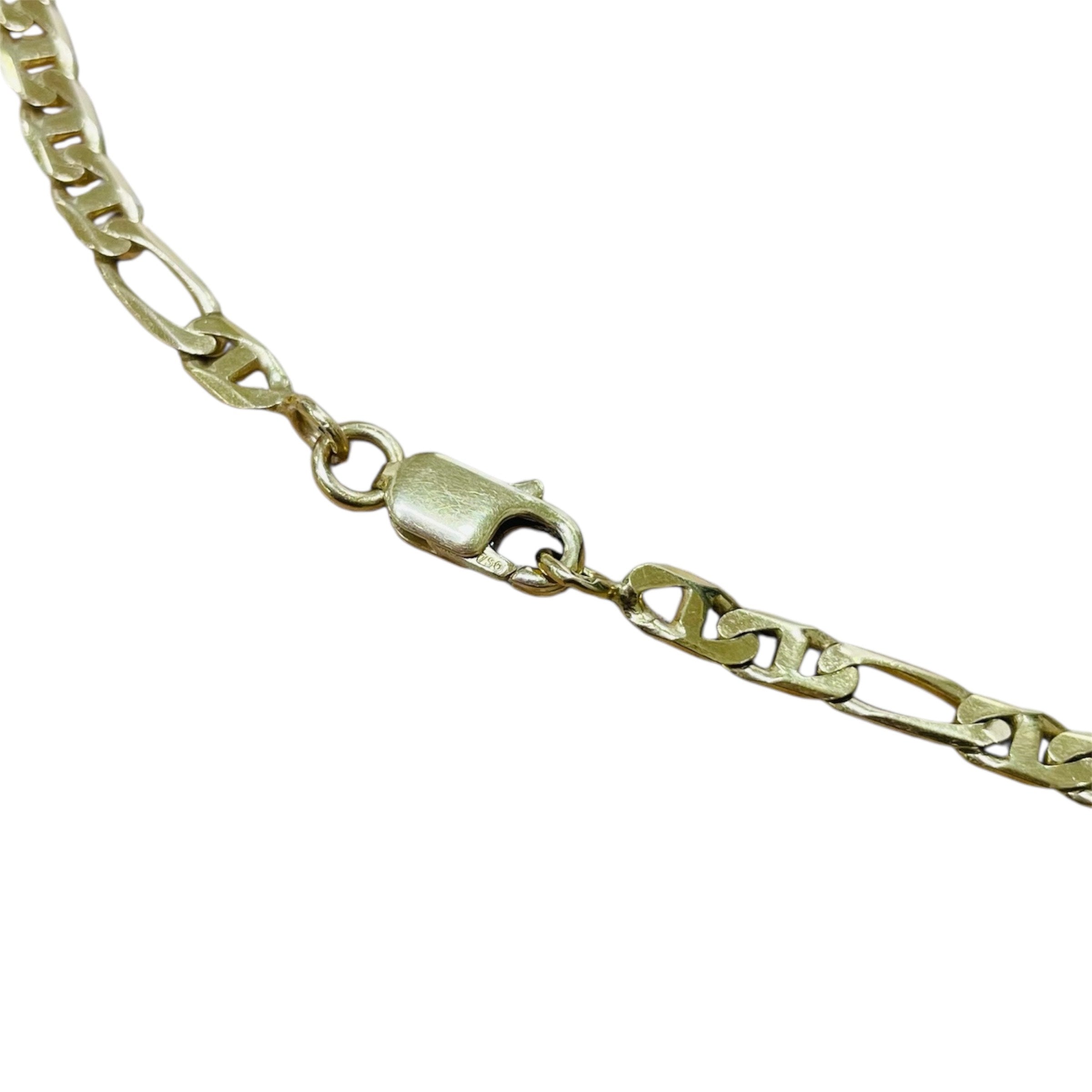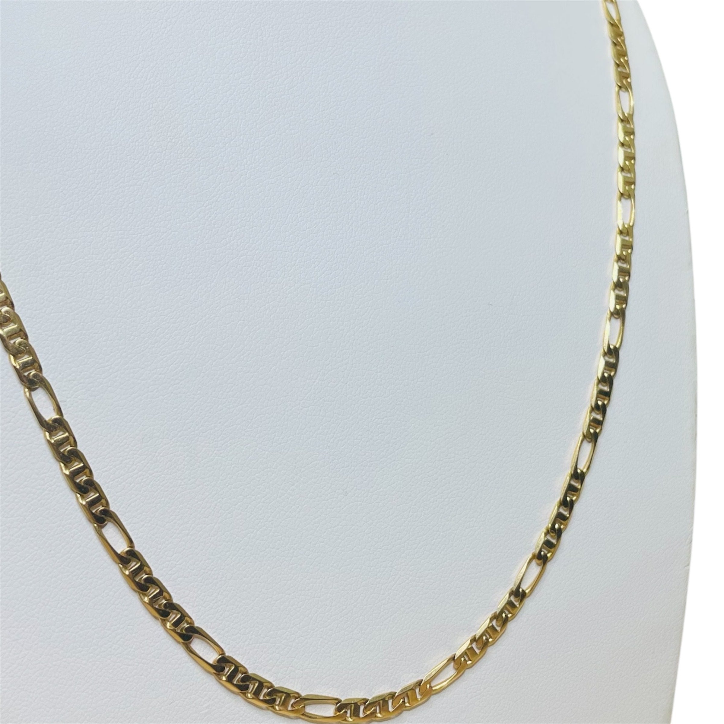 Chaîne de type Figaro en or jaune 18 carats (750/1000), poinçonnée 750, en bon état. Ce modèle mesure 65,07 cm de long, avec une largeur de 3 mm et une épaisseur de 1 mm, pour un poids de 16,66 grammes. Équipé d’un fermoir mousqueton sécurisé.