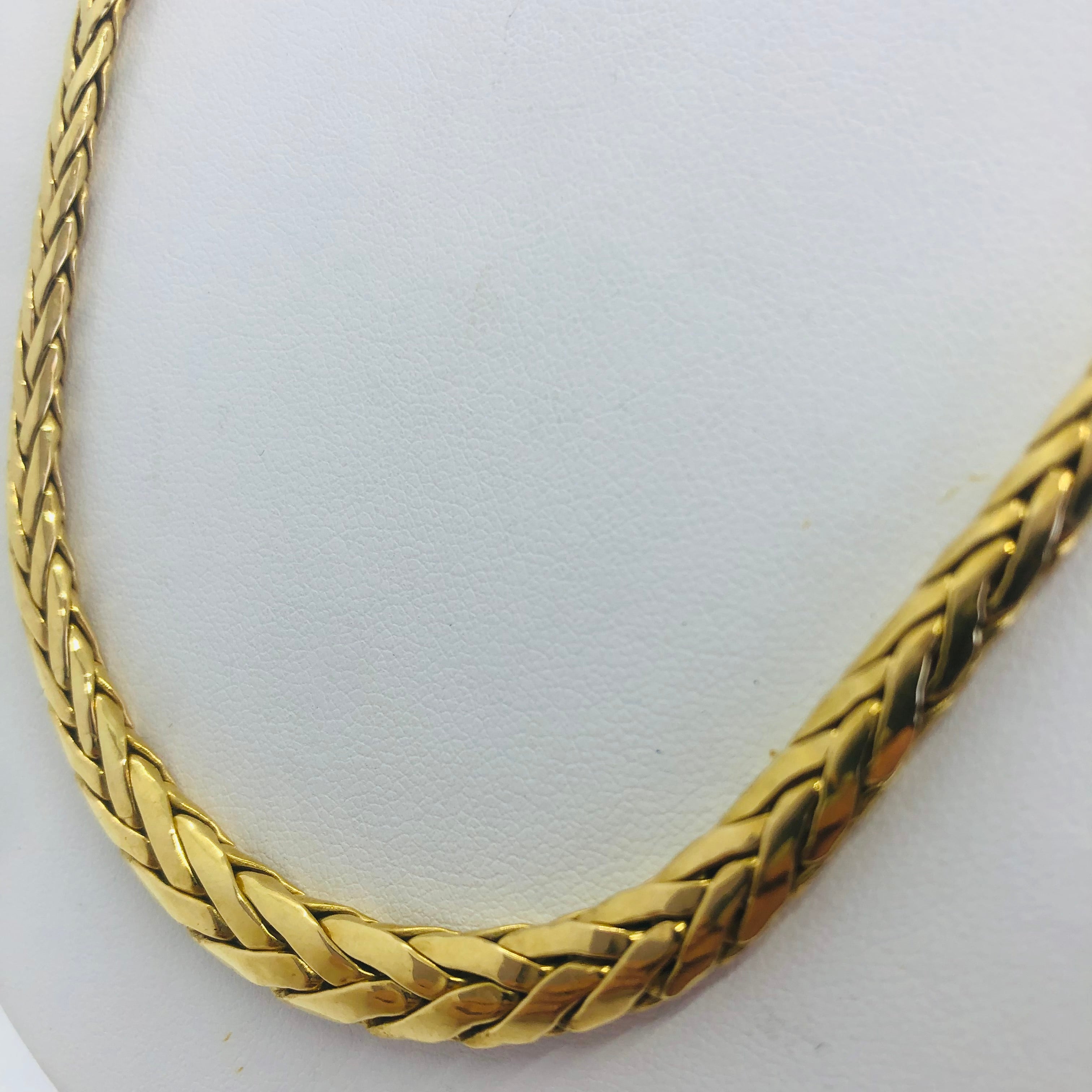 Ce collier en or jaune 18 carats (750/1000), poinçonné 750, séduit par sa maille anglaise élégante et structurée, symbole de raffinement discret. Avec un poids généreux de 20,11 grammes et une longueur de 49,5 cm, il assure une belle présence tout en restant confortable au porté. Le mousqueton est légèrement ouvert.