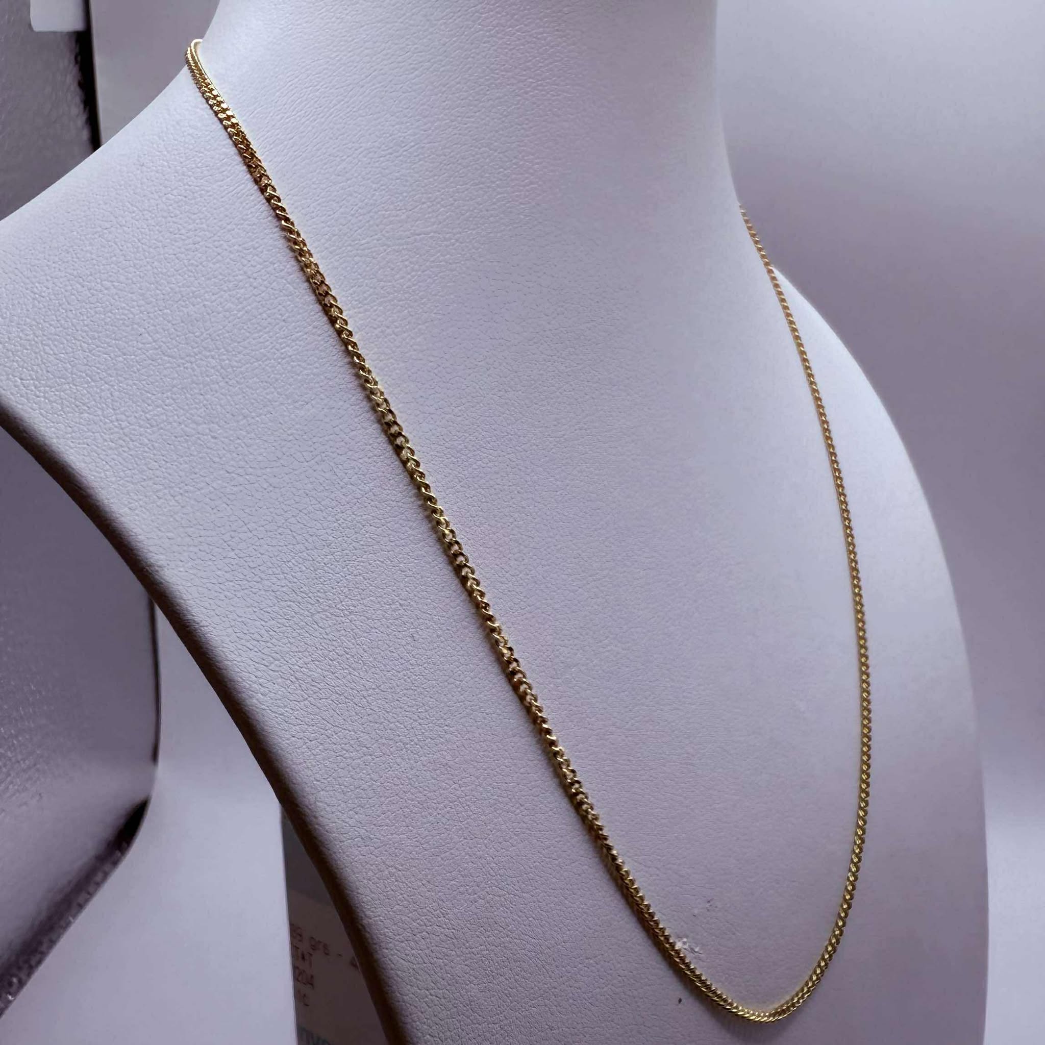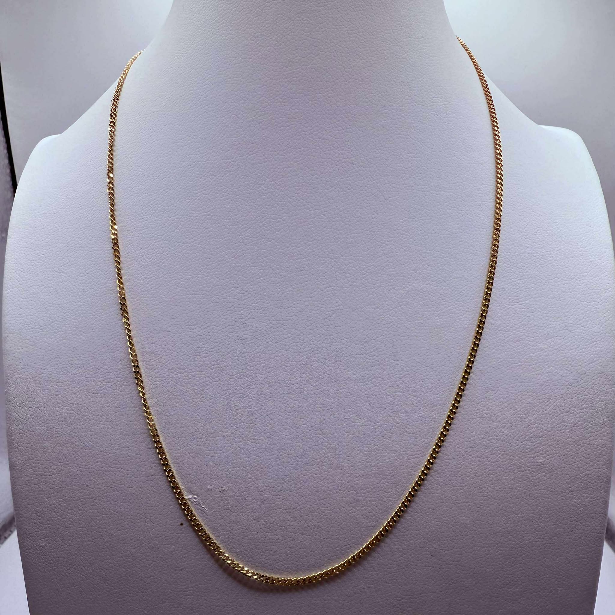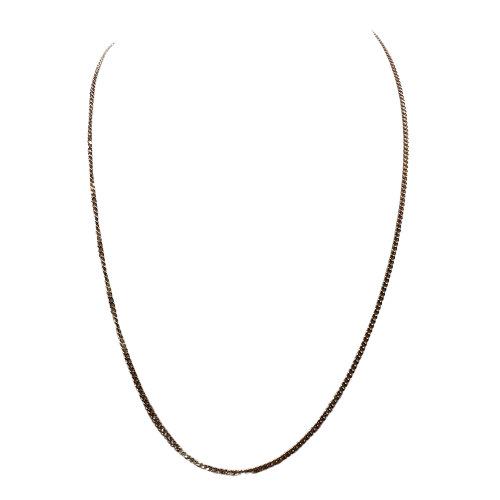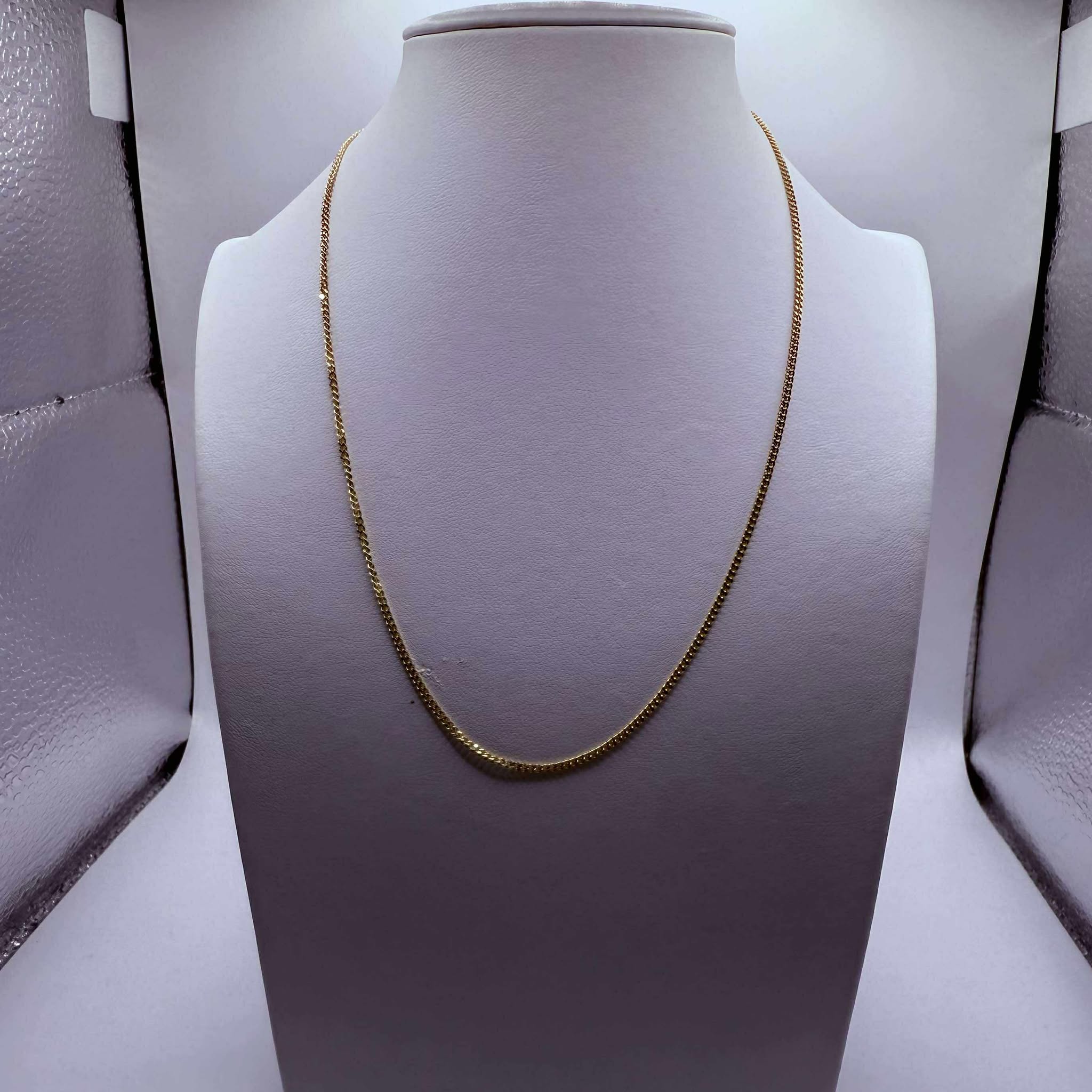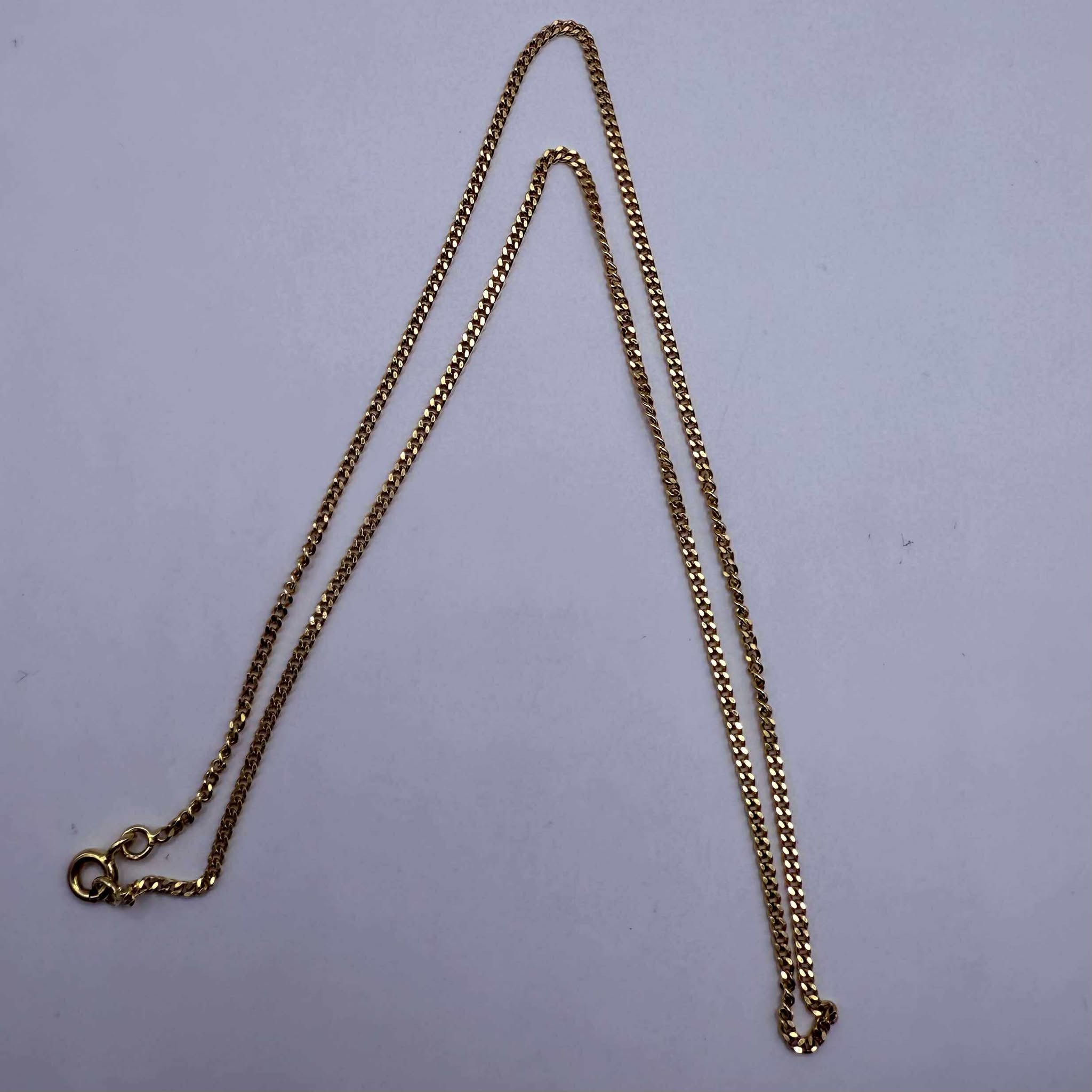 Collier de type matinée en or jaune 18 carats (750/1000), sans poinçon, avec maille forçat. Il pèse 3,89 grammes et mesure 40,5 cm de long, pour une largeur de 2 mm et une épaisseur de 1 mm. Fermoir à anneau ressort. Sans pierres. Bon état.