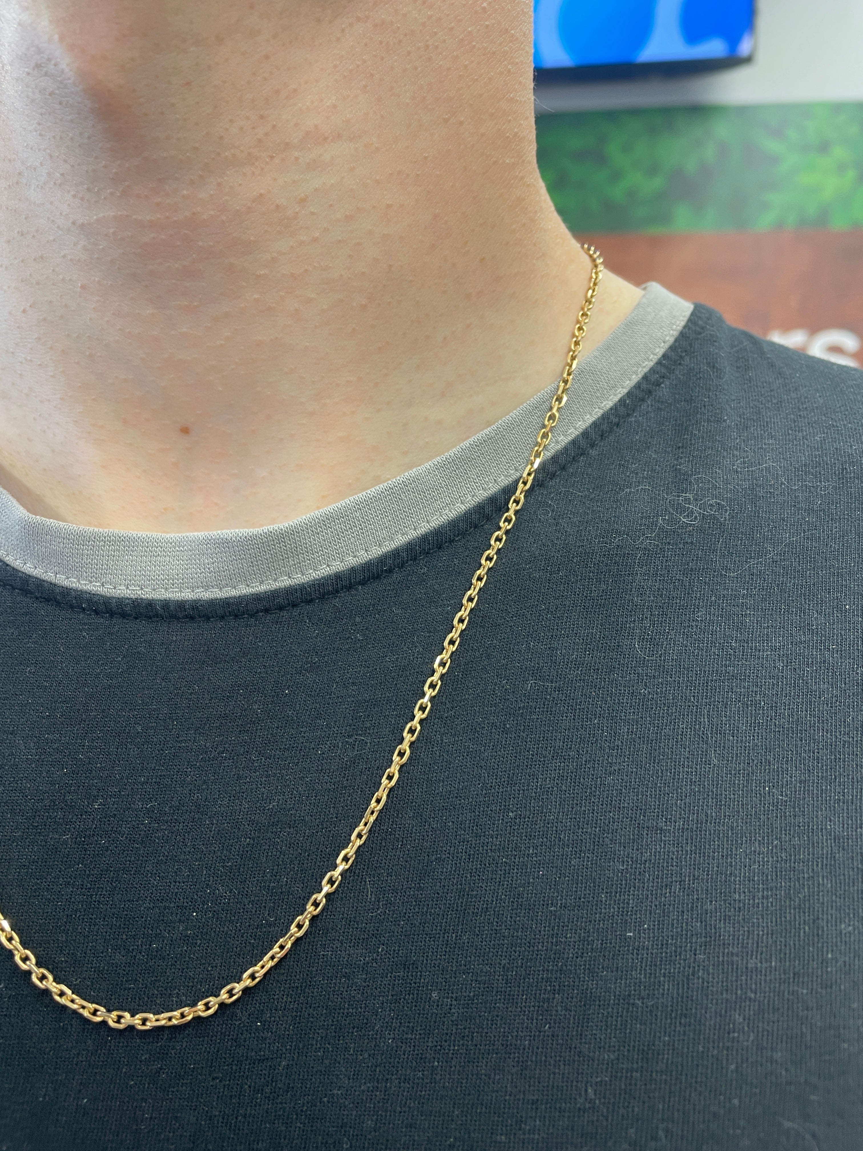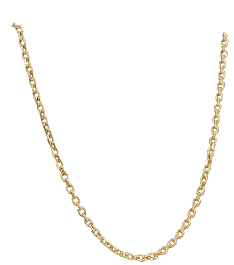 Collier de type Matinée en or jaune 750/1000 (18 carats), avec maille forçat et fermoir à anneau ressort. Il est poinçonné Tête d’Aigle, gage de qualité. Sans pierre, il mesure 55 cm de long, pour un poids de 12,01 g et une épaisseur de 4 mm. Il est en très bon état.