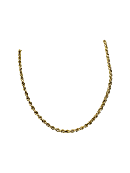 Collier de type matinée en or jaune 18 carats (750/1000), poinçonné Tête d’Aigle, avec une maille corde élégante et travaillée. Il mesure 62 cm de long, pour une largeur et une épaisseur de 4 mm, et se ferme à l’aide d’un fermoir mousqueton solide et pratique.