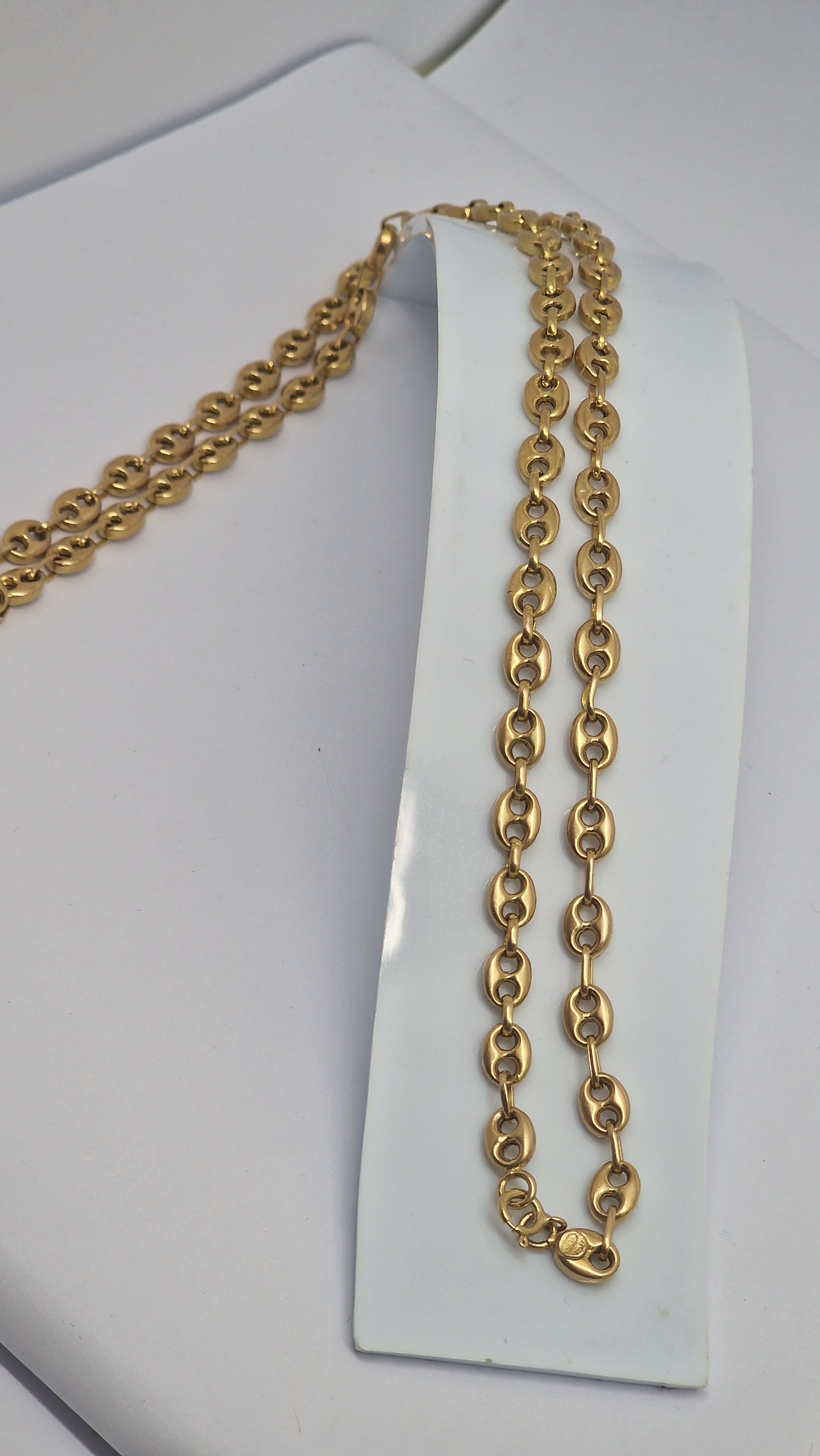 Collier matinée en or jaune 750/1000 (18 carats) composé d’une maille grain de café. Il est doté d’un fermoir à anneau ressort et porte le poinçon 750. Le bijou pèse 22,53 g, mesure 65,2 cm de longueur, 1,1 cm de largeur et 2 mm d’épaisseur. Il est présenté en très bon état.