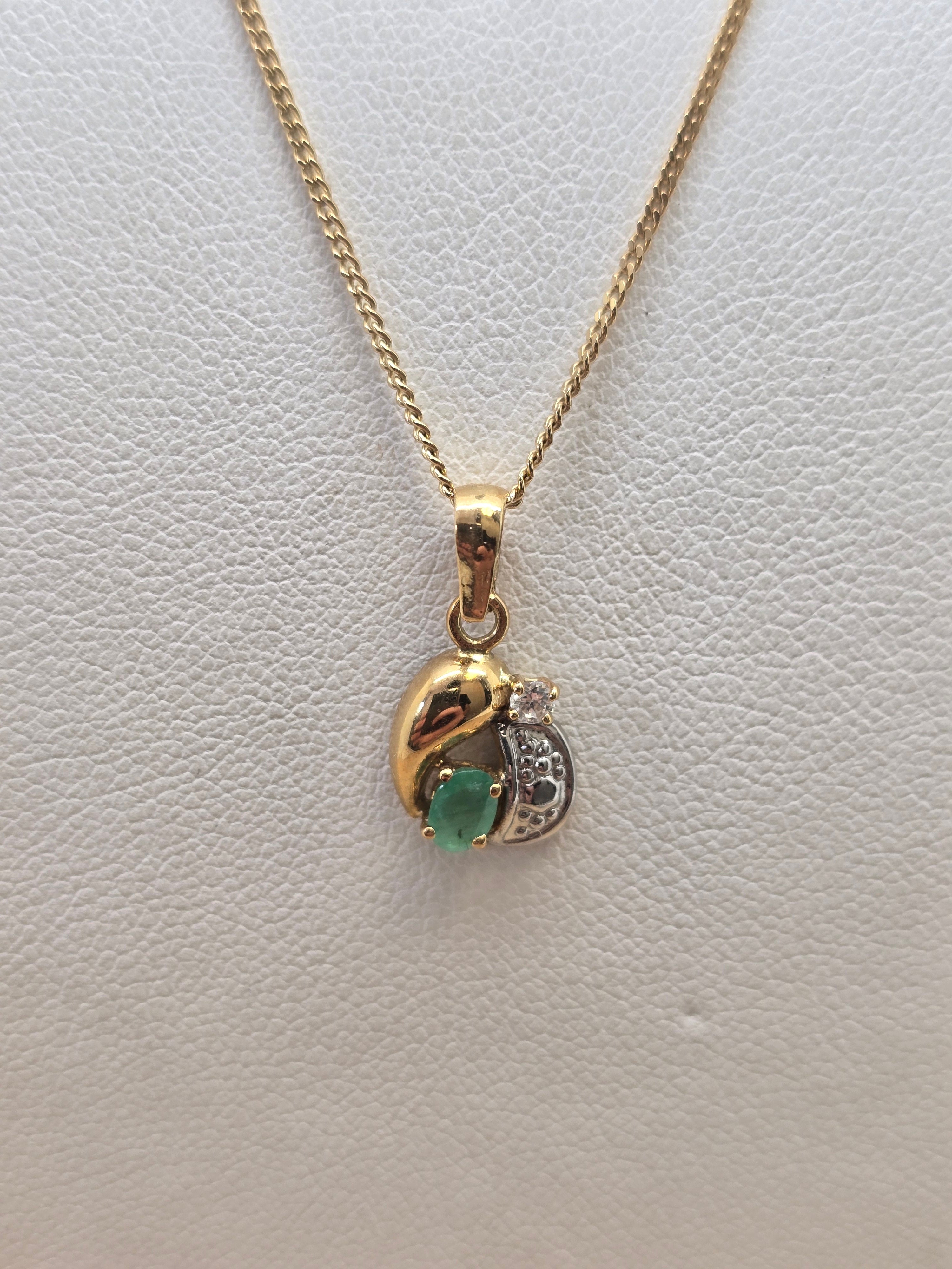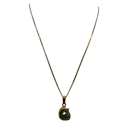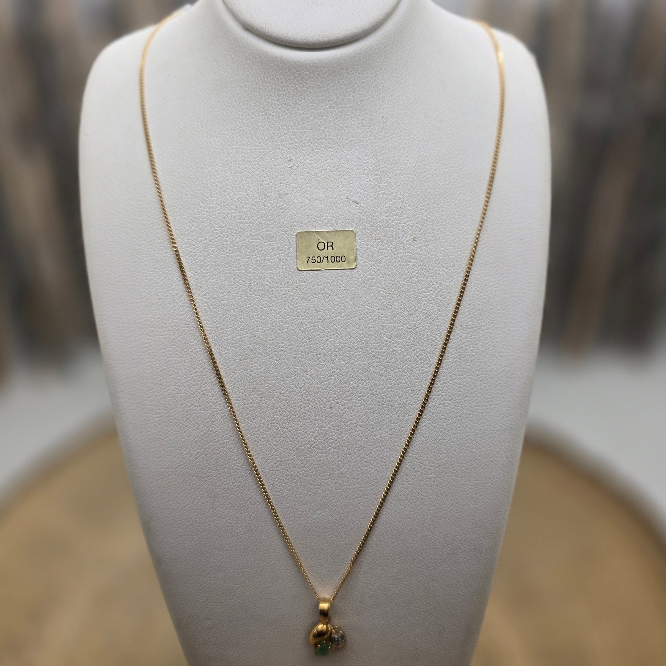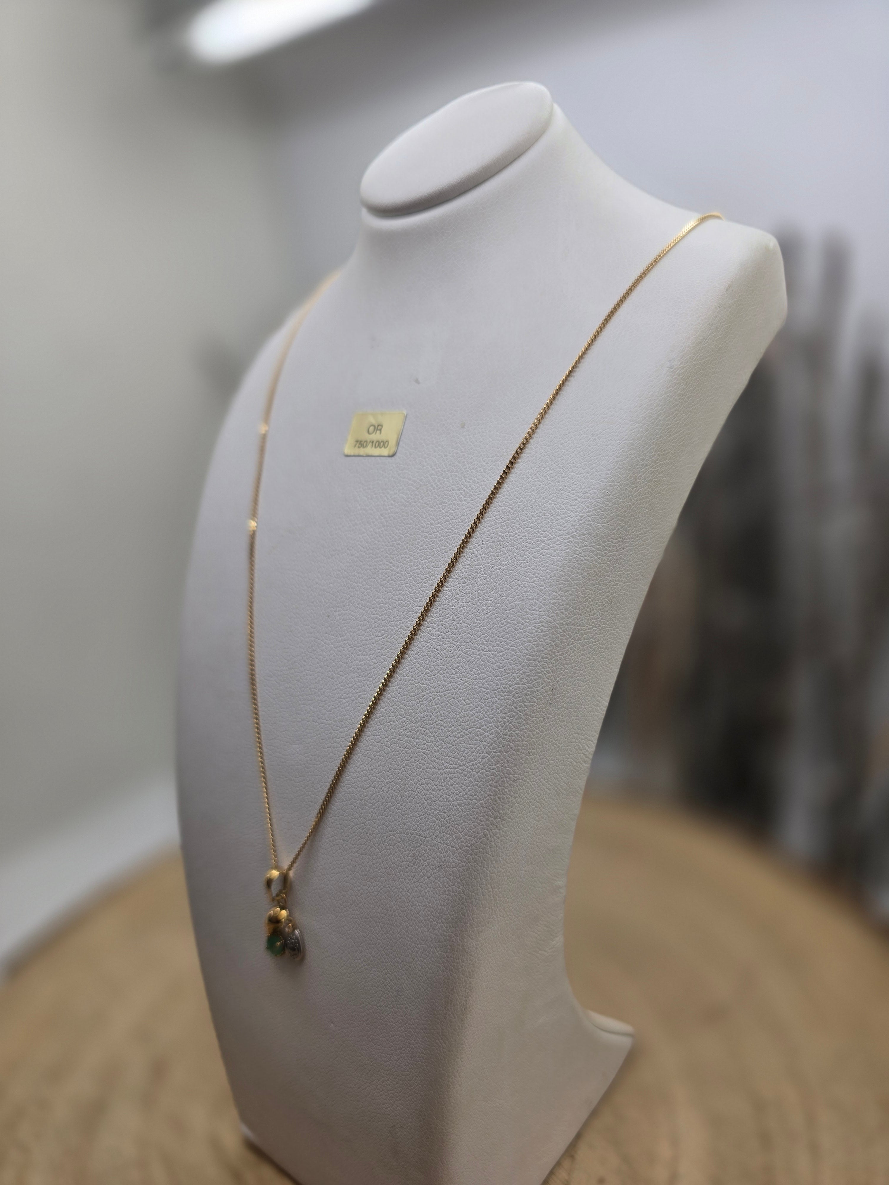 Collier matinée en or jaune 18 carats (titrage 750, poinçon 750) possède une maille anglaise. Il mesure 19 cm de long, avec une largeur et une épaisseur très fines de 0,01 mm, pour un poids de 2,31 grammes. Le fermoir est de type anneau ressort. Il est orné d’un petit oxyde de zirconium vert et se trouve en très bon état.