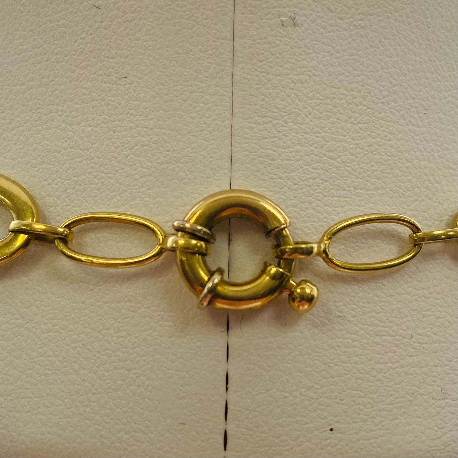 Collier de type matinée en or jaune 18 carats (750/1000), poinçonné "750", présentant une maille originale au design affirmé. D’une longueur de 46 cm, il offre une belle présence avec sa largeur de 1 cm et son épaisseur de 2 mm. Fermoir bouée pratique et sécurisé. Sans pierres, il pèse 16,02 grammes. Très bon état, idéal pour une touche d’élégance au quotidien.