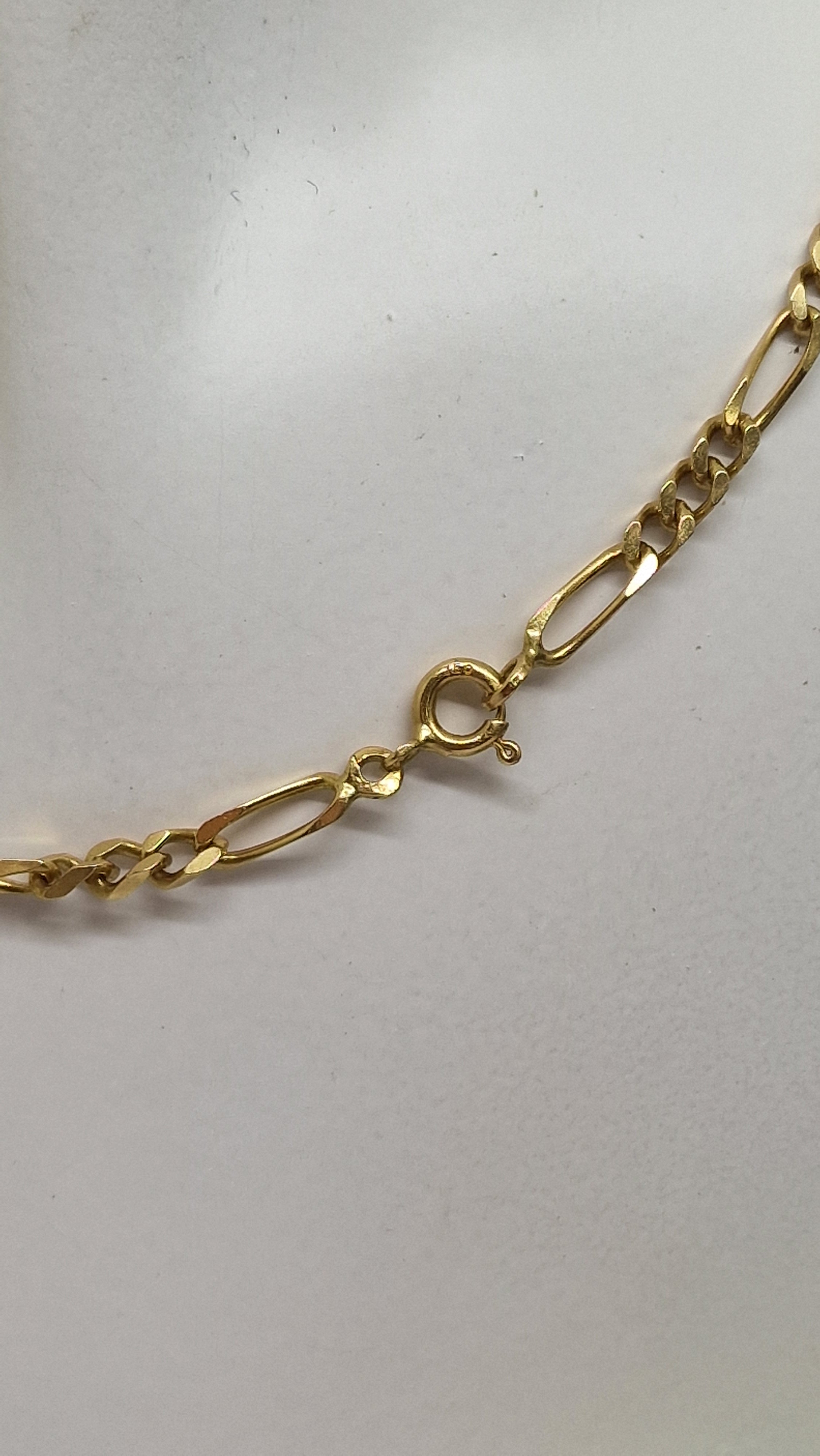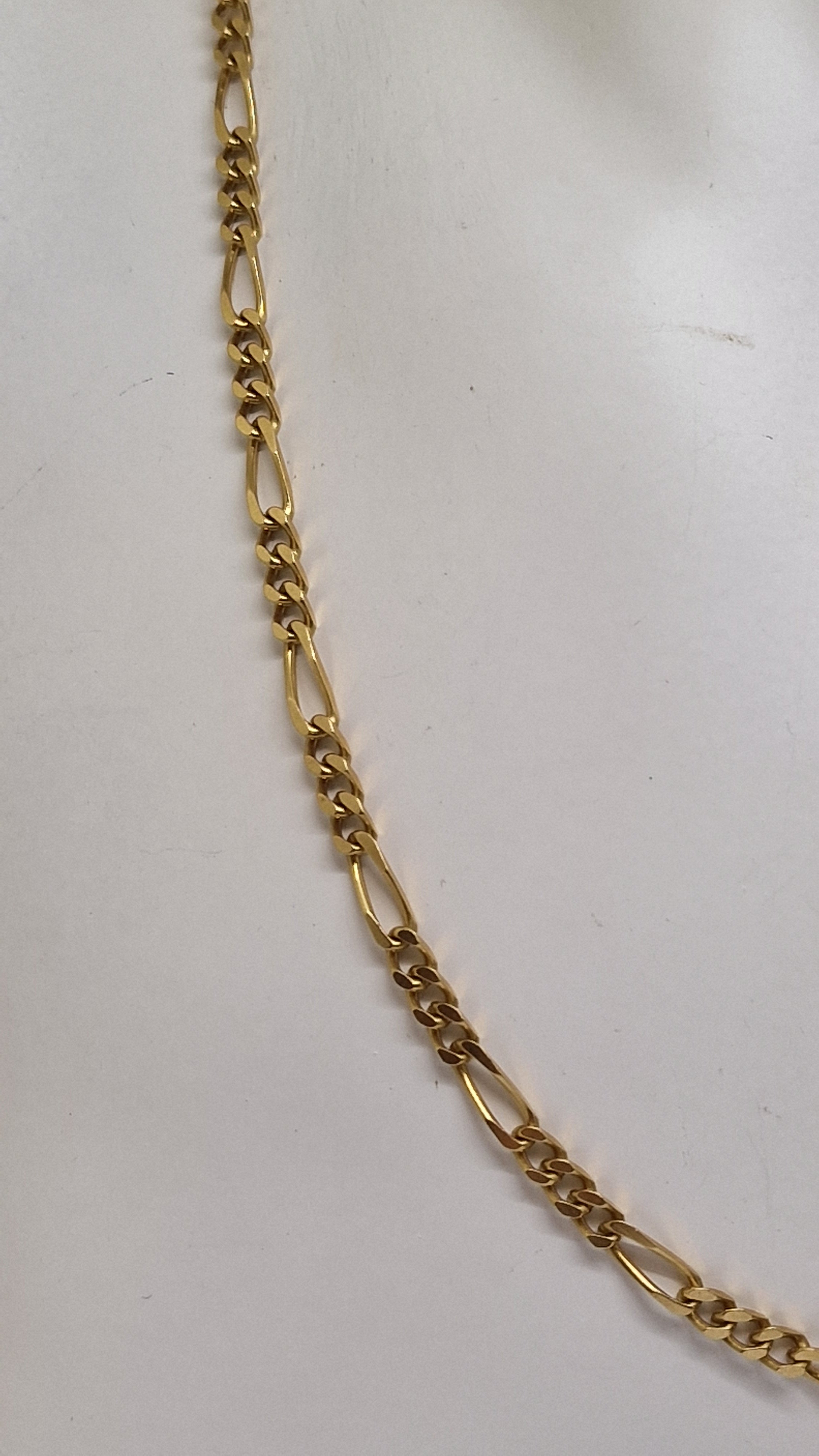 Collier matinée en or jaune 18 carats (750/1000), maille Figaro, poinçonné 750 avec tête d’aigle. Longueur : 56 cm ; largeur : 4 mm ; épaisseur : 1 mm. Poids : 16,20 g. Fermoir à anneau‑ressort. Sans pierre. Très bon état.