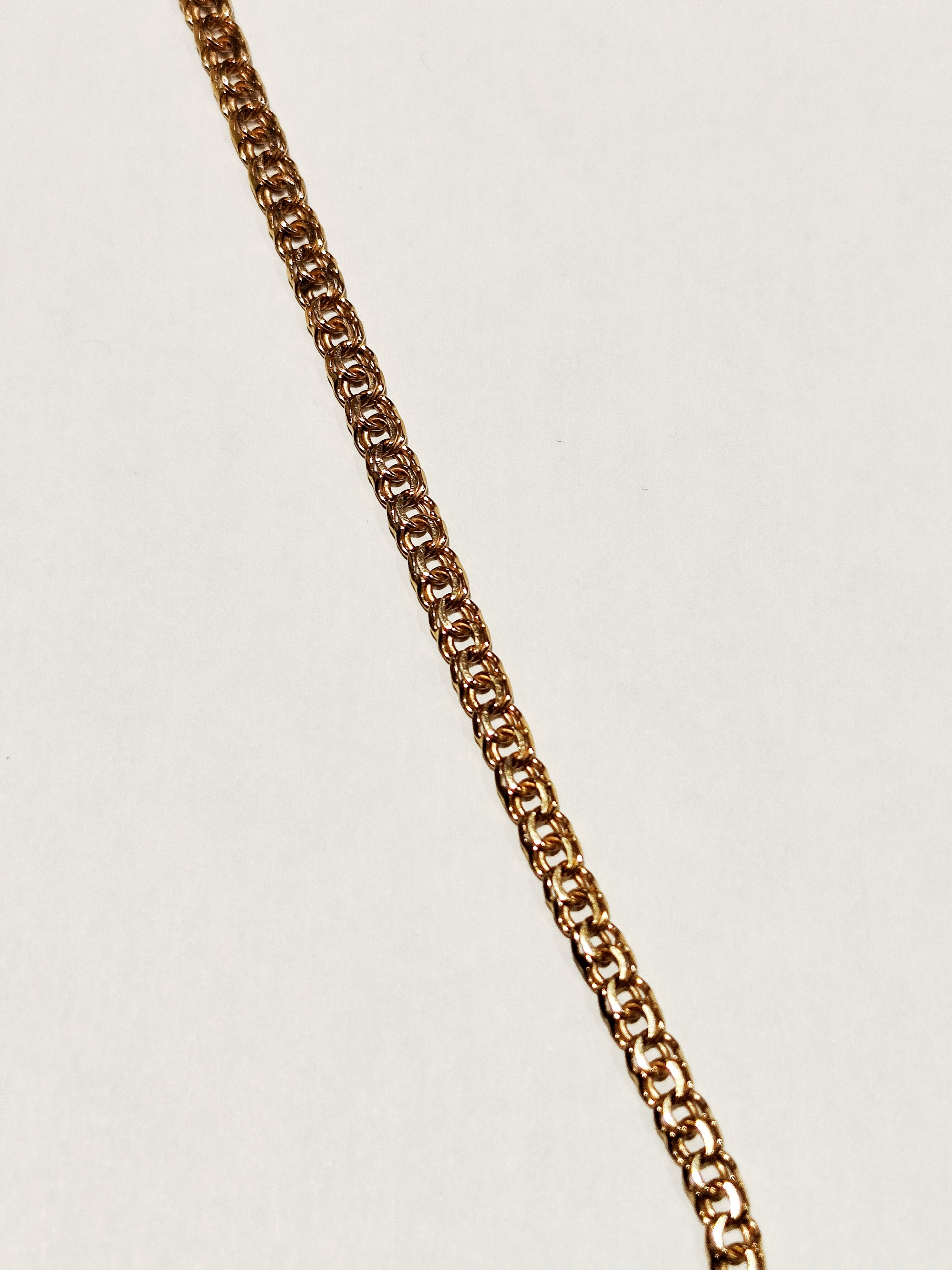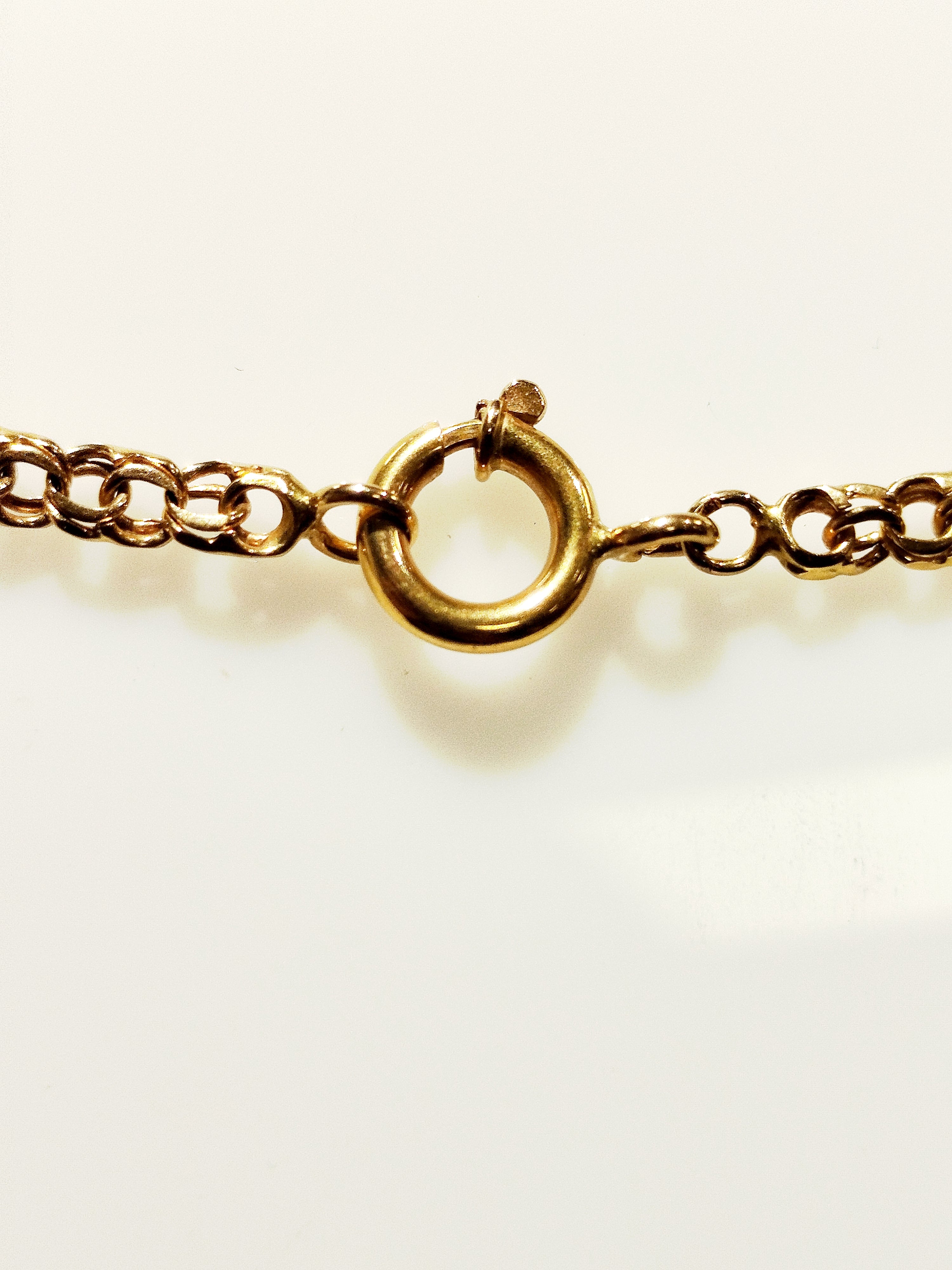 Collier de type matinée, en très bon état, est confectionné en or jaune 18 carats (750/1000) avec une élégante maille royale. Il pèse 16,02 grammes et mesure 60 cm de longueur, avec une largeur et une épaisseur de 0,03 cm. Il est équipé d’un fermoir à anneau ressort et ne contient aucune pierre.