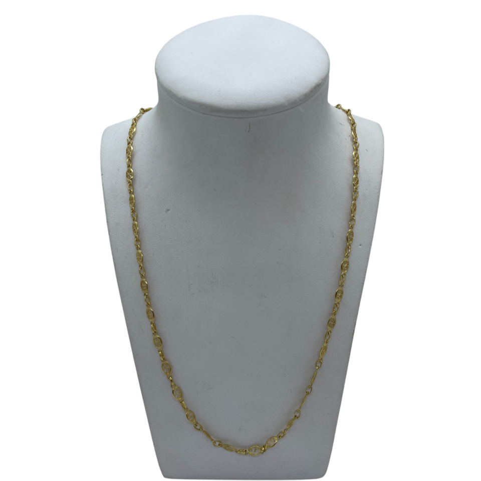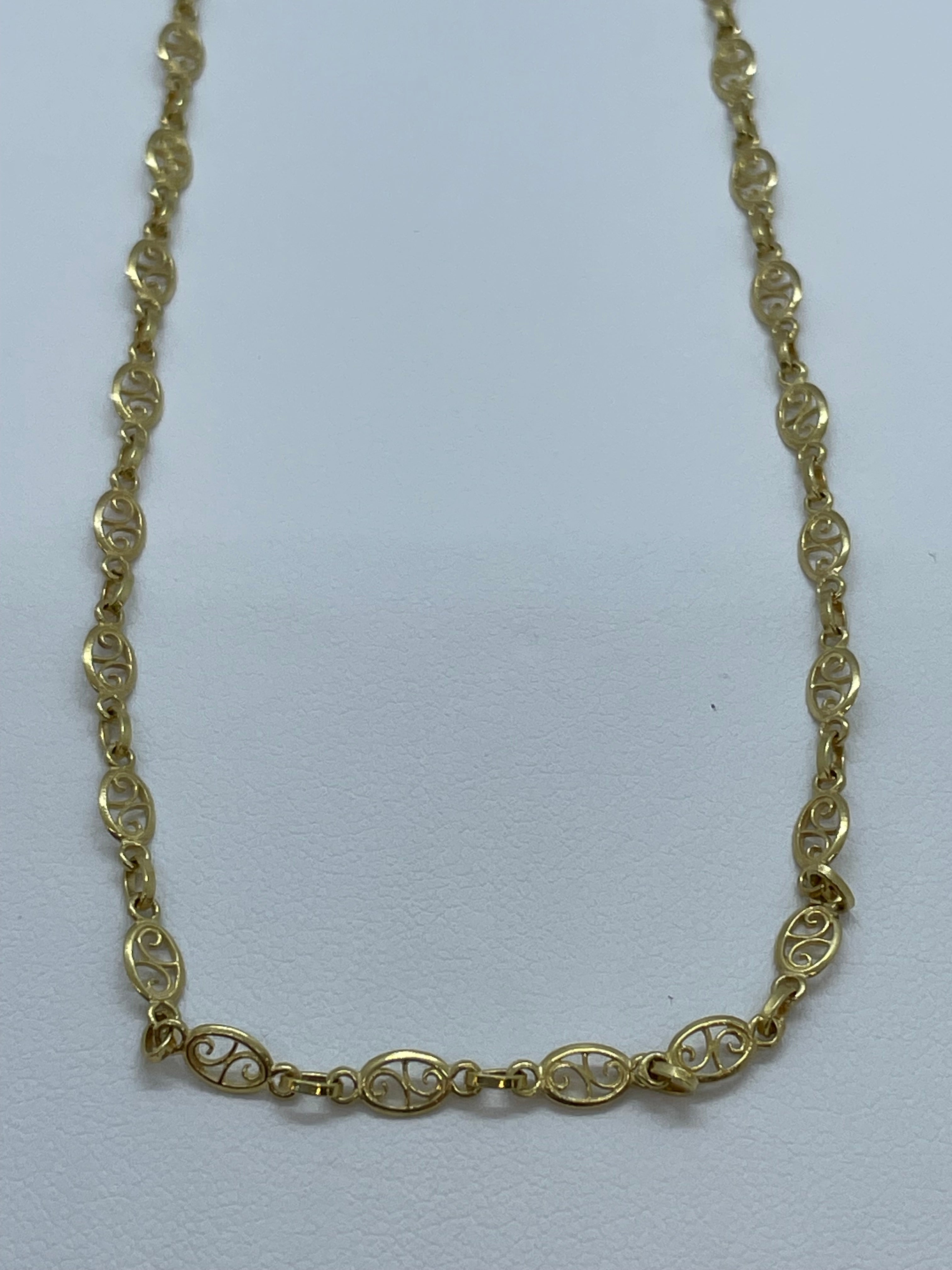 Collier ras du cou en or jaune 18 carats (750/1000) . Il mesure 45,5 cm de longueur, avec une largeur de 3 mm et une épaisseur de 1 mm, pour un poids total de 7,29 grammes. Doté d’un fermoir à anneau ressort et poinçonné 750, ce collier est en bon état général.