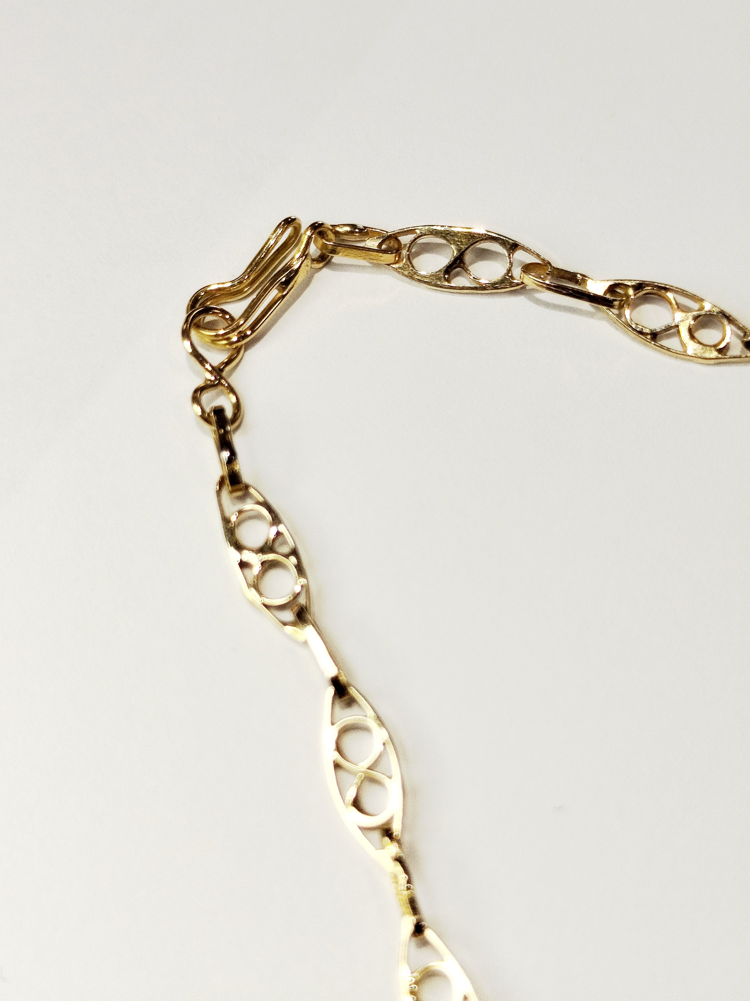 Collier de type princesse en or jaune 14 carats (585/1000), sans poinçon, en très bon état. Il présente une maille filigrane délicate et raffinée, ornée d’oxyde de zirconium pour une touche de brillance discrète. Le collier mesure 46 cm de long, avec une largeur de 0,5 mm et une épaisseur fine de 0,01 mm, pour un poids de 19,03 grammes.