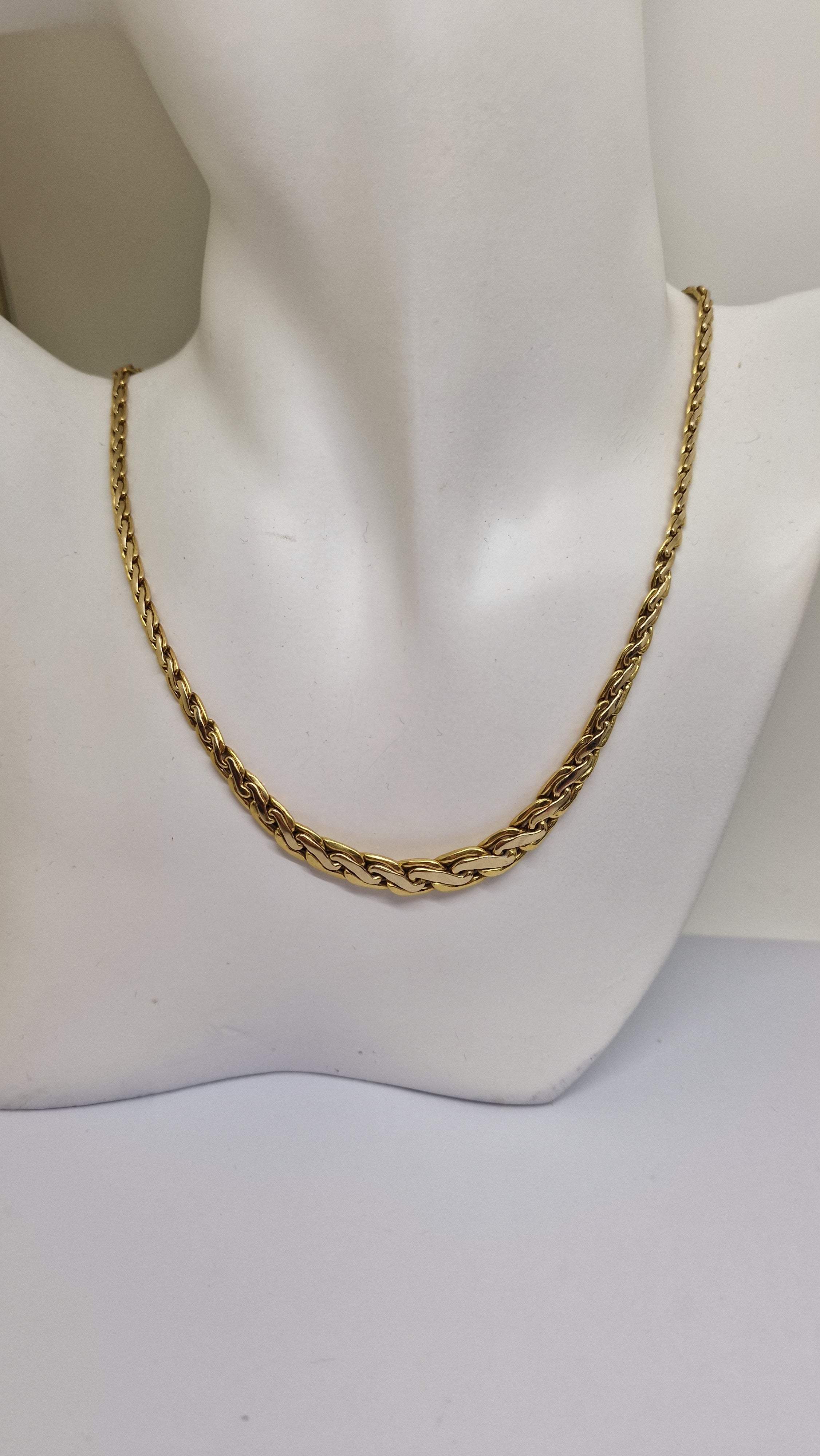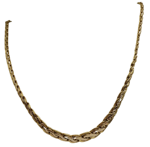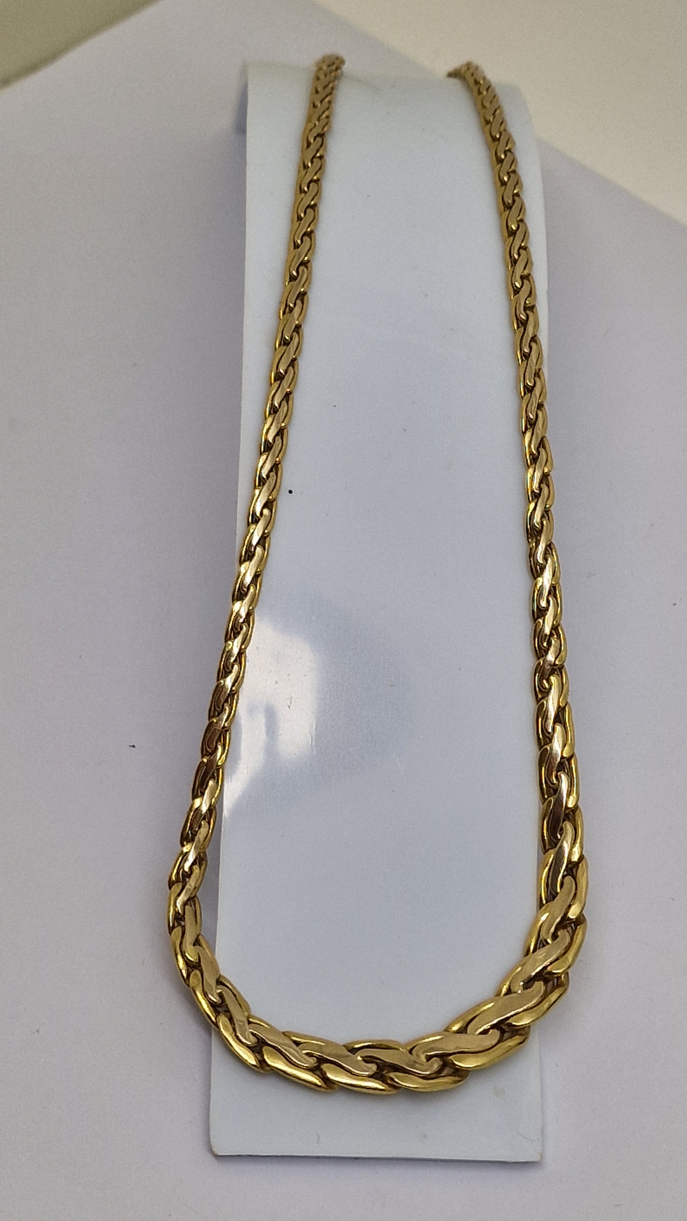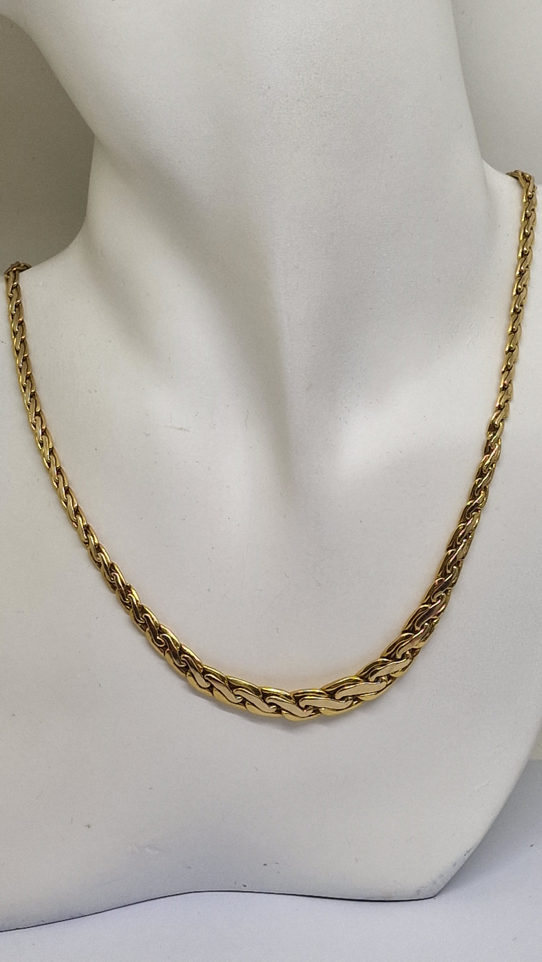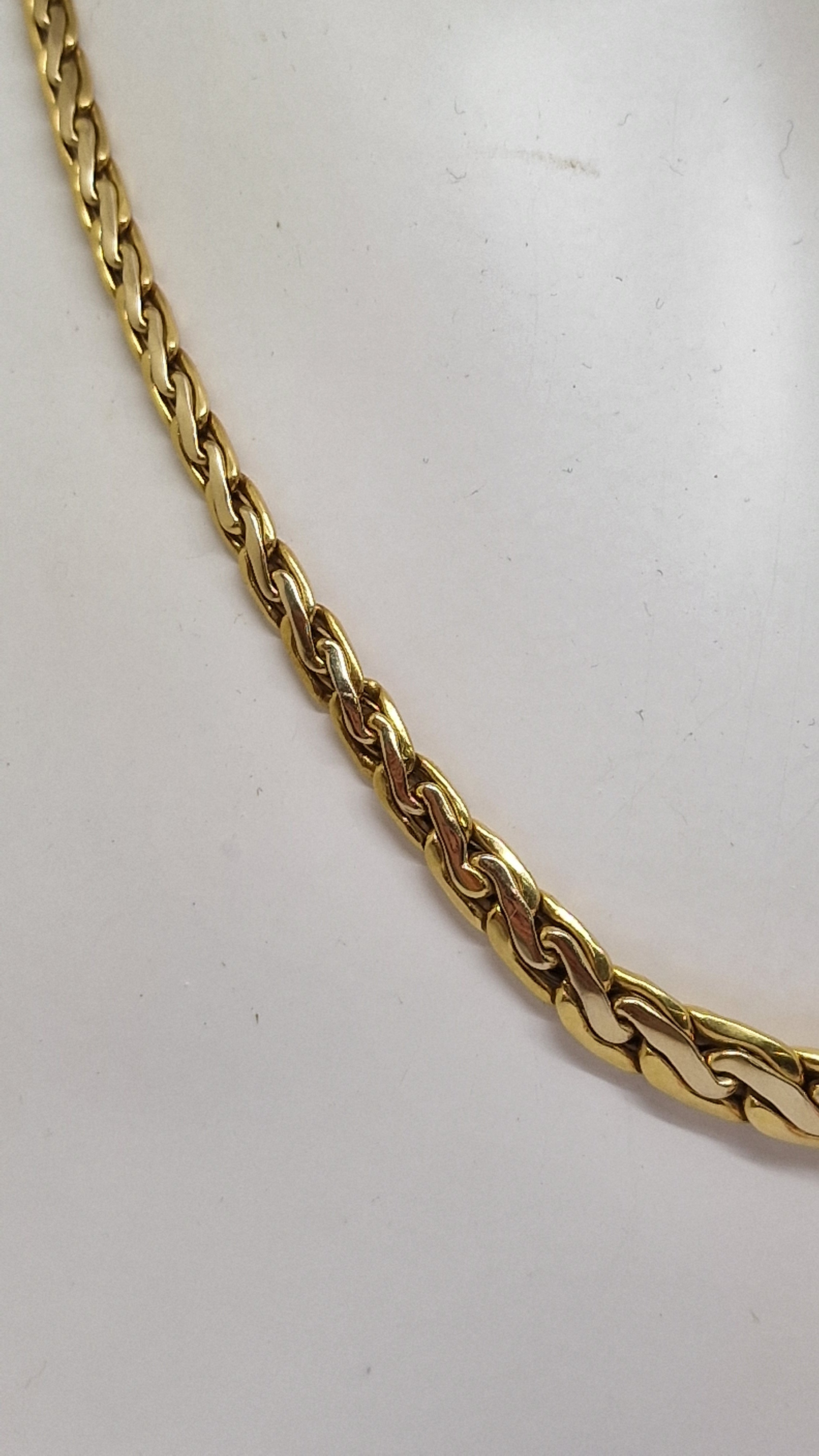 Collier de type princesse en or jaune 18 carats (750/1000), poinçonné tête d’aigle, en très bon état. Il est composé d’une maille haricot au design original, avec une longueur de 45 cm, une largeur de 4 mm et une épaisseur de 2 mm, pour un poids de 12,94 grammes. Ce modèle sans pierres est équipé d’un fermoir mousqueton assurant une fermeture fiable.