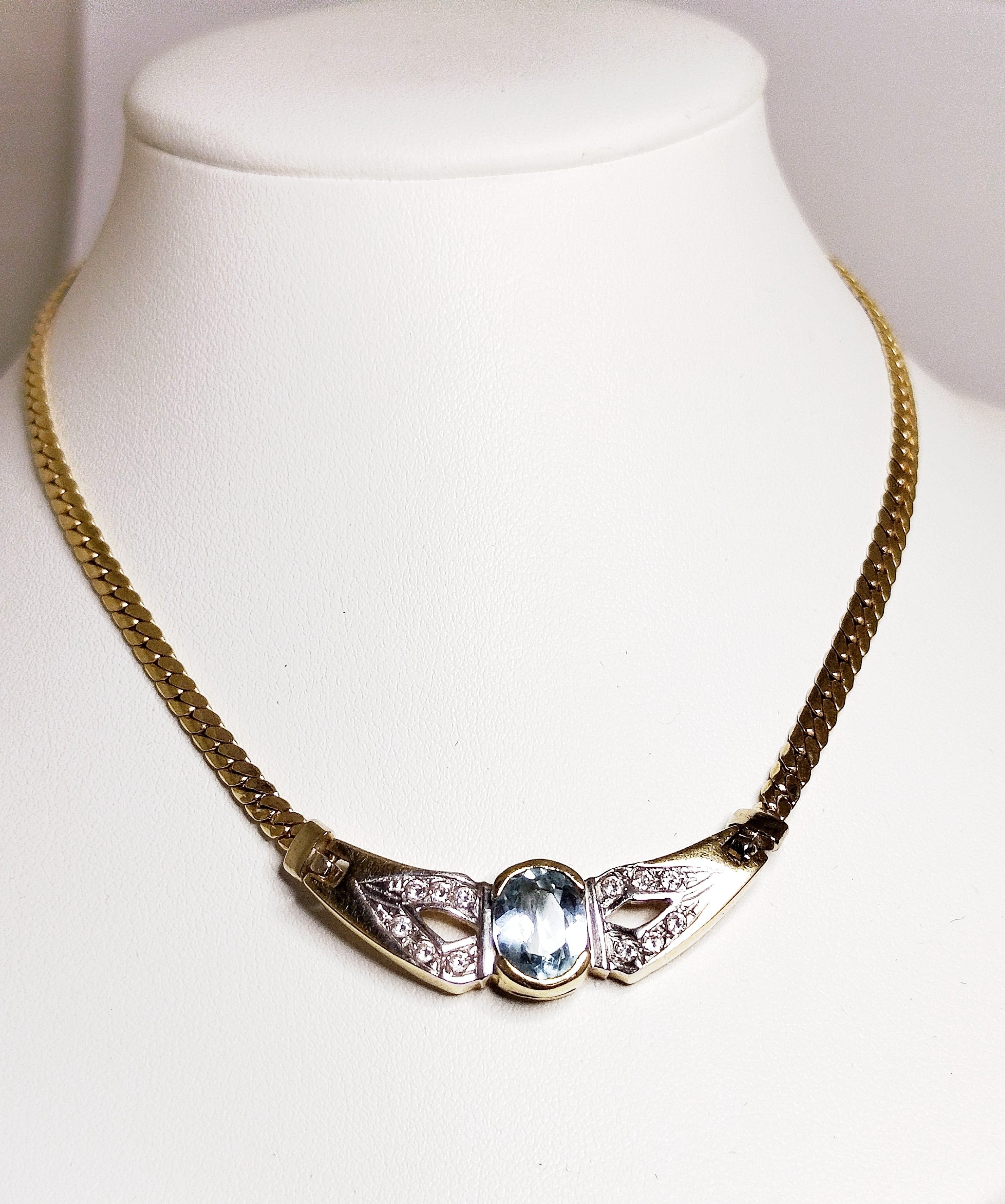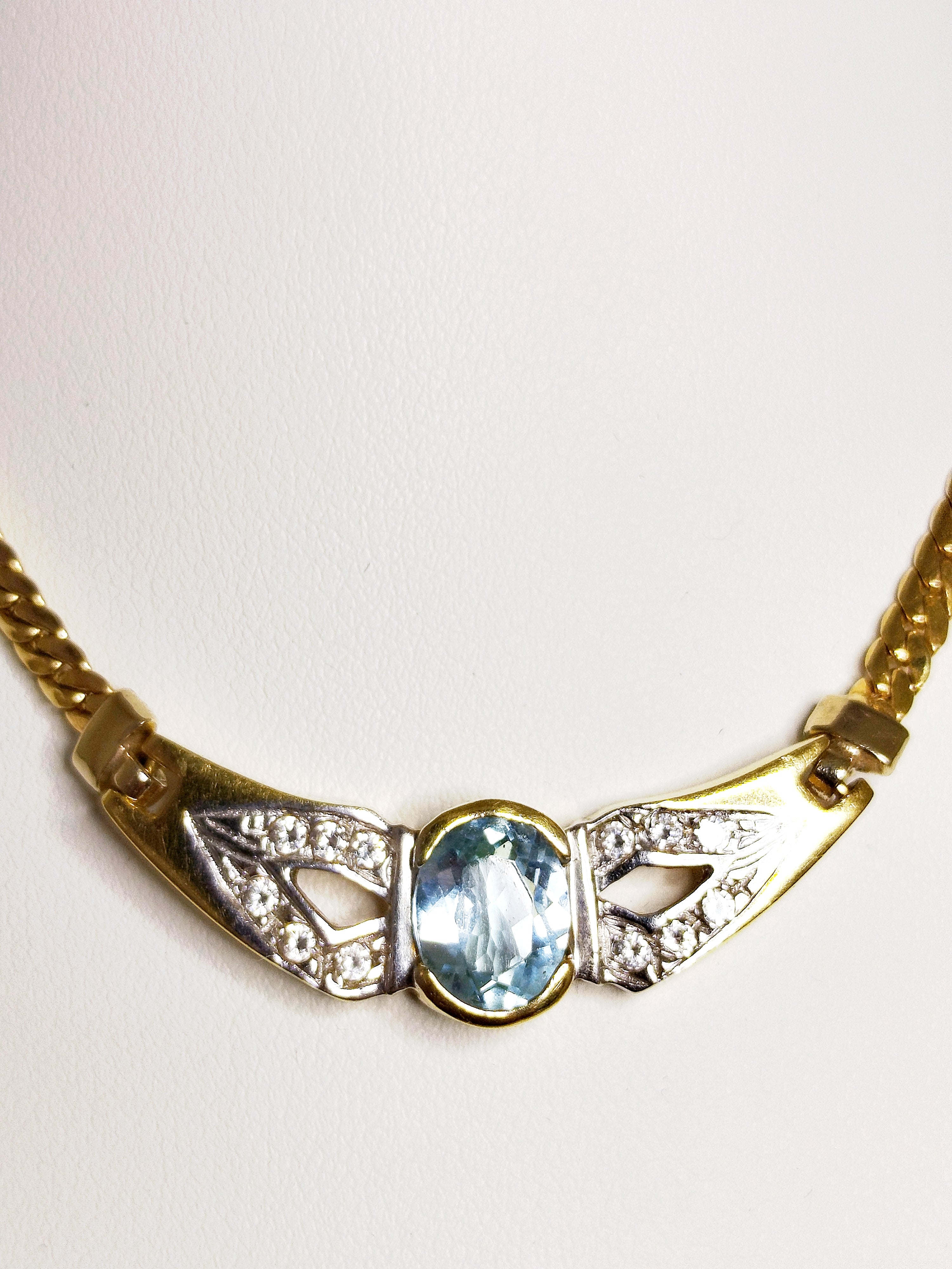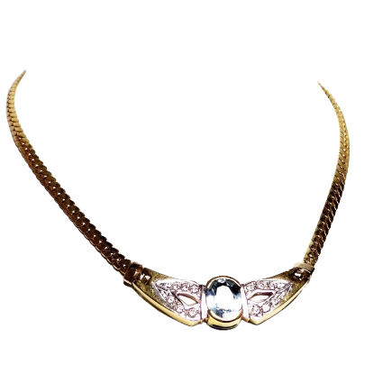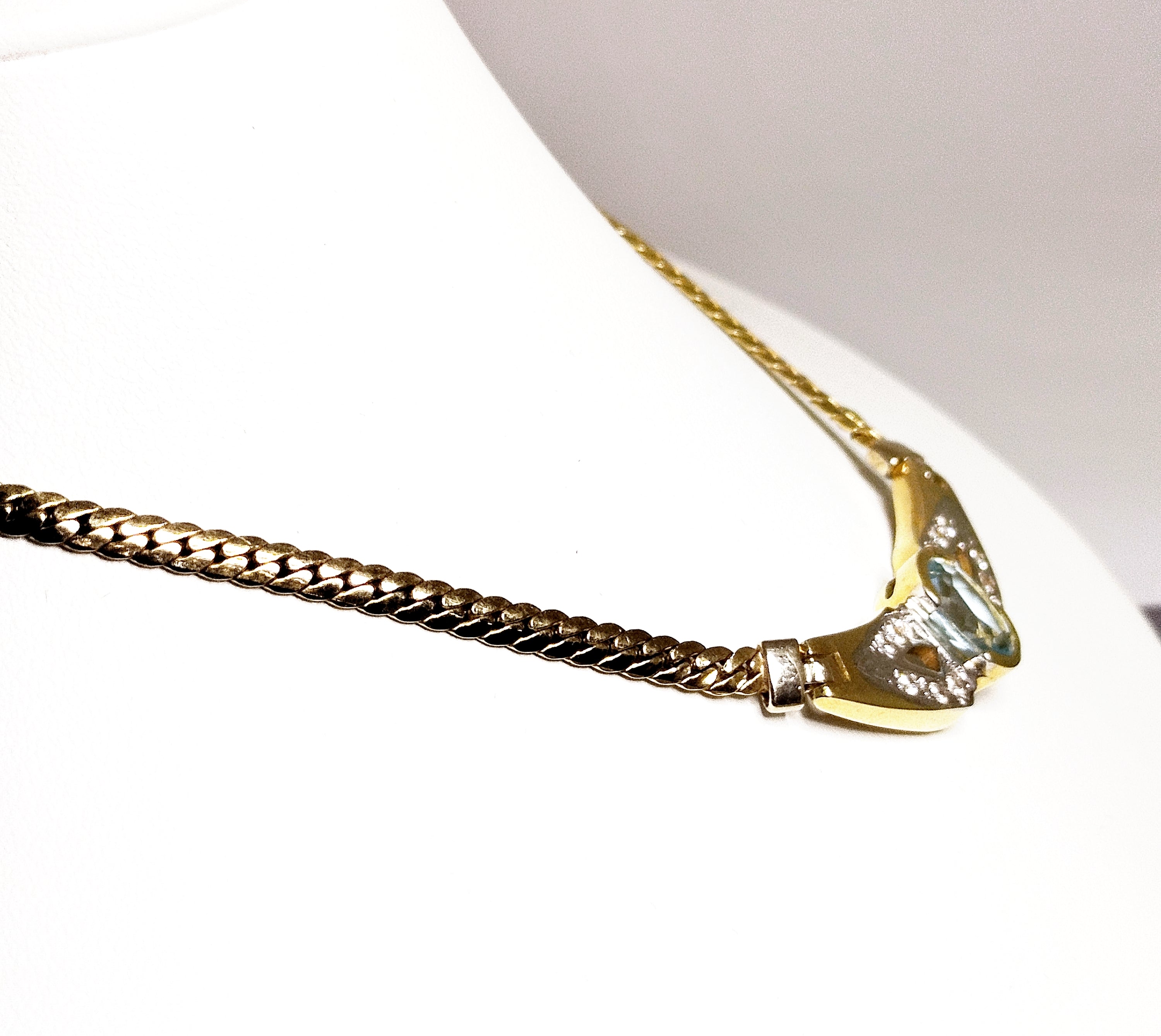 Collier de type Princesse en or jaune 18 carats (750/1000), poinçonné 750, en très bon état. Il est composé d’une maille anglaise fine et élégante, avec un fermoir mousqueton assurant une fermeture sécurisée. Le collier mesure 41 cm de long pour un poids de 10,30 grammes, et est orné d’une aigue-marine.tificat d'authenticité.