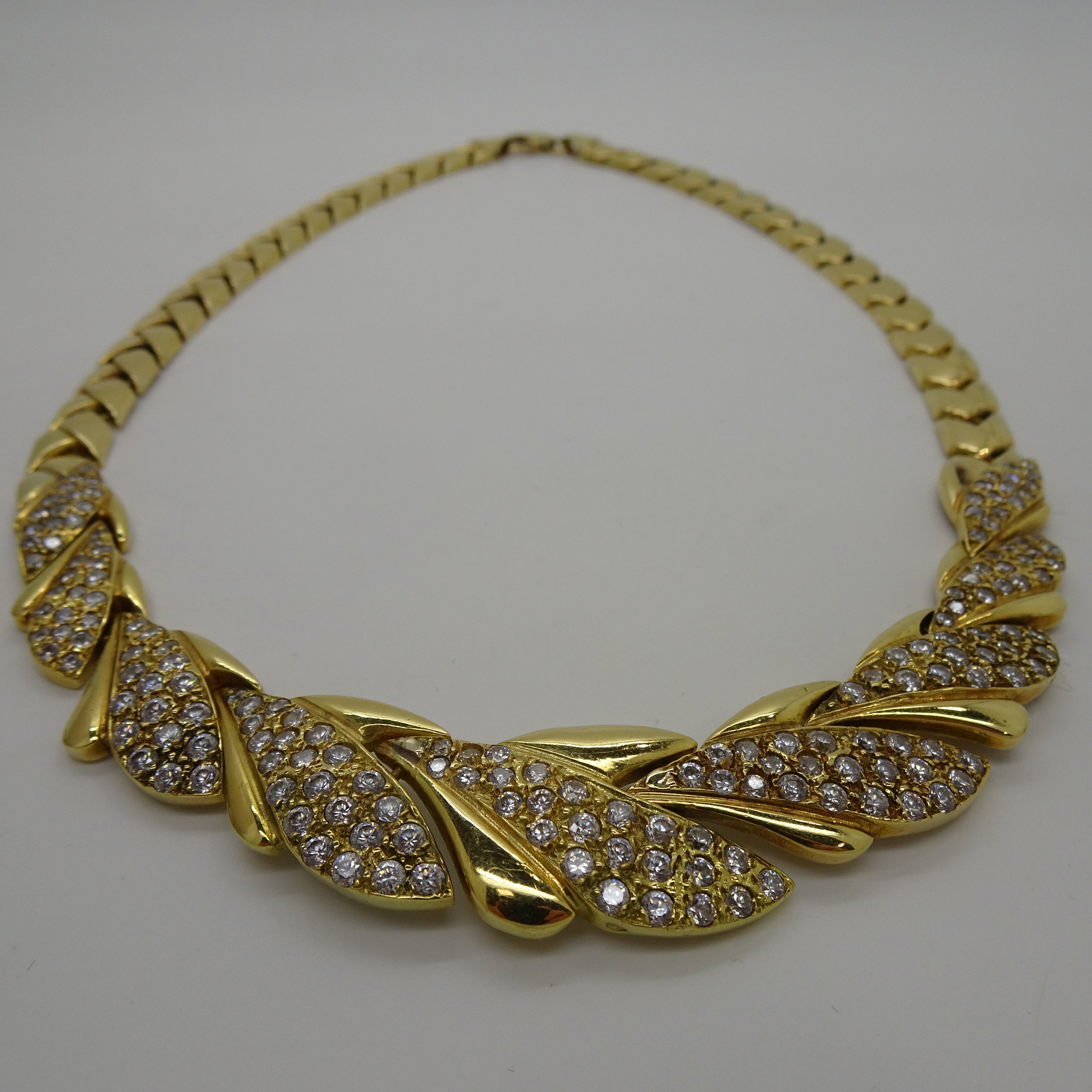 Collier princesse en or jaune 18 carats (750/1000), maille anglaise avec fermoir mousqueton. Longueur 40 cm, poids 55,84 g. Poinçonné tête d’aigle. Largeur jusqu’à 1,7 cm, épaisseur 2,7 mm. Orné d’un pavage d’oxydes de zirconium. En très bon état, pièce remarquable et lumineuse.