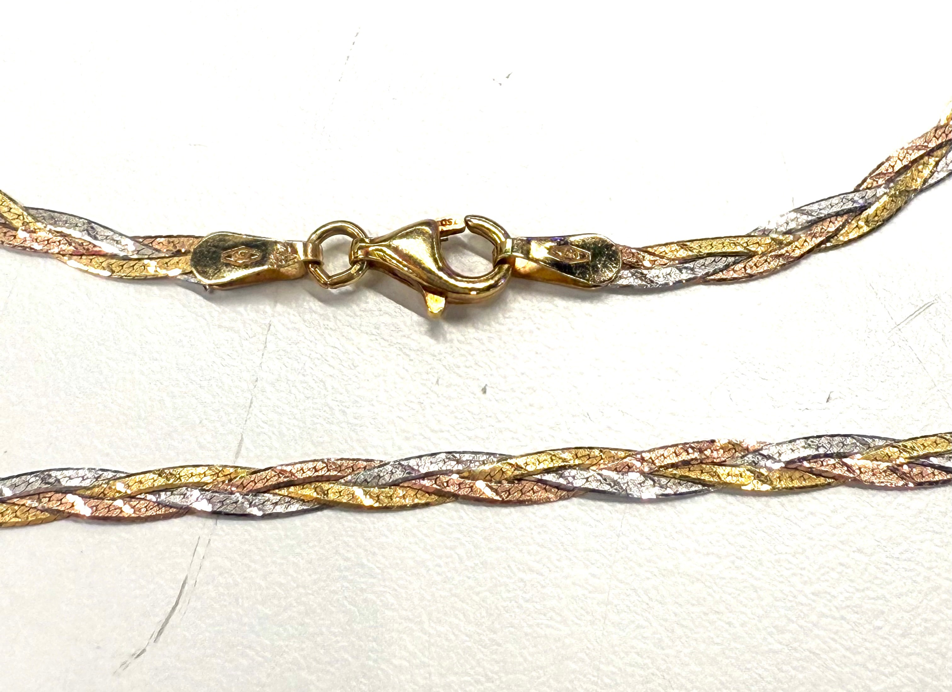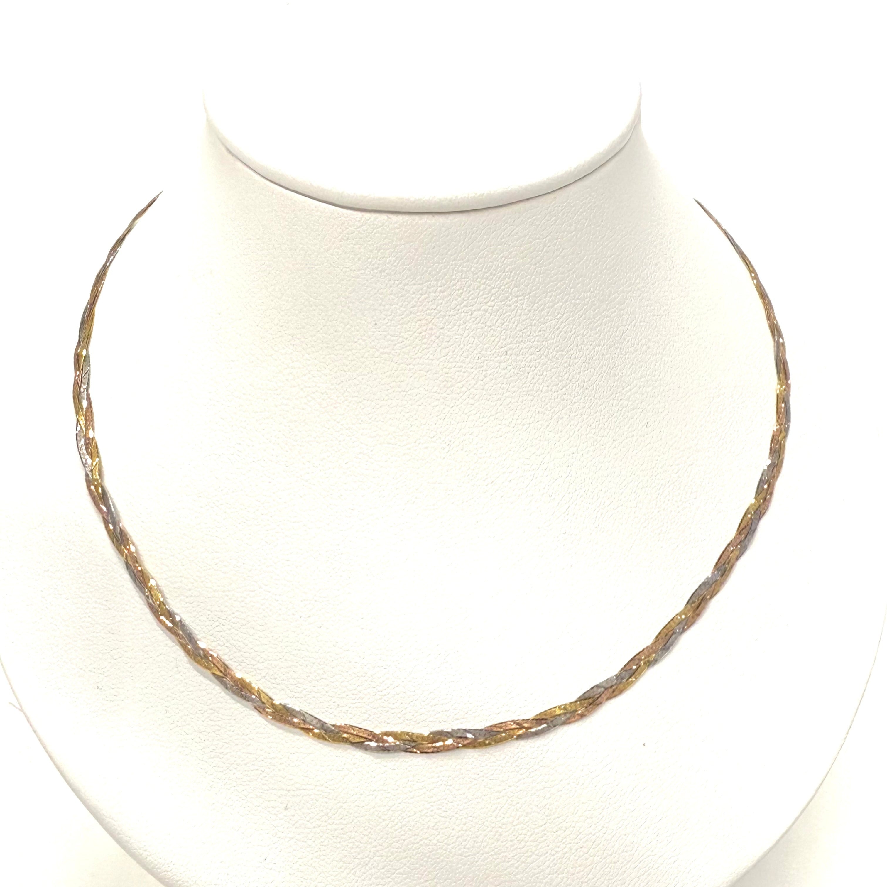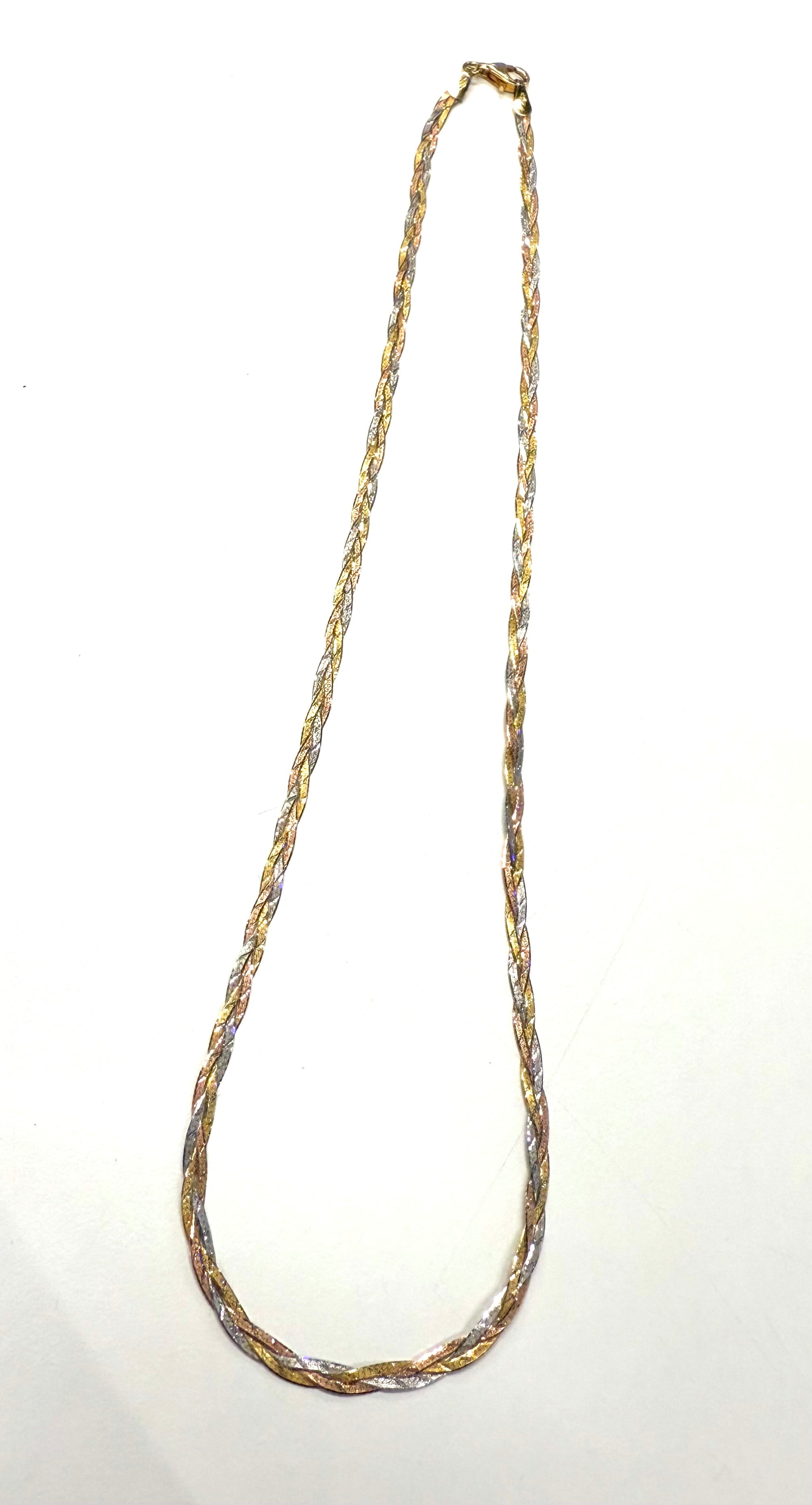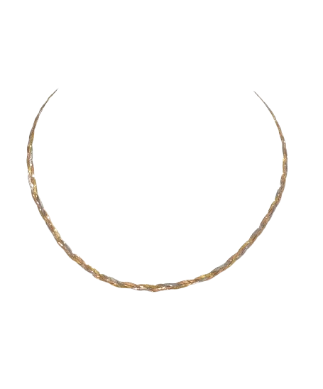 Collier ras du cou en or 18 carats (750/1000), composé d’or jaune, blanc et rose, et poinçonné 750. Il présente une maille tressée fine et délicate, avec une longueur de 42 cm, une largeur de 0,2 cm et une épaisseur de 0,1 cm. Fermé par un mousqueton discret, ce modèle sans pierres allie élégance et sobriété.