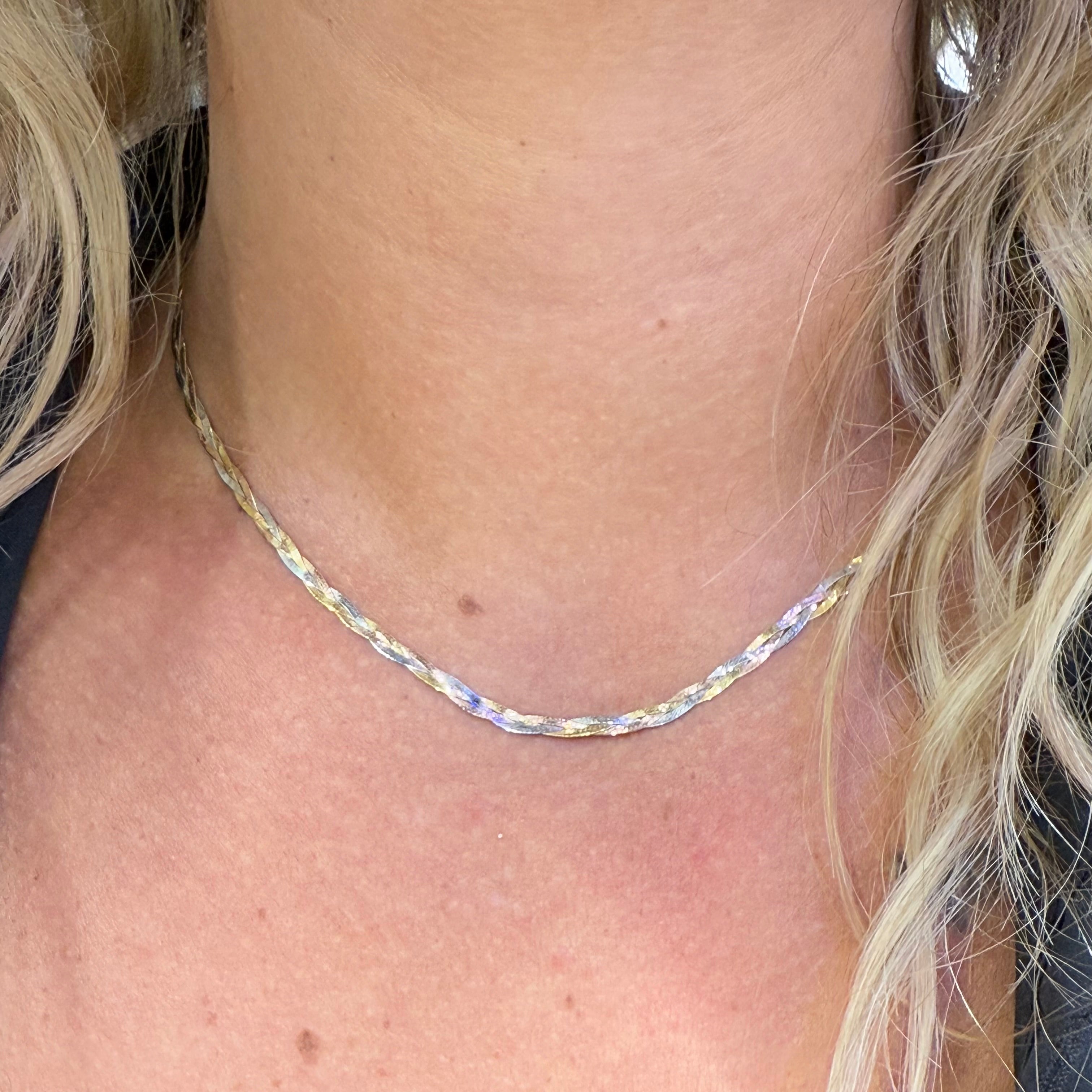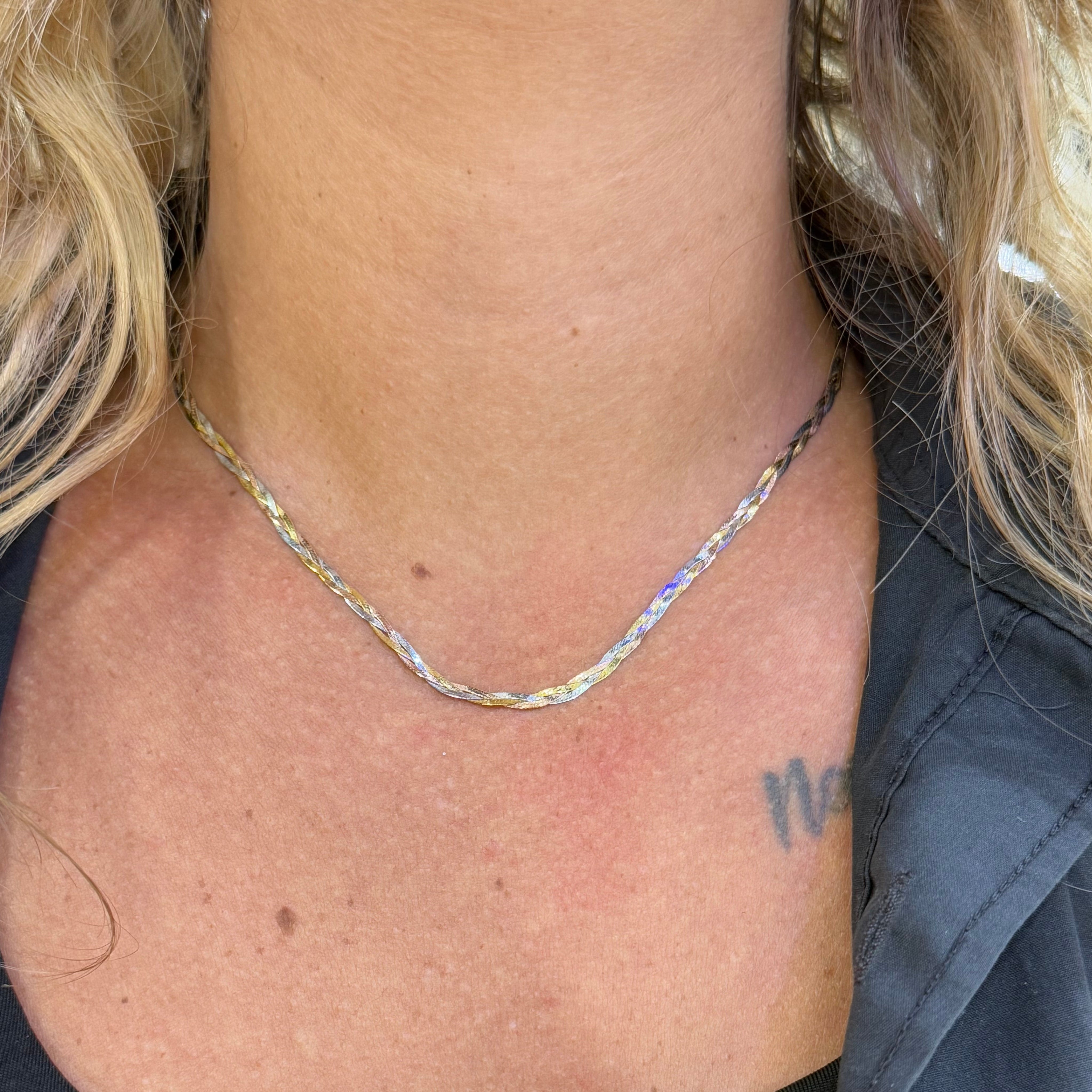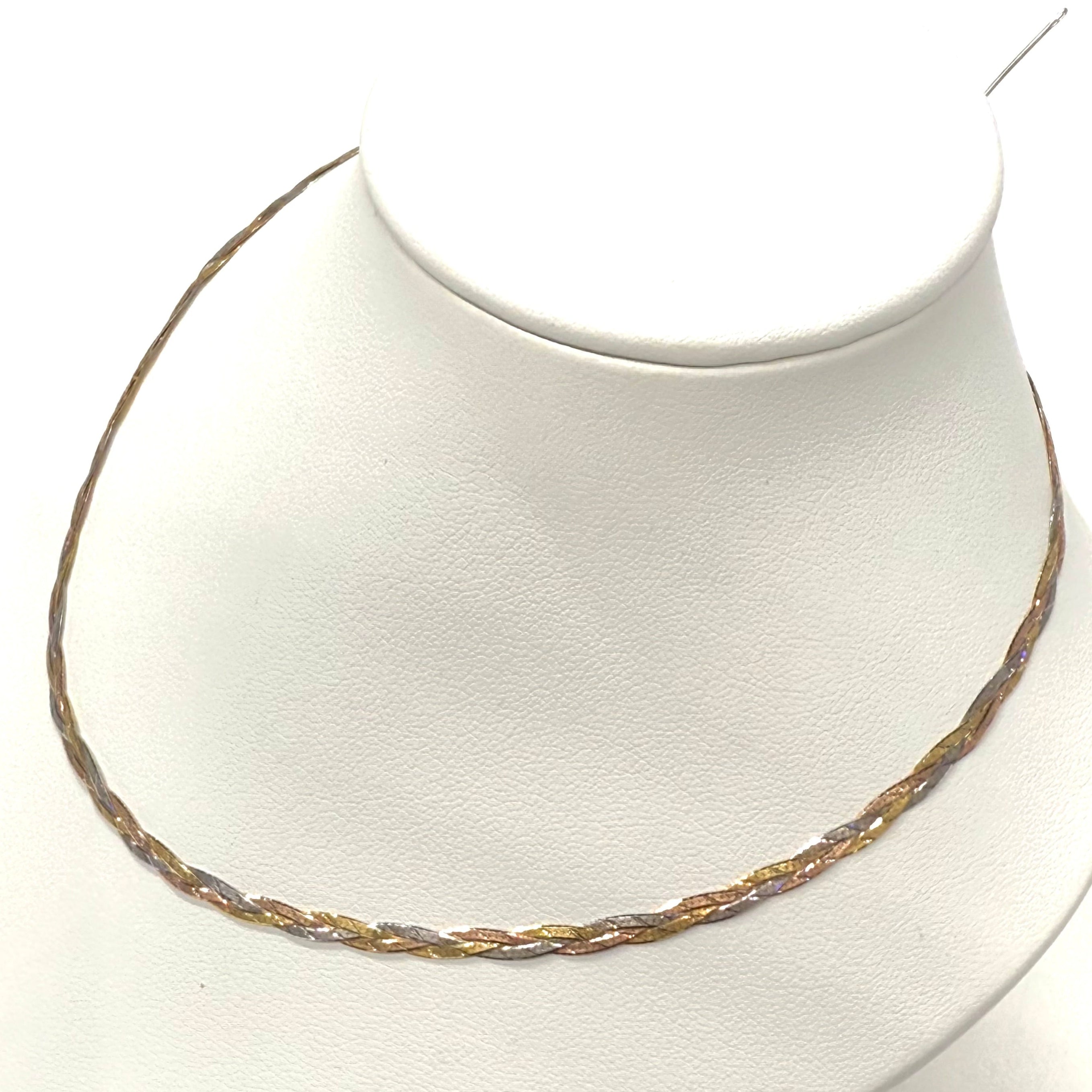 Collier ras du cou en or 18 carats (750/1000), composé d’or jaune, blanc et rose, et poinçonné 750. Il présente une maille tressée fine et délicate, avec une longueur de 42 cm, une largeur de 0,2 cm et une épaisseur de 0,1 cm. Fermé par un mousqueton discret, ce modèle sans pierres allie élégance et sobriété.