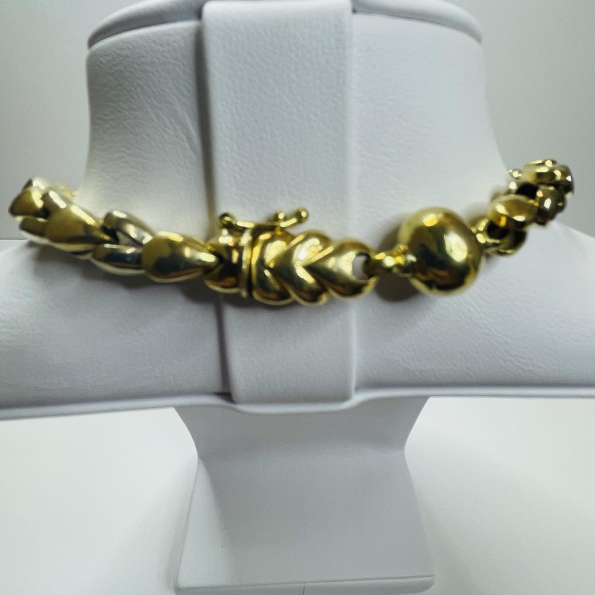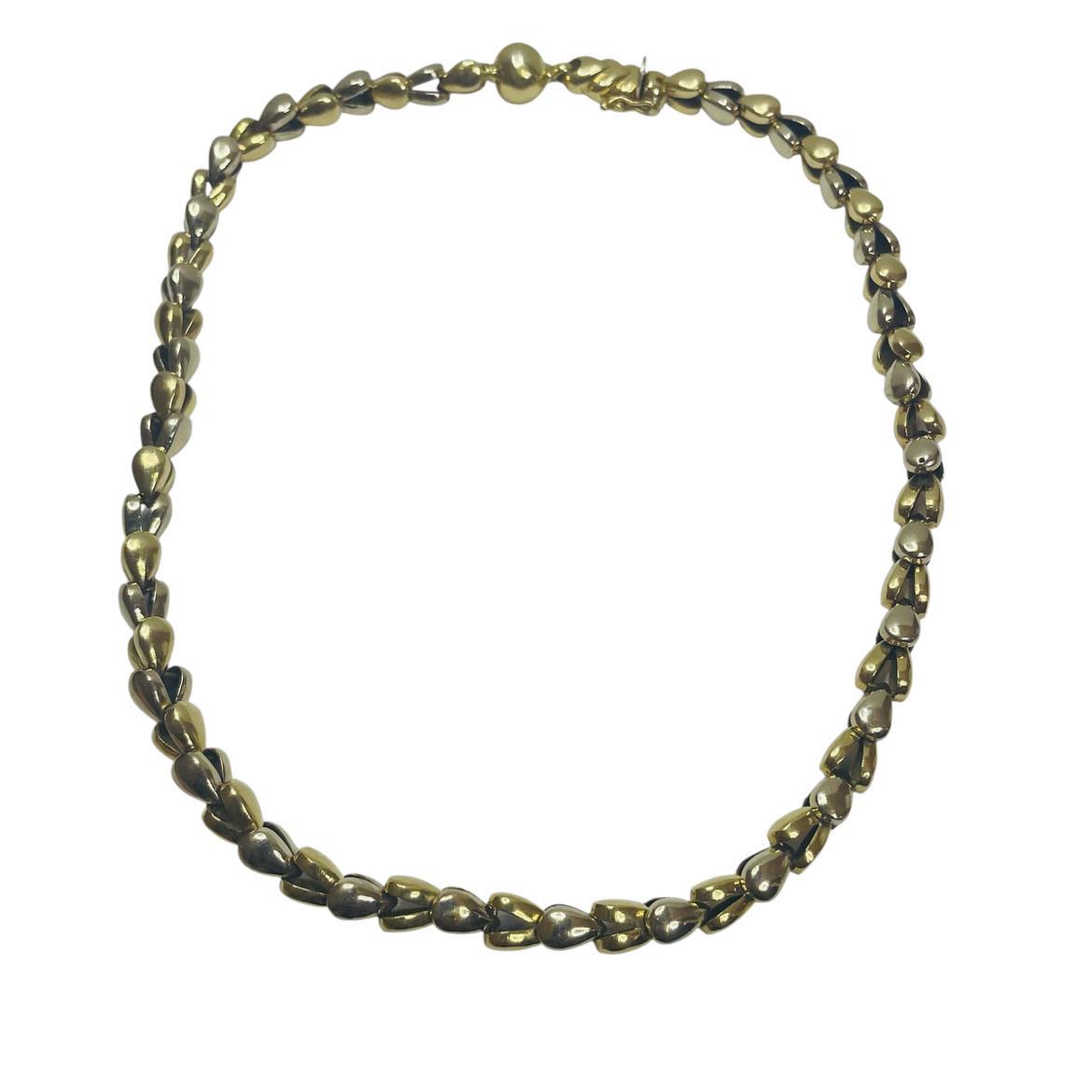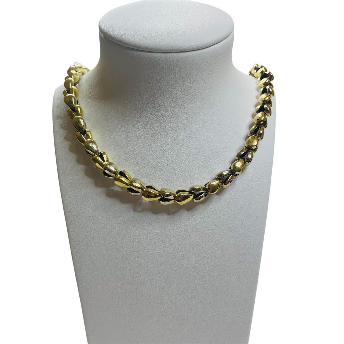 Collier ras du cou en or jaune 18 carats (750/1000) se distingue par sa maille gouttes au design élégant et structuré. Il mesure 44 cm de longueur, 6 mm de largeur et 10 mm d’épaisseur, pour un poids conséquent de 50,55 grammes. Doté d’un fermoir à cliquet sécurisé et poinçonné tête de loup, ce bijou est en bon état général.