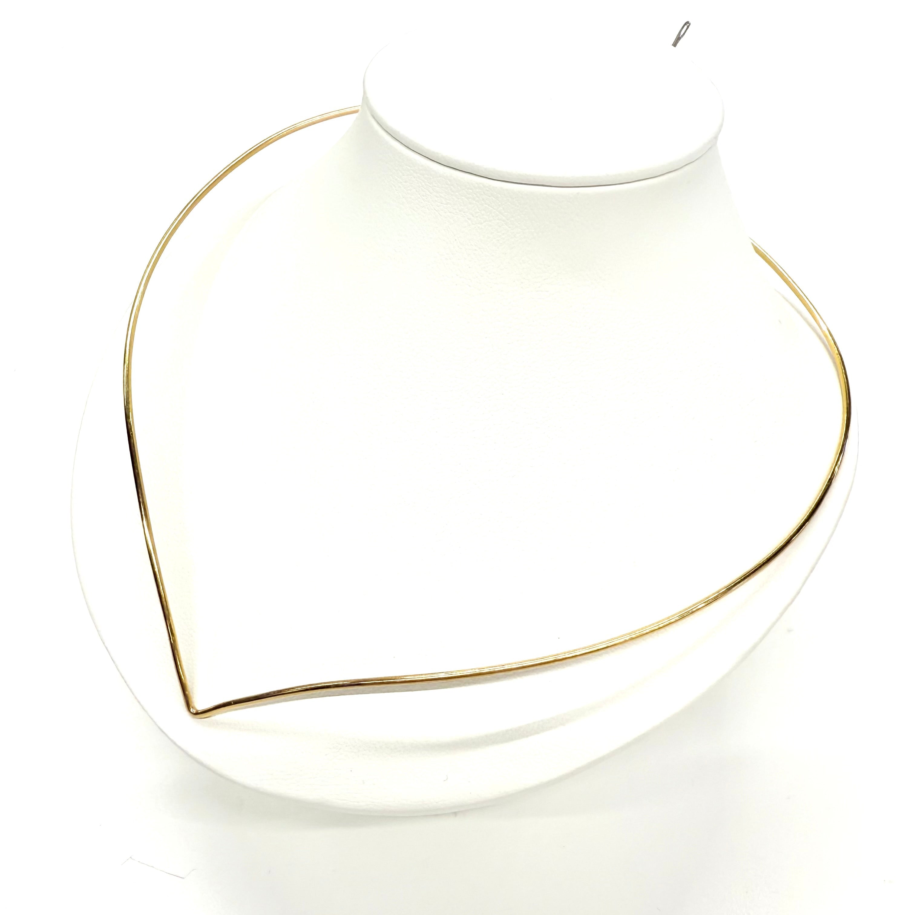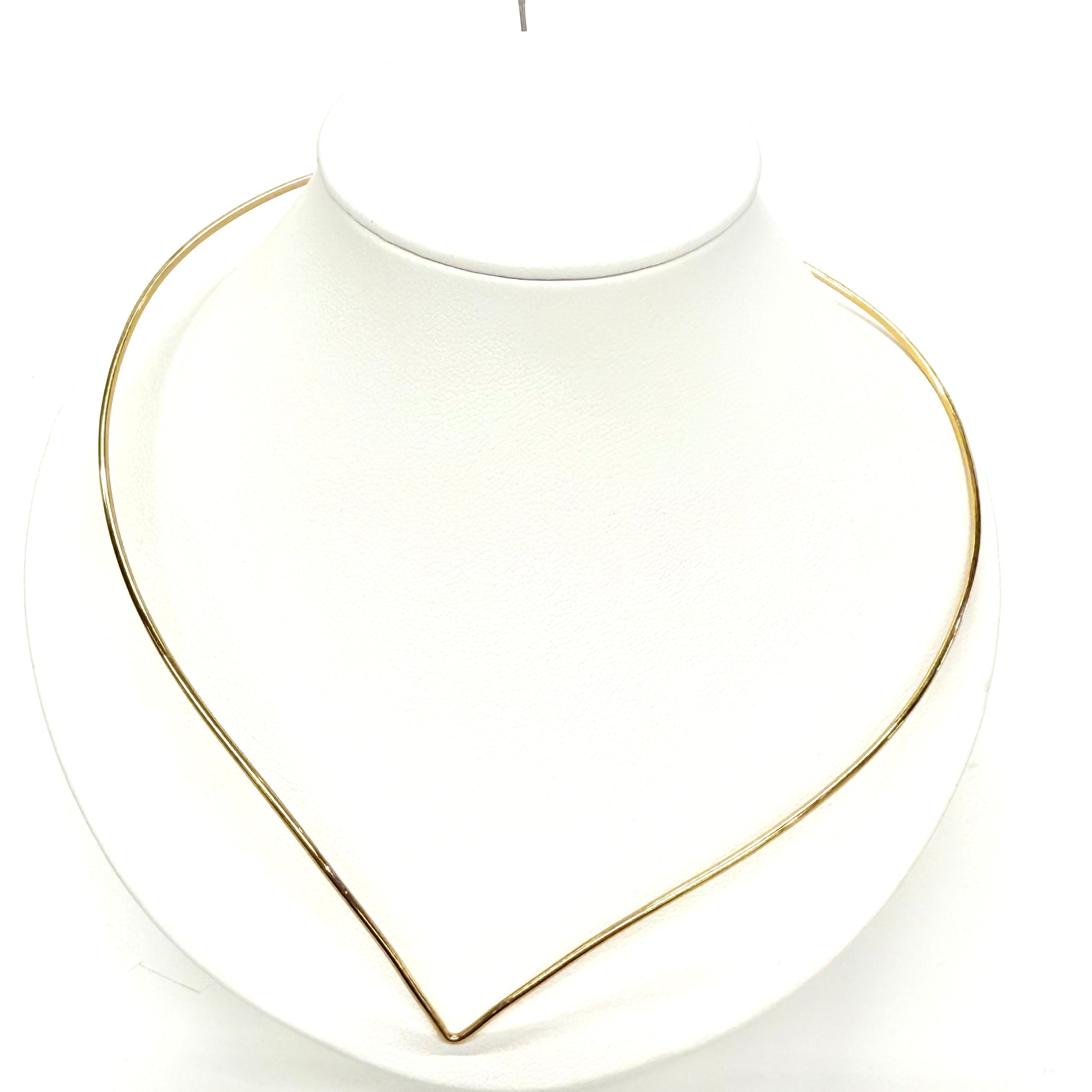 Collier ras du cou en or jaune 18 carats (750/1000) avec une maille câble délicate. Il présente un diamètre intérieur de 11,5 cm, avec une largeur et une épaisseur fines de 2 mm. Léger, ce bijou pèse 7,90 grammes. Il est équipé d’un fermoir crochet S et ne comporte pas de pierres ni de poinçon visible. Le collier est en très bon état.