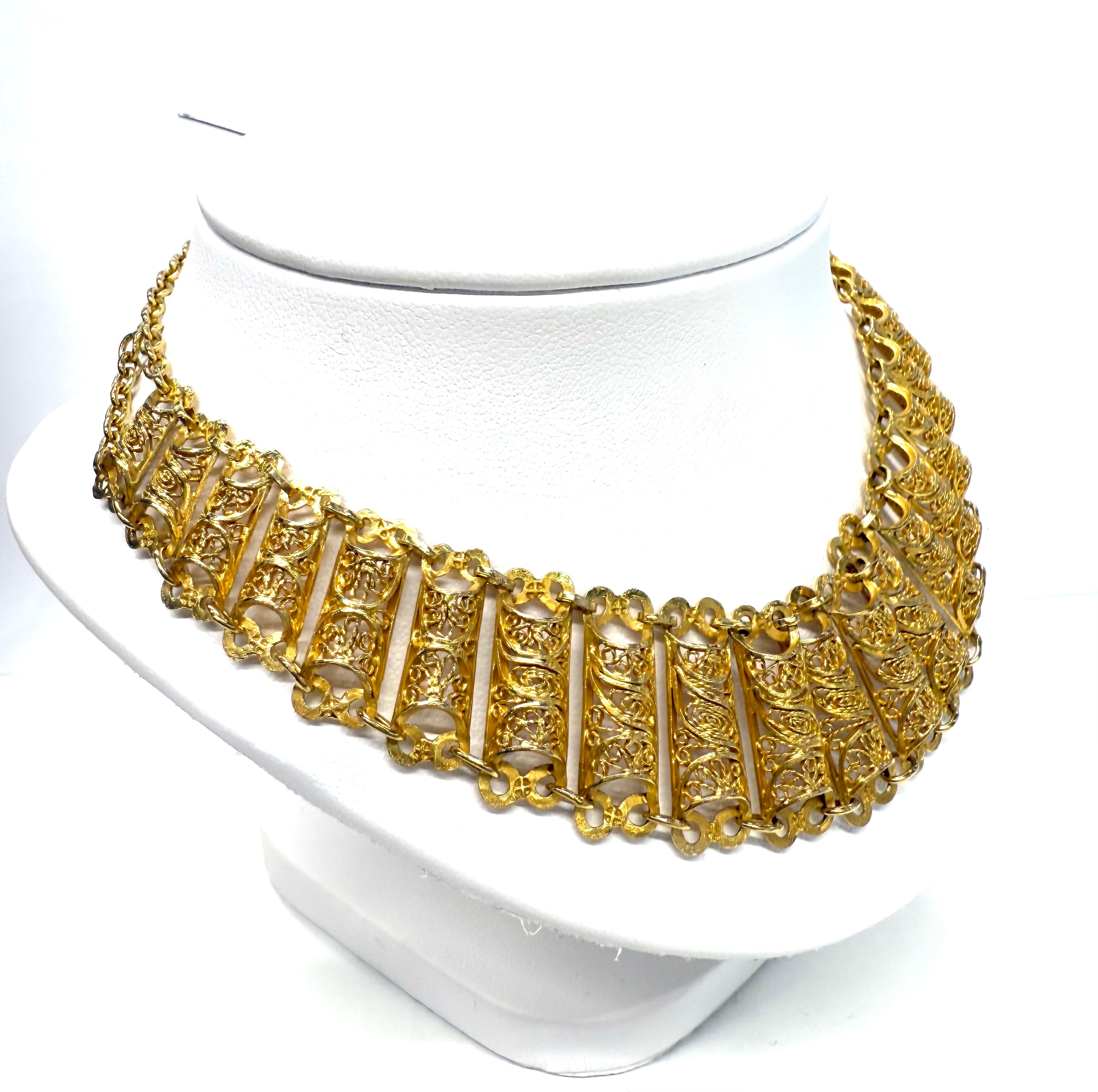 Collier ras du cou en or jaune 18 carats (750/1000), à maille fantaisie, sans poinçon, doté d’un fermoir en crochet S. Il pèse 42,78 g et mesure 45 cm de long. Sa largeur varie de 0,2 cm à 2,5 cm, pour une épaisseur de 0,3 cm. Sans pierre, ce bijou est en très bon état.